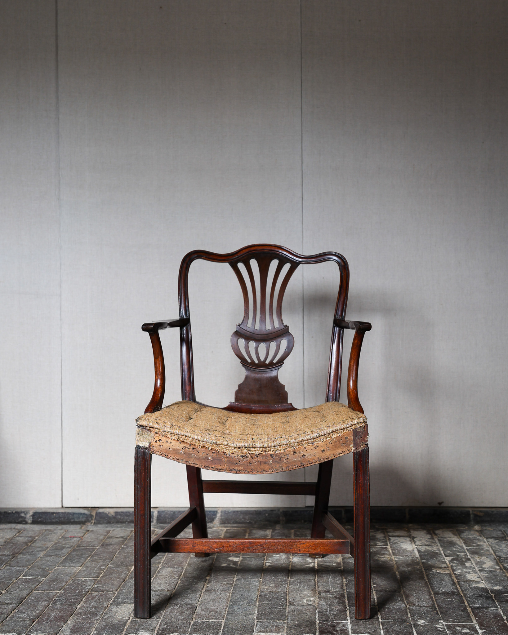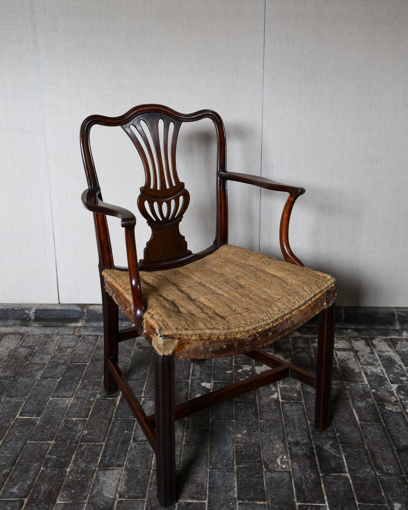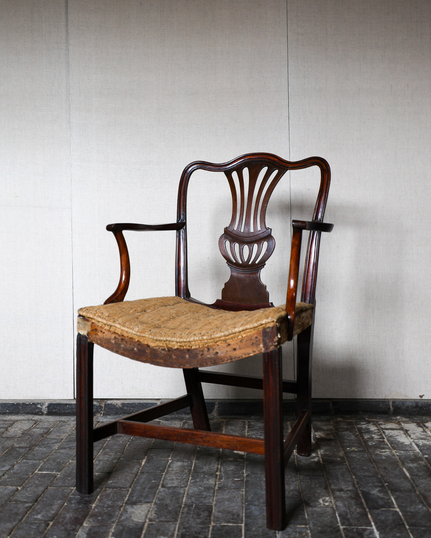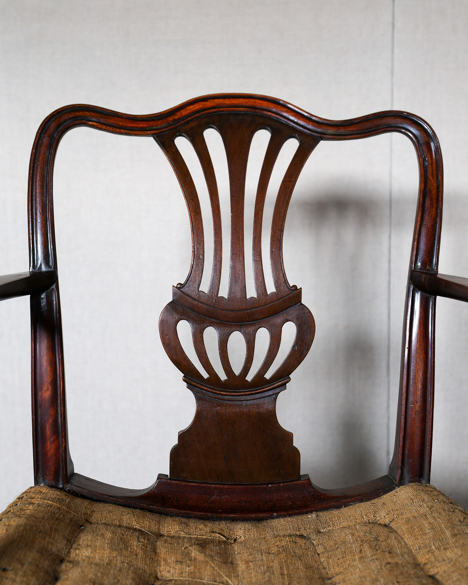 George III mahogany armchair of impressive grand scale, pierced back plate, elegant scrolled arms raised above scratch moulded supports and joined by stretchers. Circa 1790. £2800