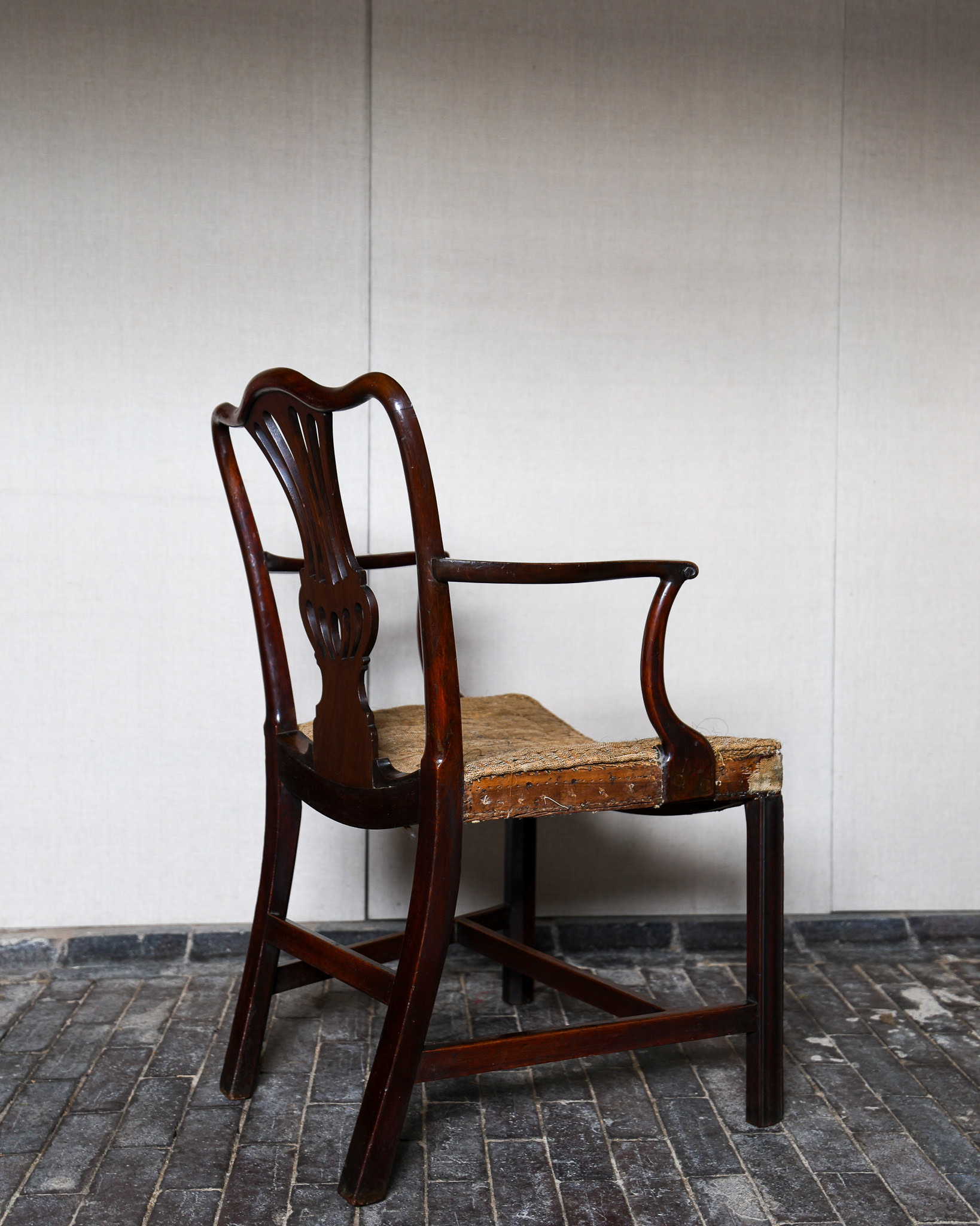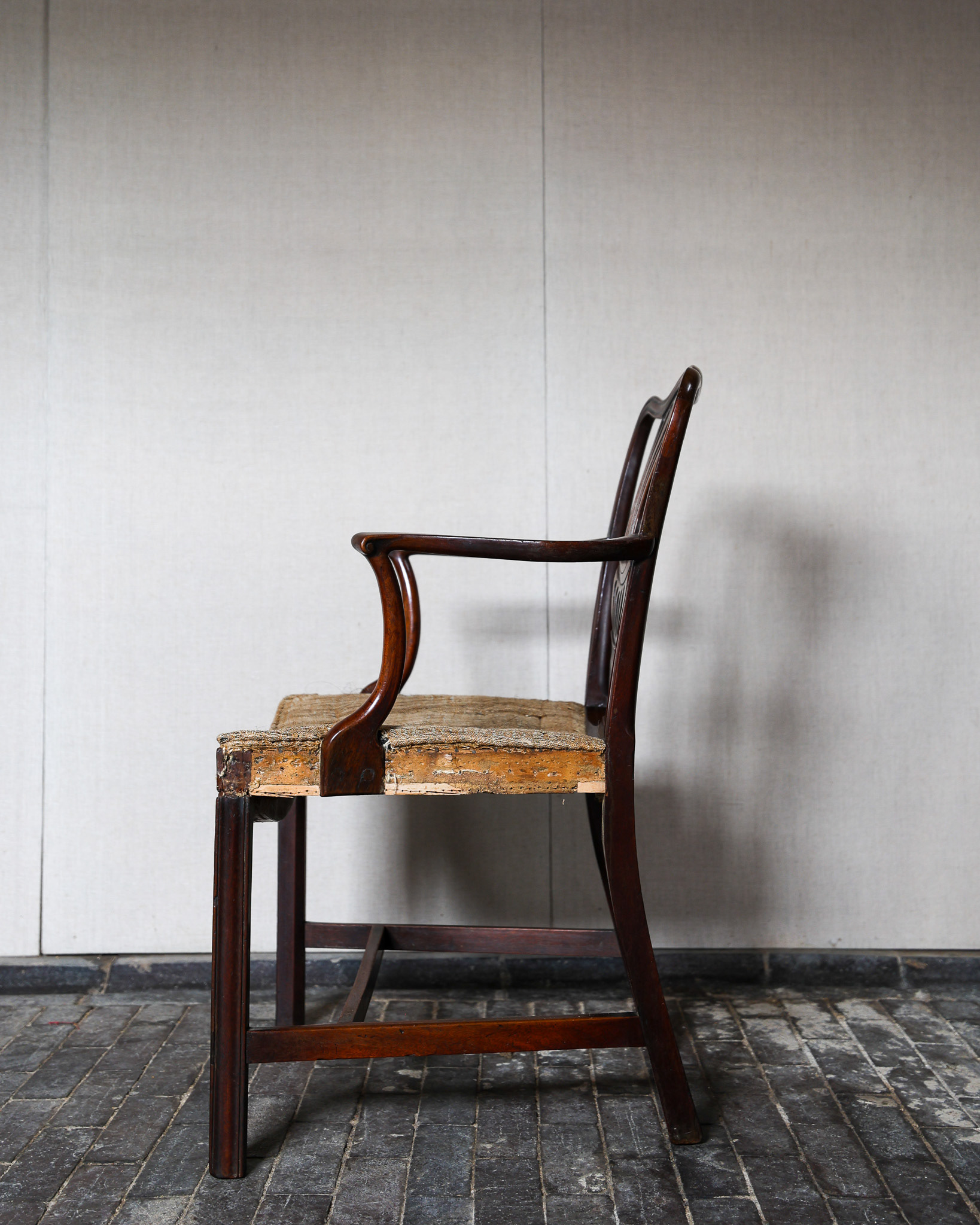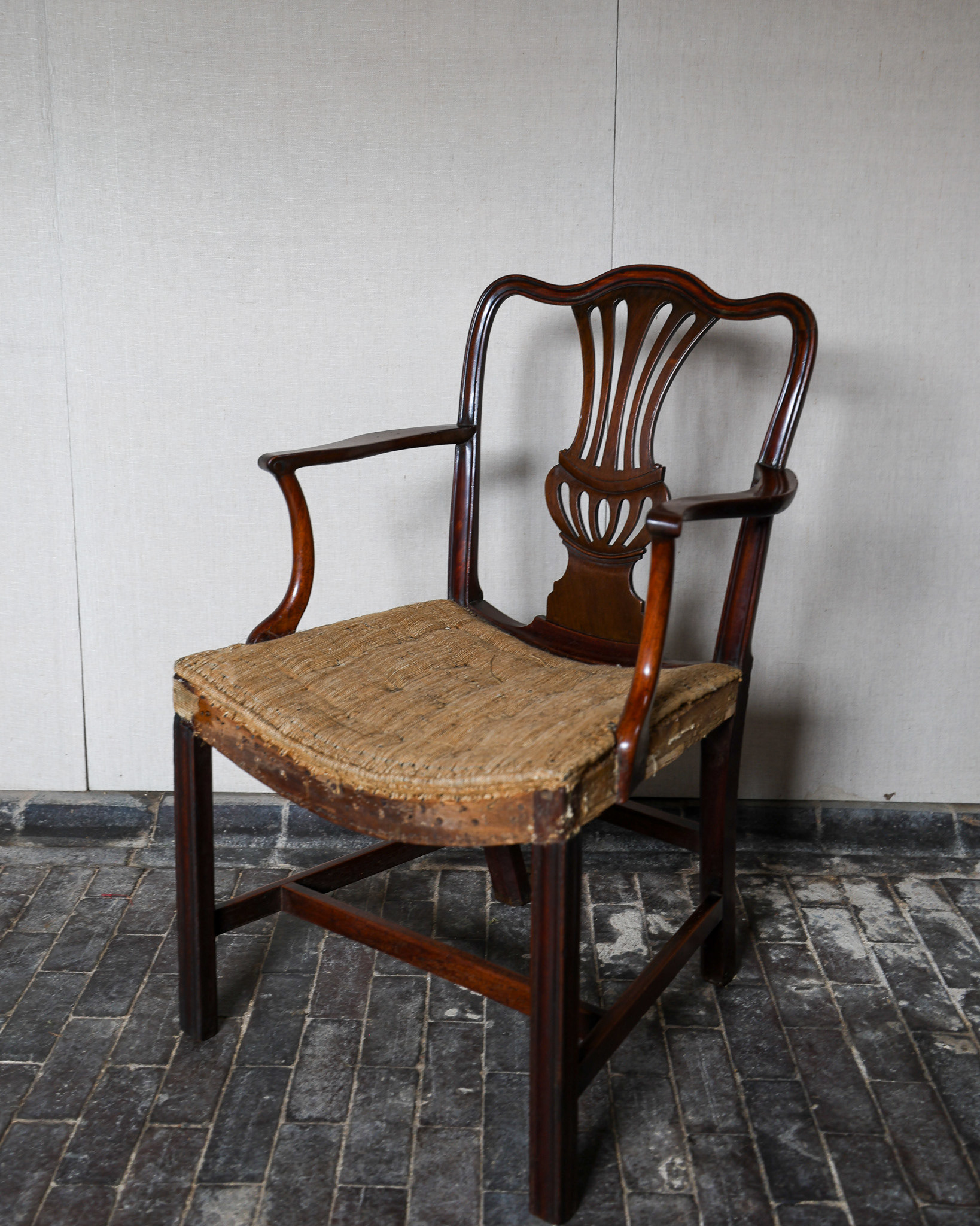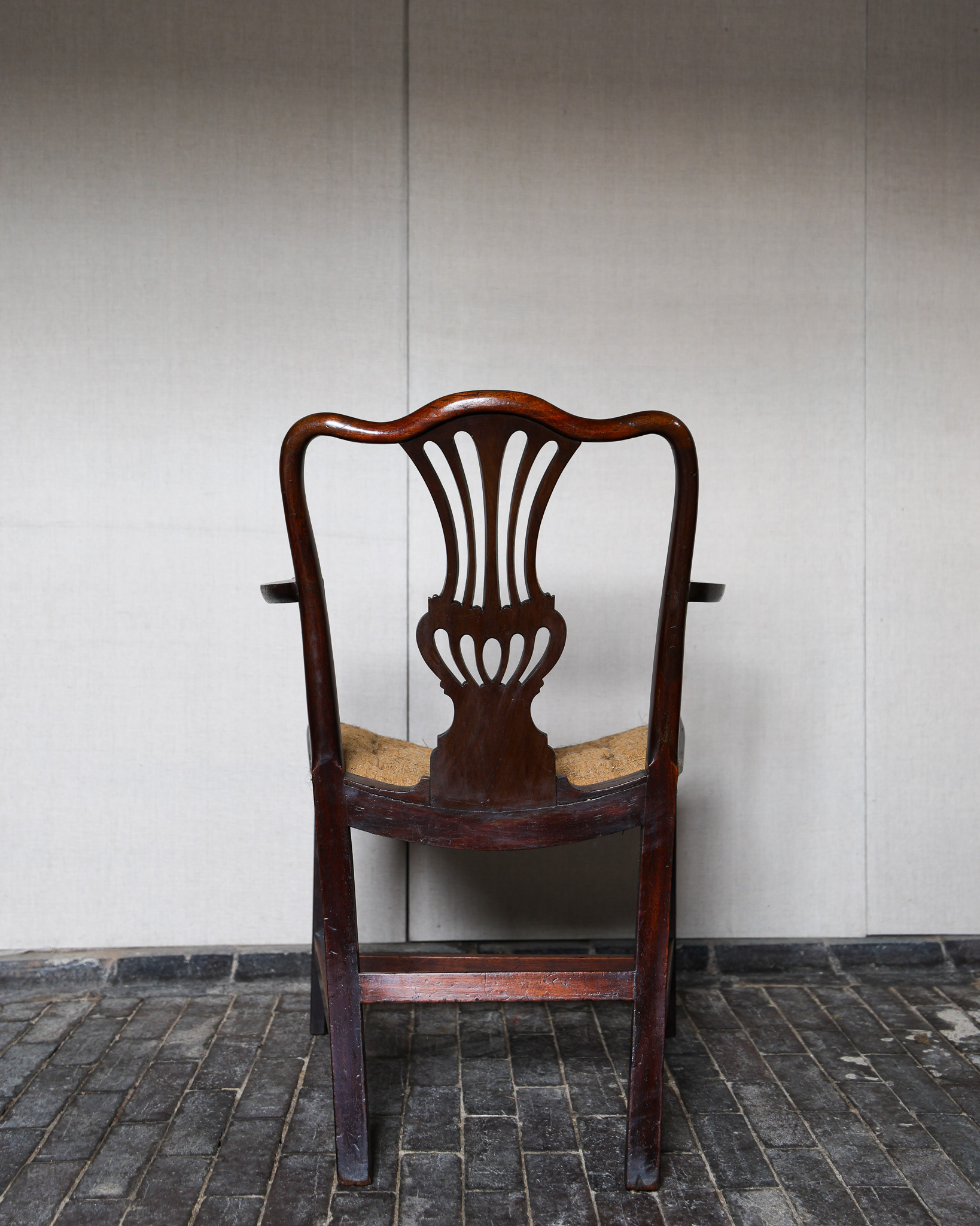 George III mahogany armchair of impressive grand scale, pierced back plate, elegant scrolled arms raised above scratch moulded supports and joined by stretchers. Circa 1790. £2800