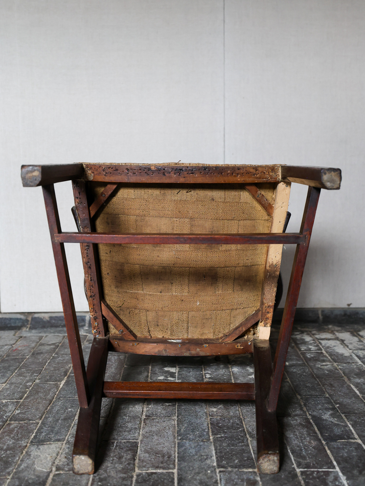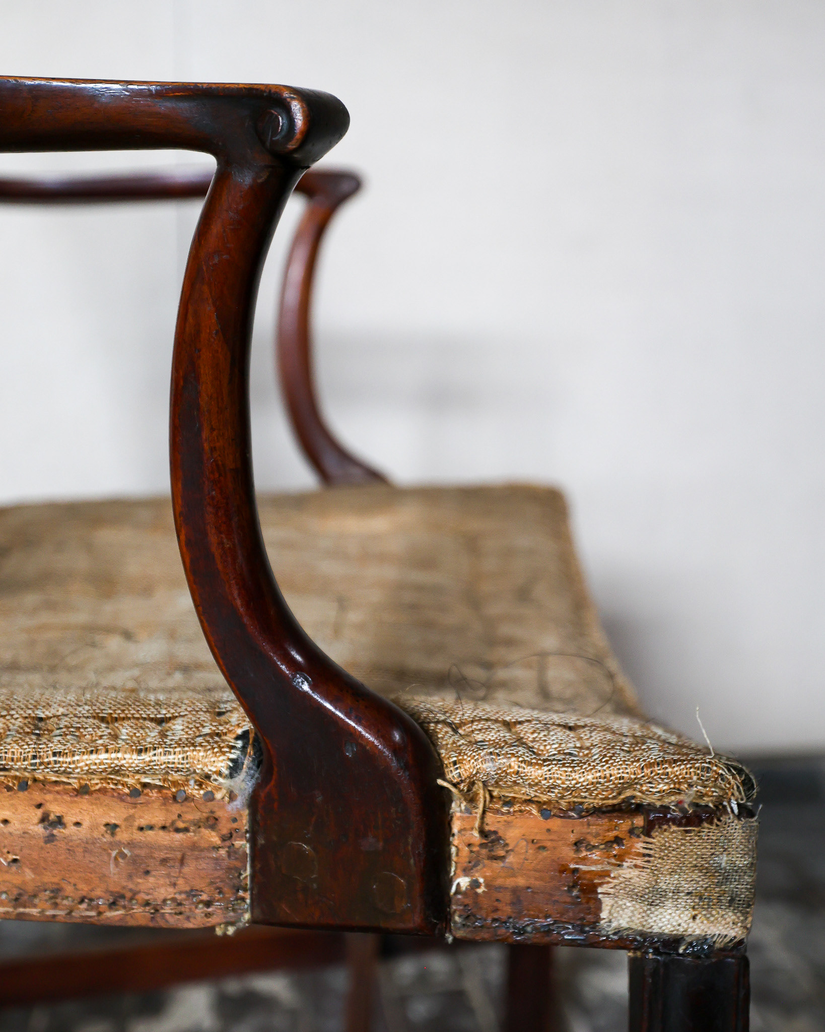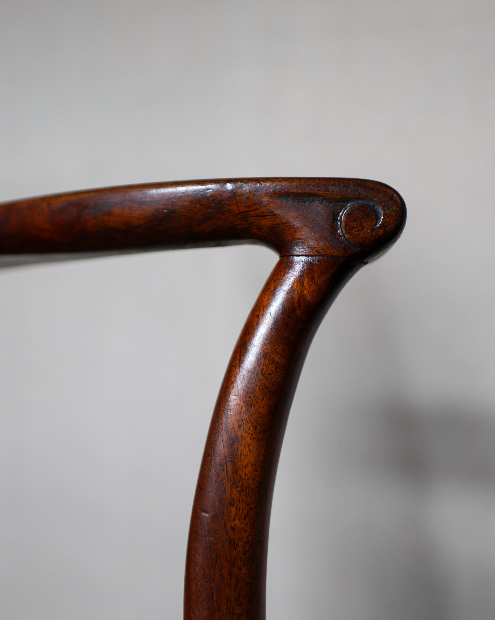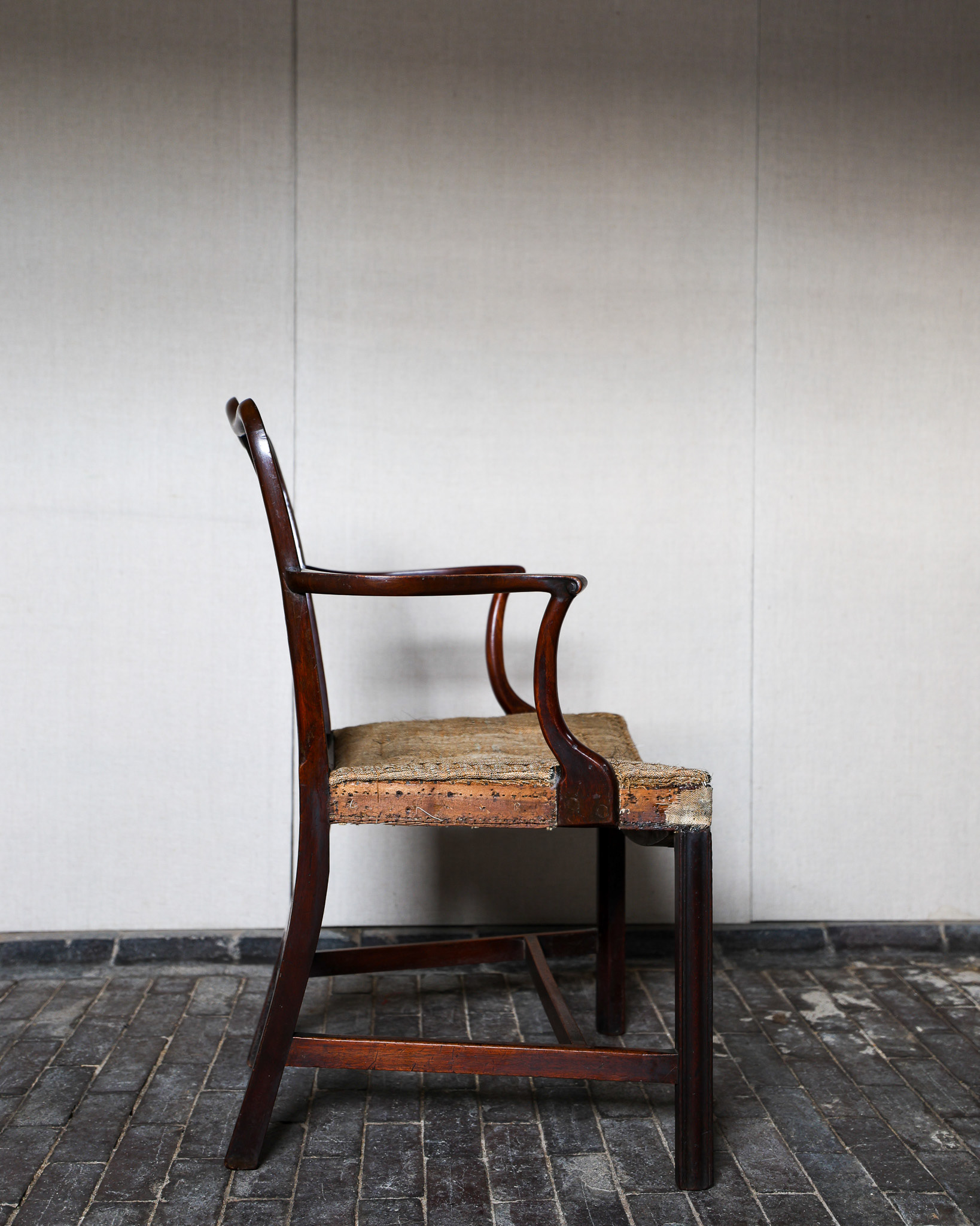 George III mahogany armchair of impressive grand scale, pierced back plate, elegant scrolled arms raised above scratch moulded supports and joined by stretchers. Circa 1790. £2800