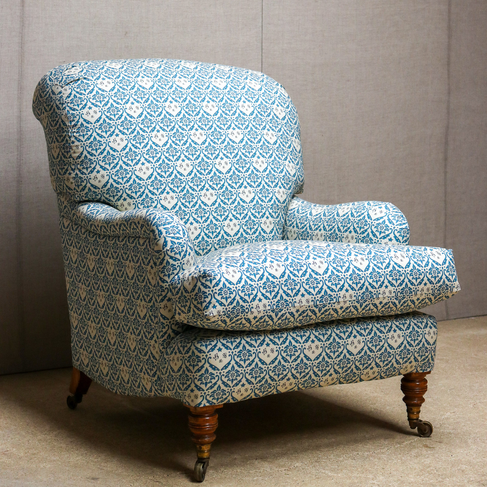 Howard & Sons Bridgewater armchair, 'siege de duvet’ seat and back terminating on light oak legs and brass caps and castors. Numbered stamp to back leg and brass caps stamped 'Howard & Sons, London'. Circa 1860. Fully re-upholstered from frame up to H&S factory ticking with new fustian covered feather and down cushions.