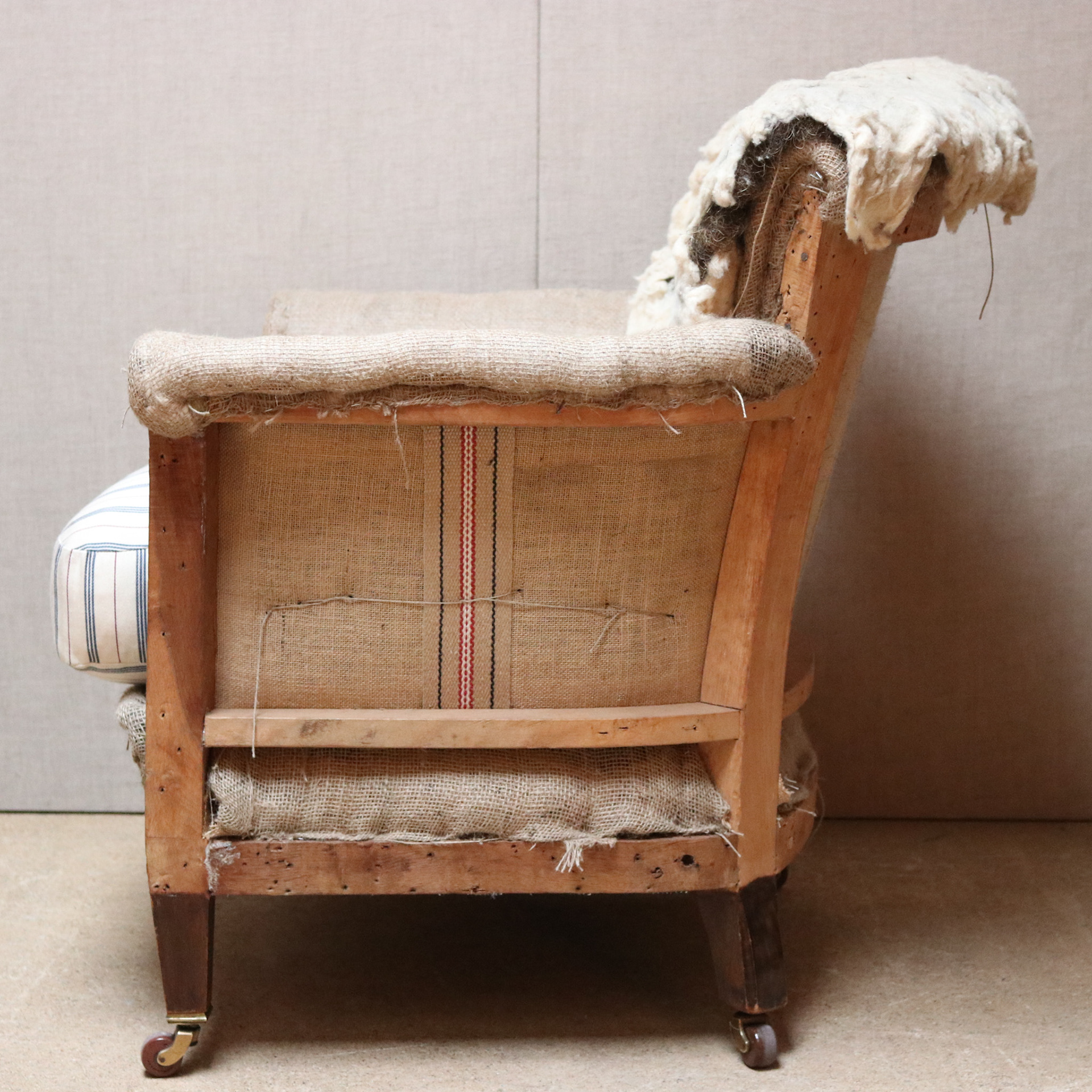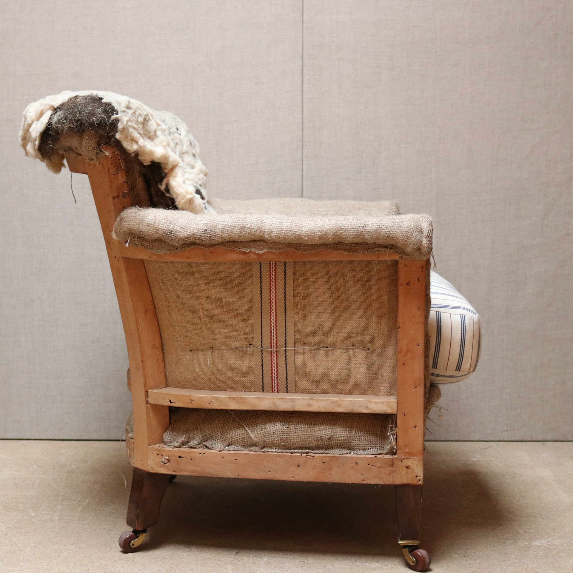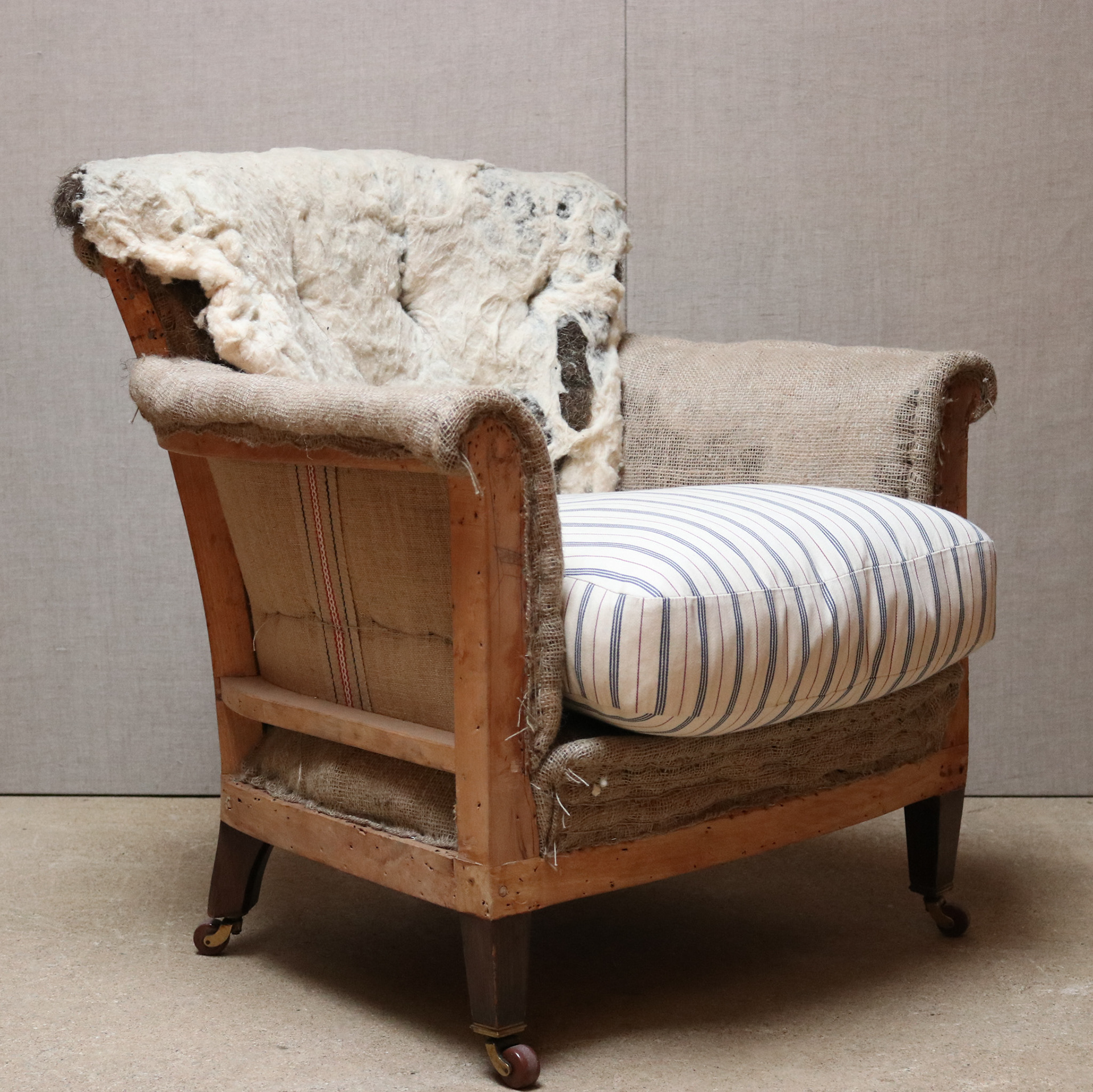 Howard Woodstock style armchair. Upholstered traditionally for covering. Feather and down seat cushion. Original brass and pot castors.
