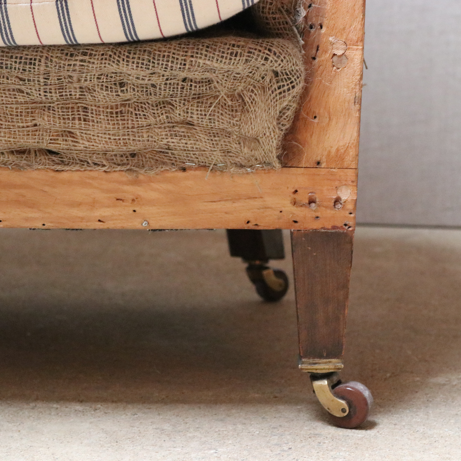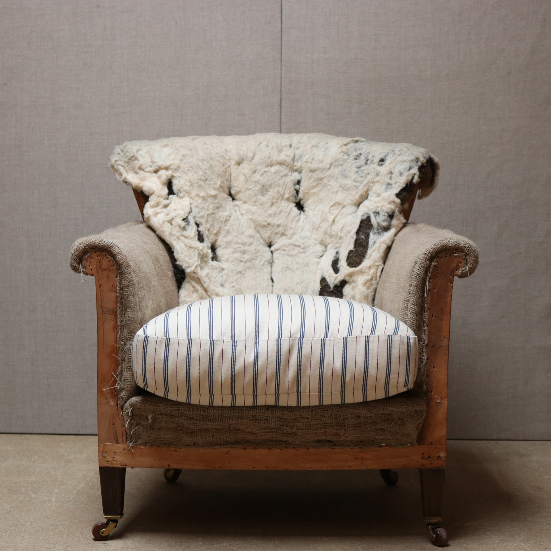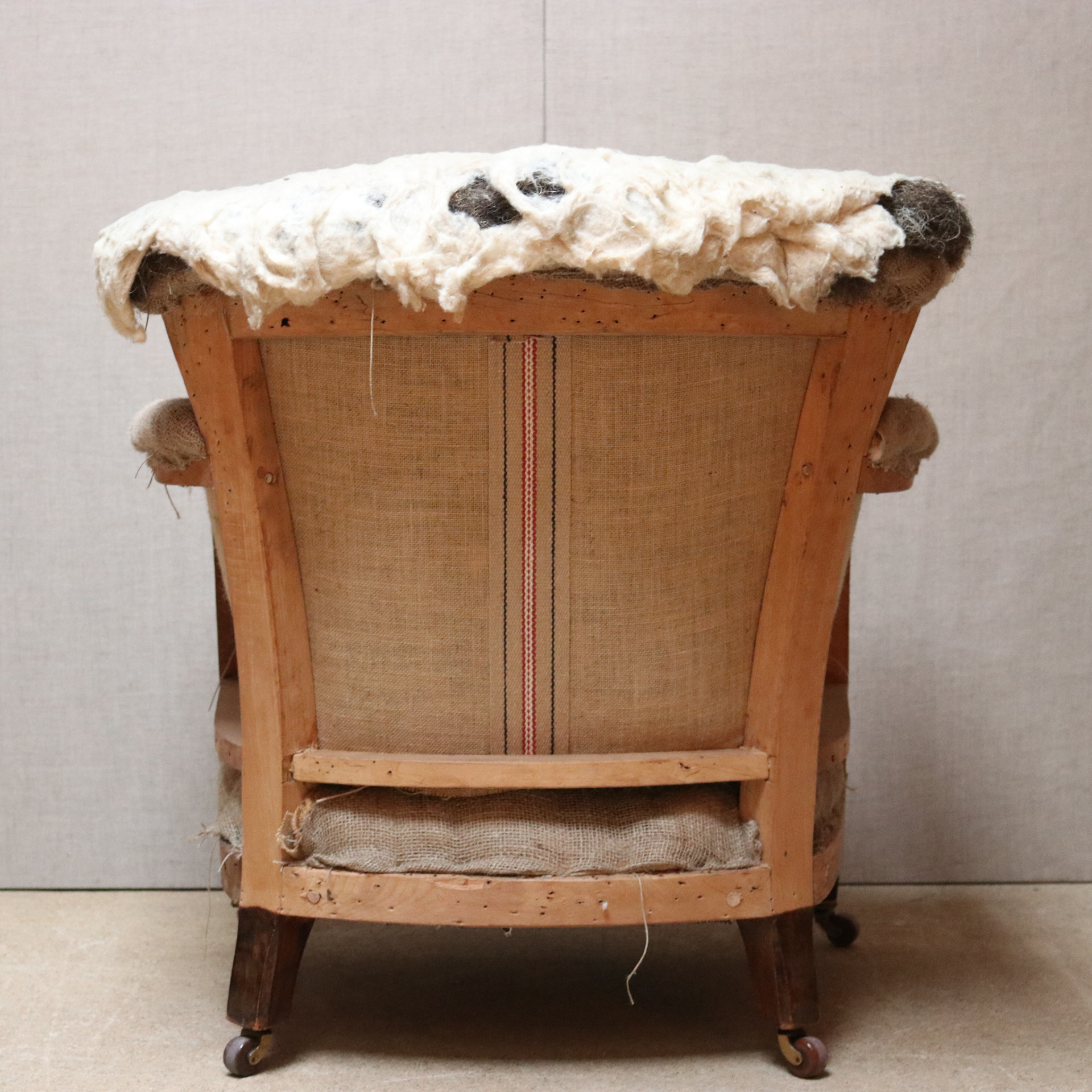 Howard Woodstock style armchair. Upholstered traditionally for covering. Feather and down seat cushion. Original brass and pot castors.