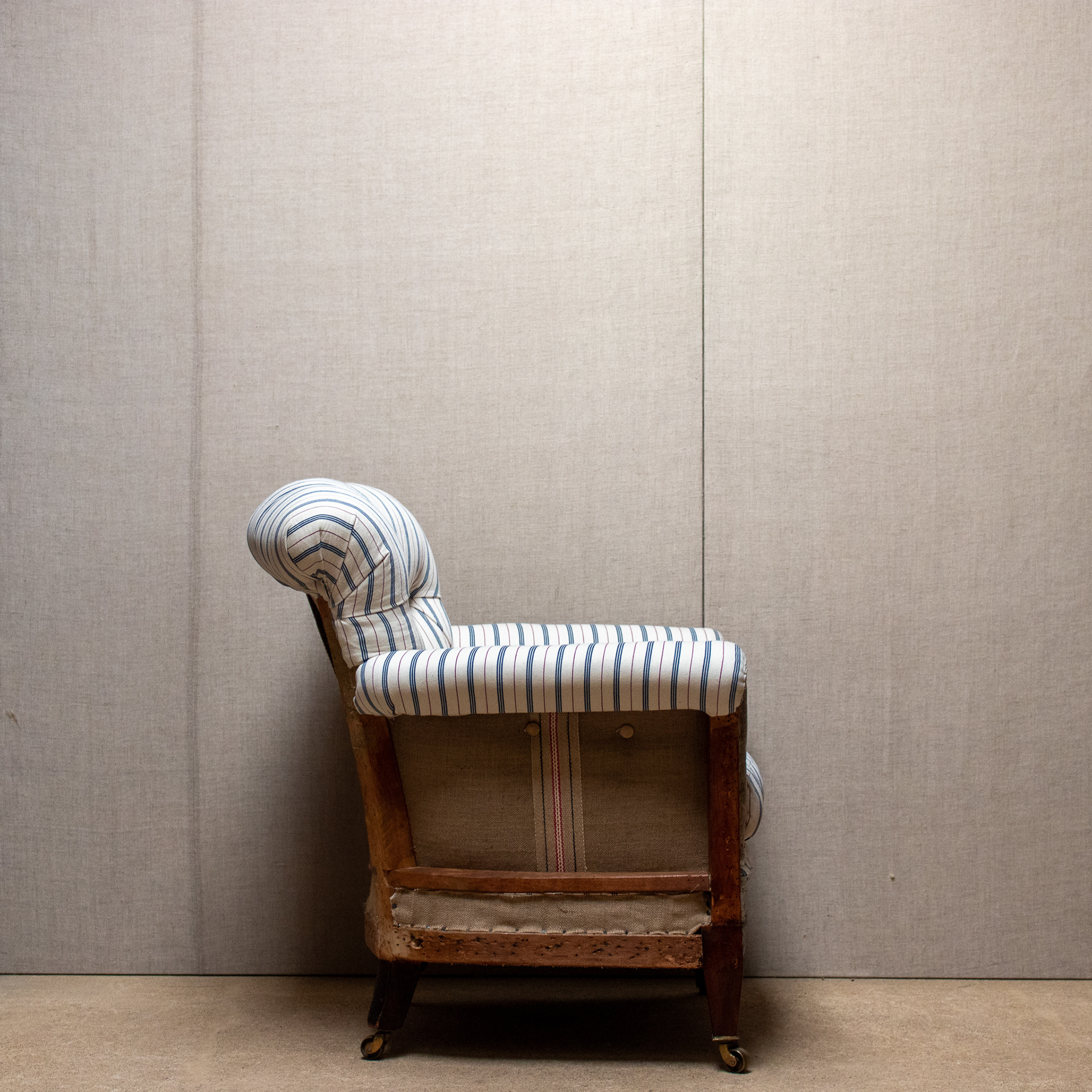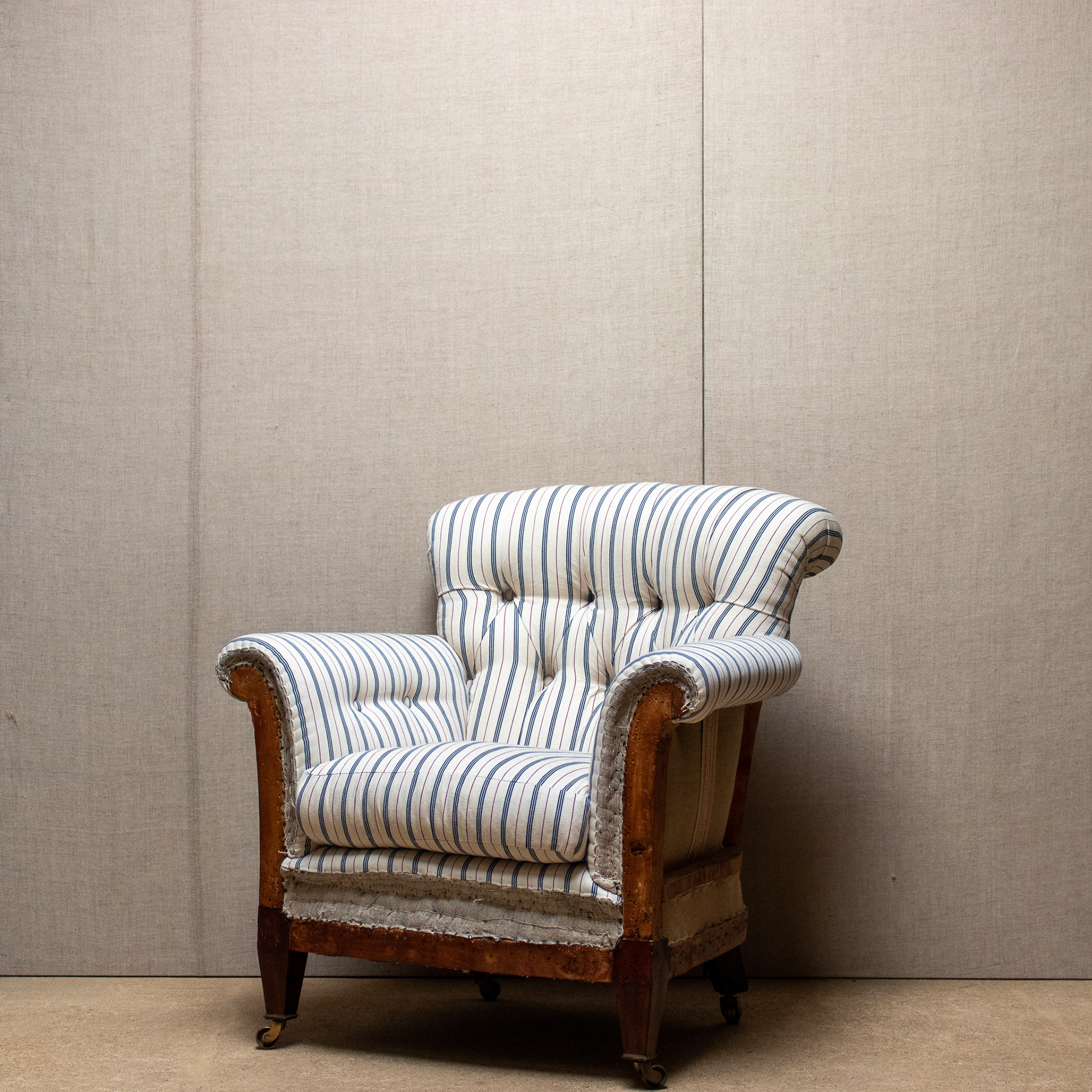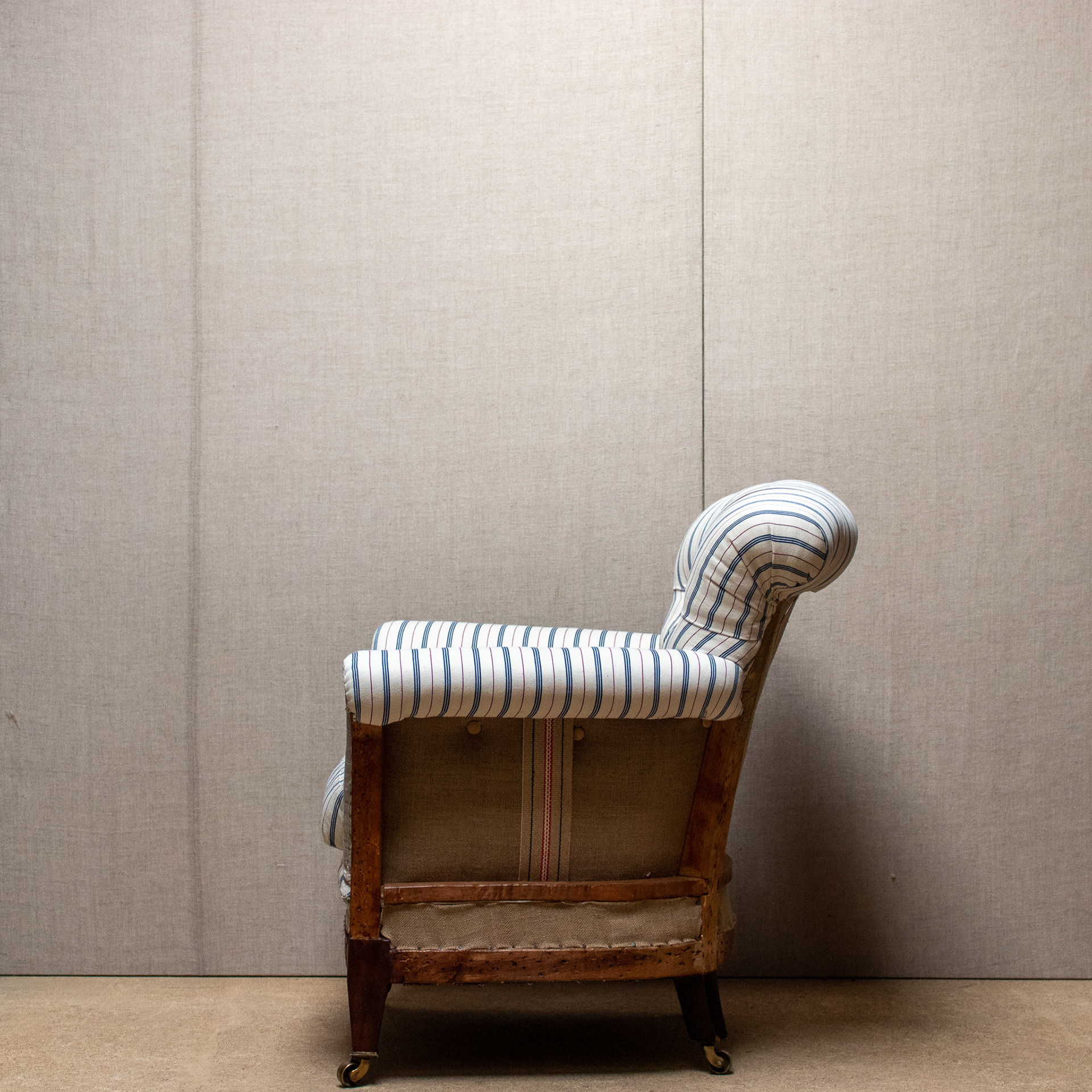 Howard Woodstock style armchair. Upholstered traditionally in a deconstructed manor. Feather and down seat cushion. Original brass castors.