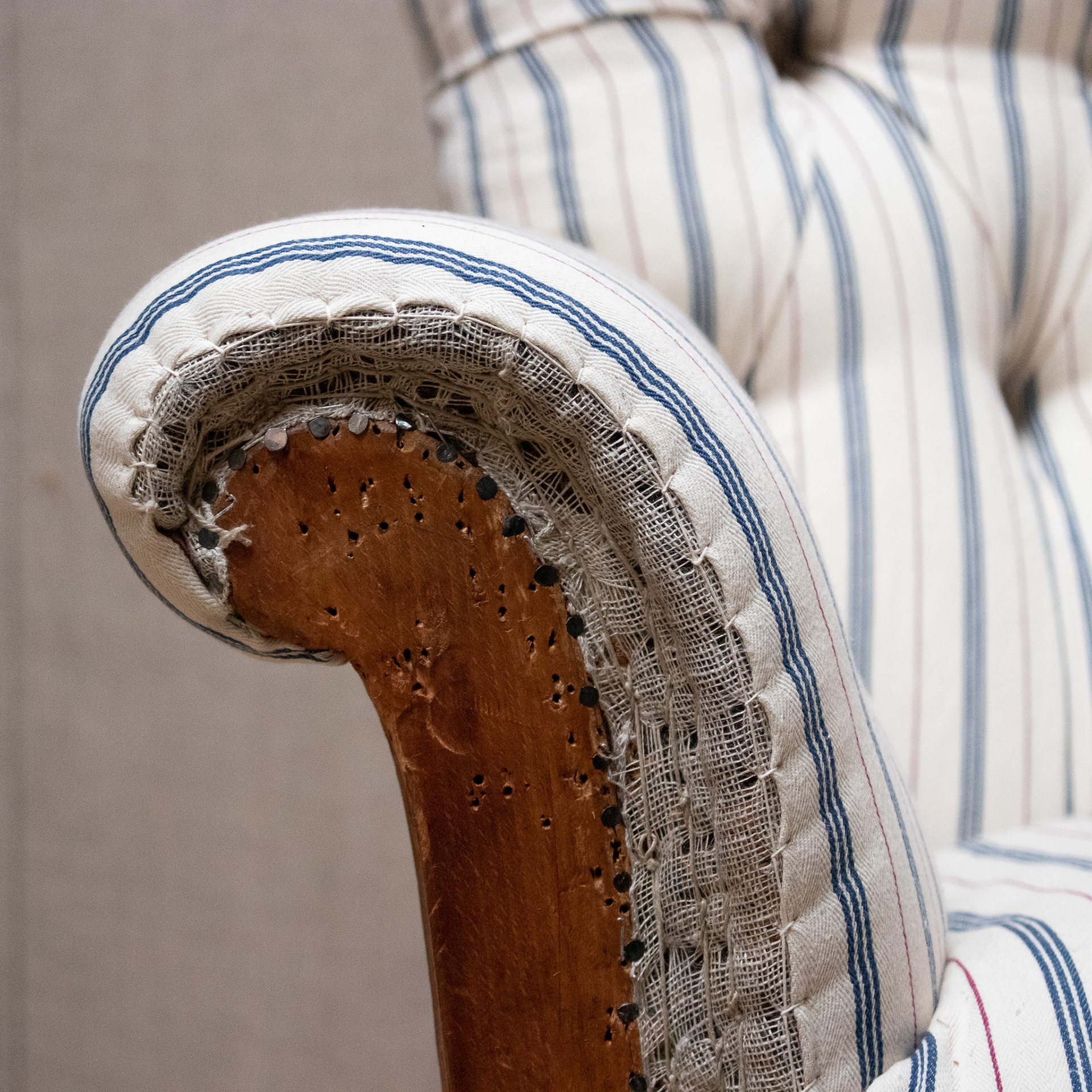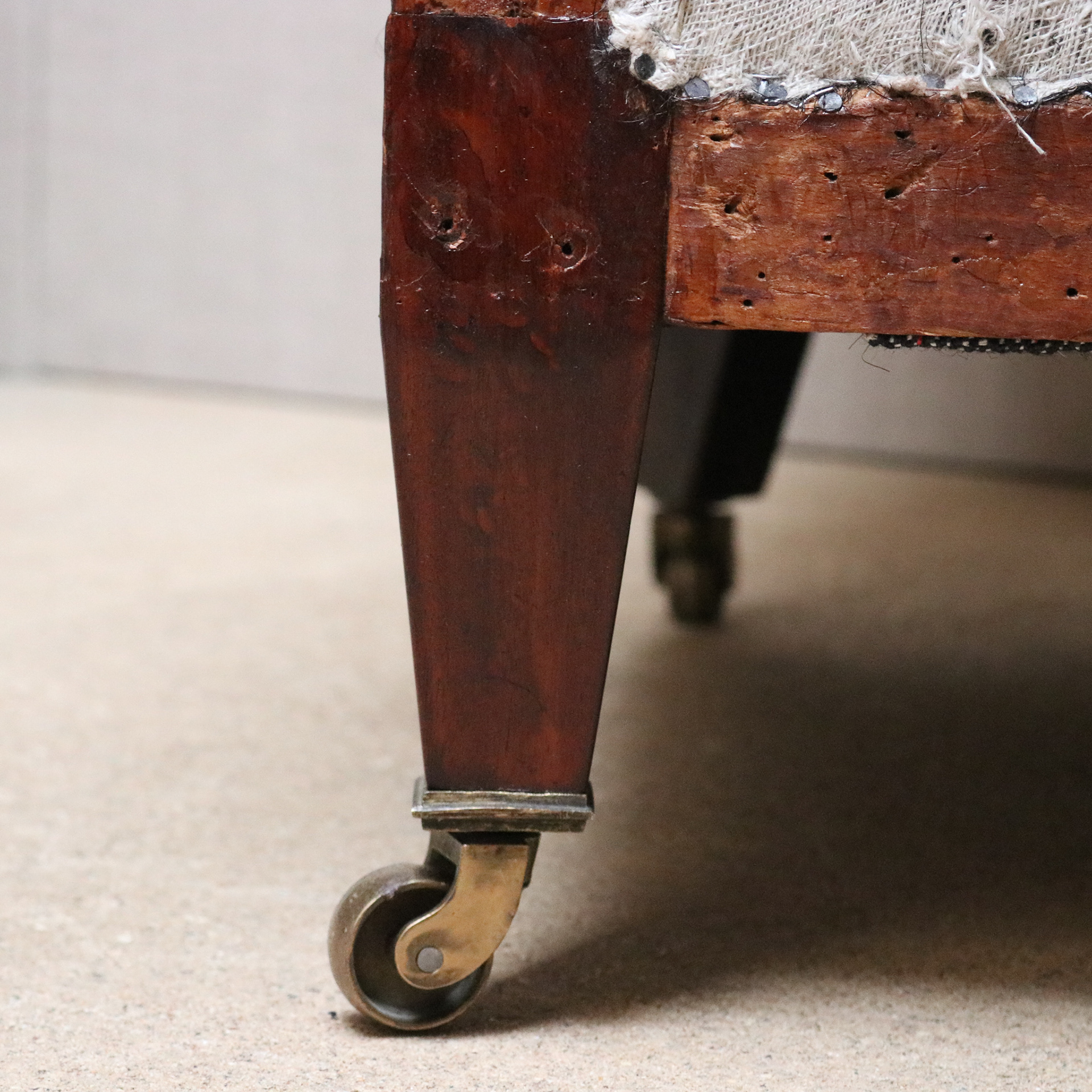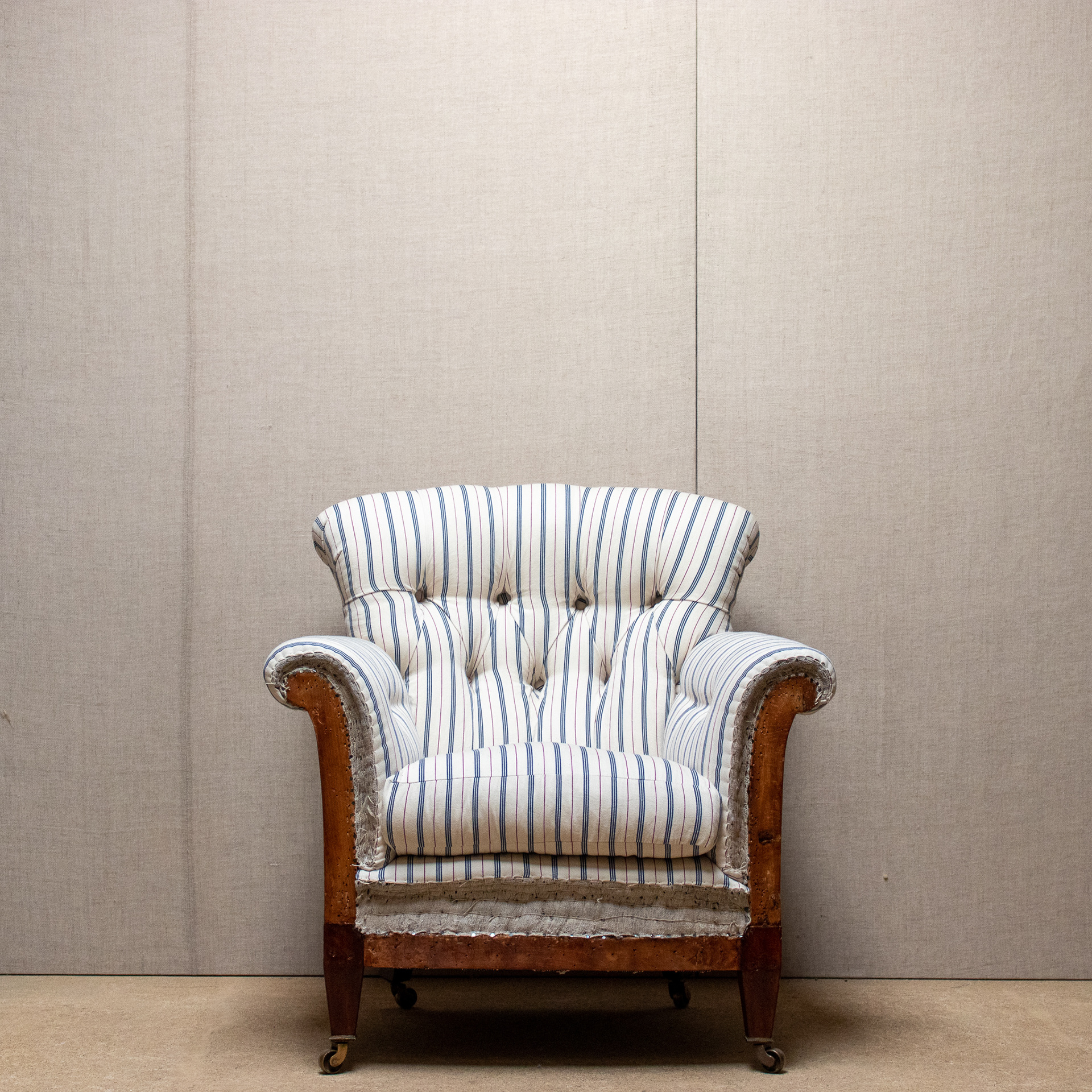 Howard Woodstock style armchair. Upholstered traditionally in a deconstructed manor. Feather and down seat cushion. Original brass castors.