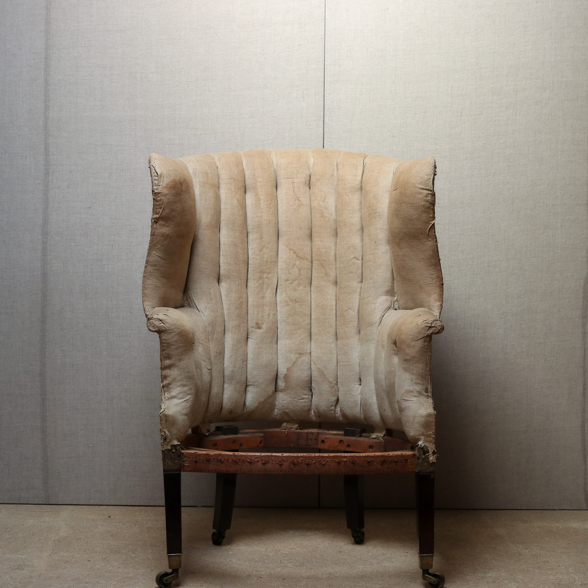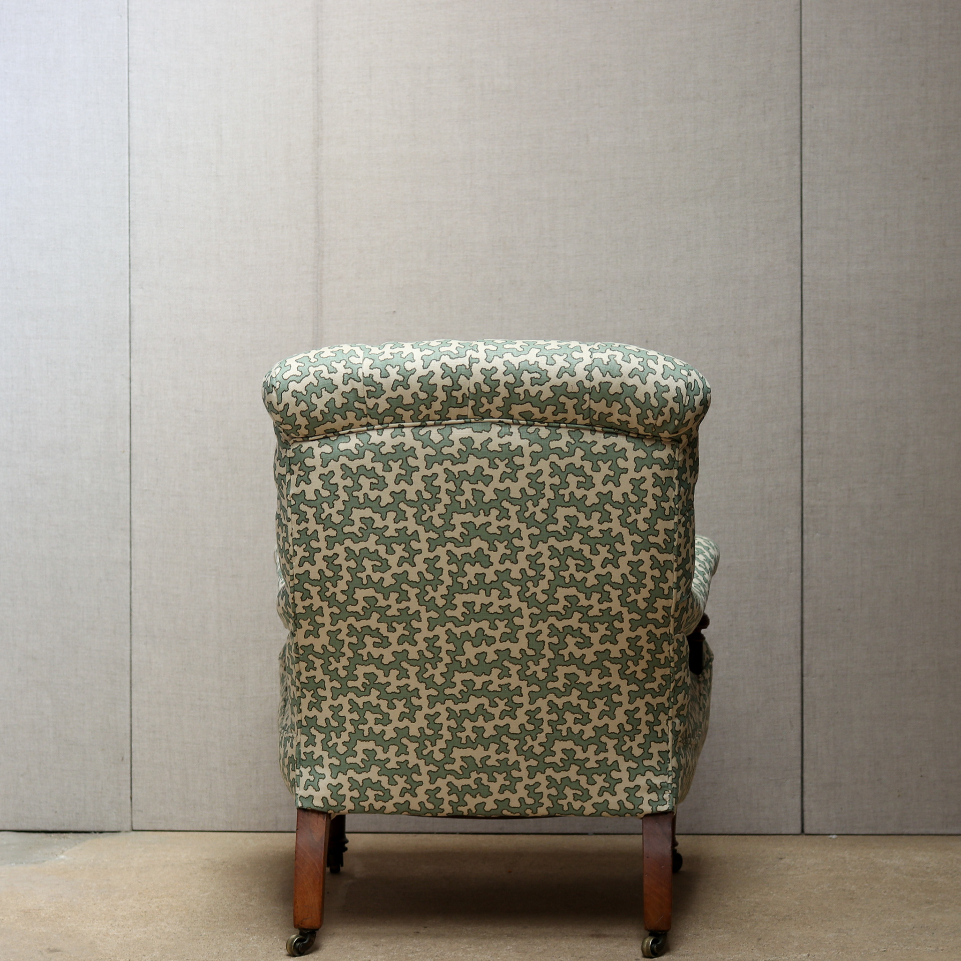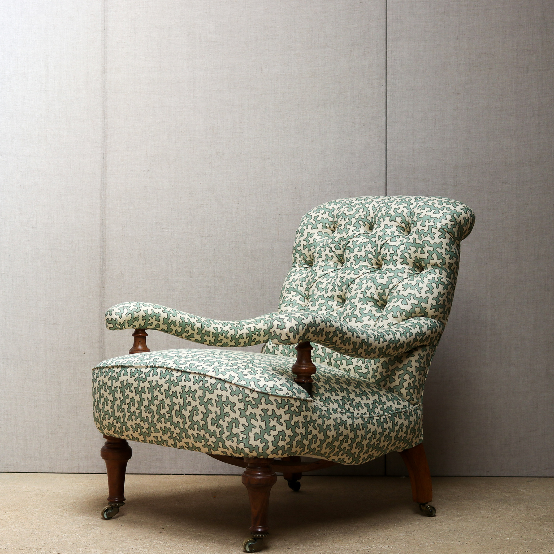 Holland & Sons open-armchair on turned walnut legs and original Cope's brass castors. Makers name also stamped "T Kettle" Circa 1860. Upholstered traditionally to coral printed linen. Unusual frame due to the construction of the arm with brass covered steel arrangement to support the arms.