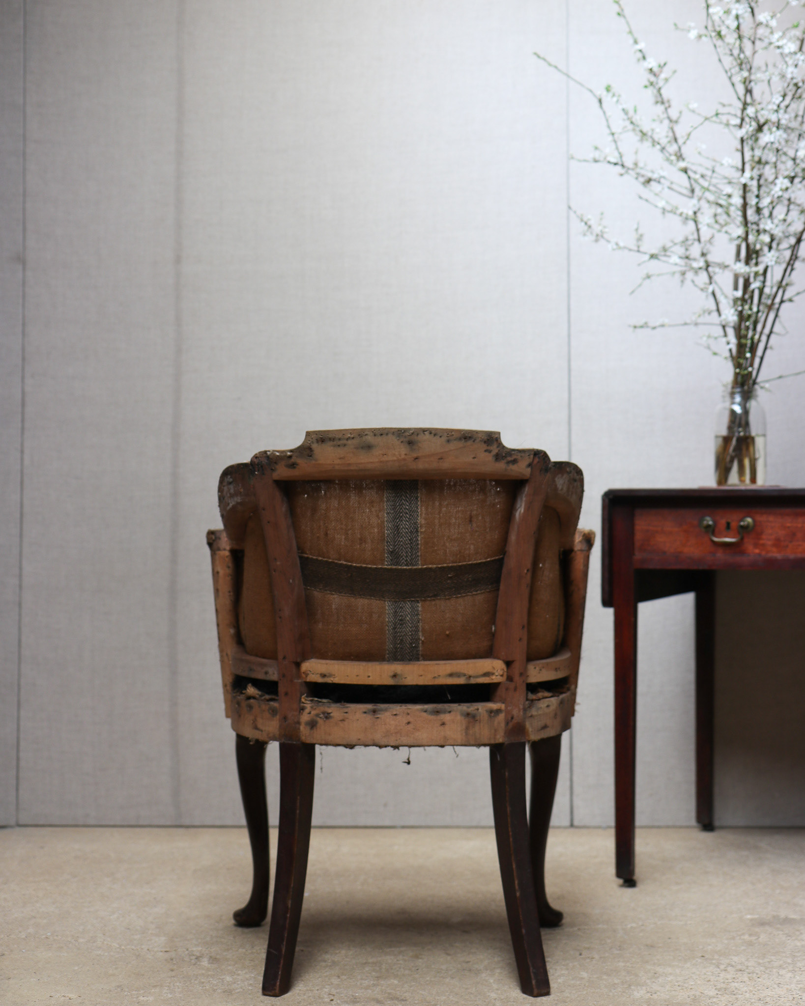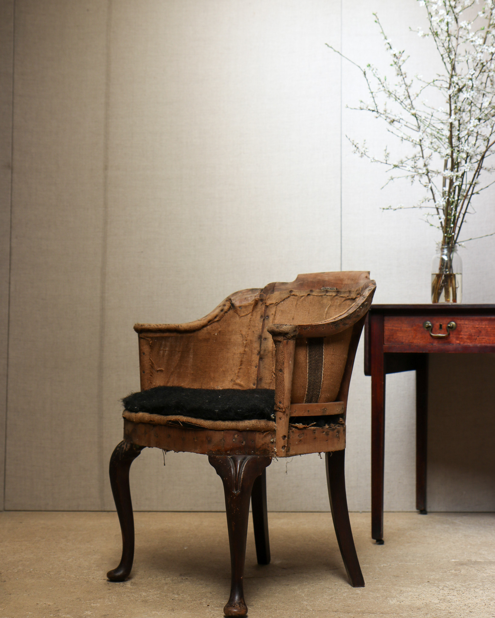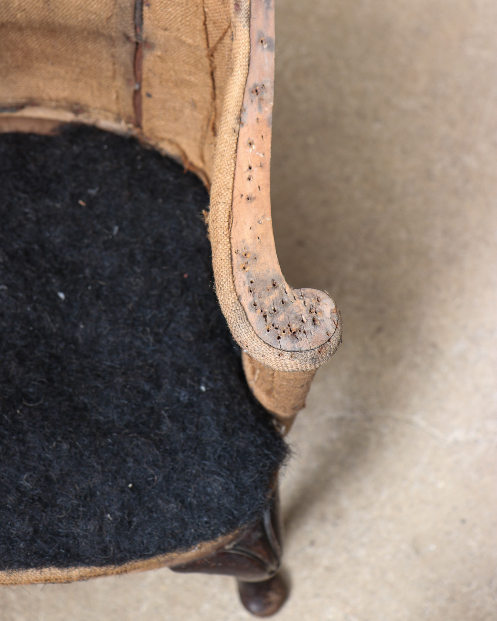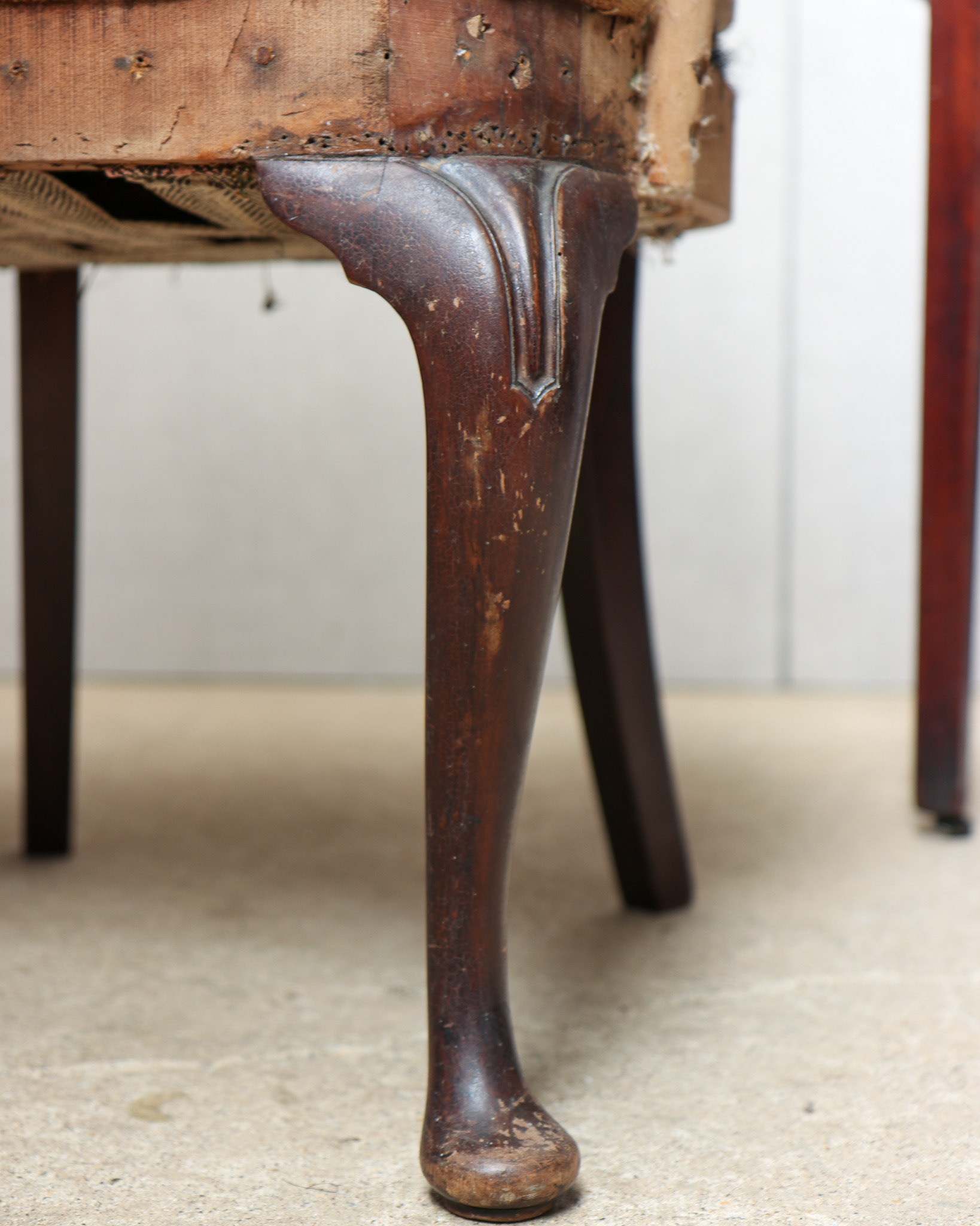 Scrolled arm walnut framed tub chair on carved walnut cabriole legs. Solid frame for upholstery. Available as is or re-upholstered.