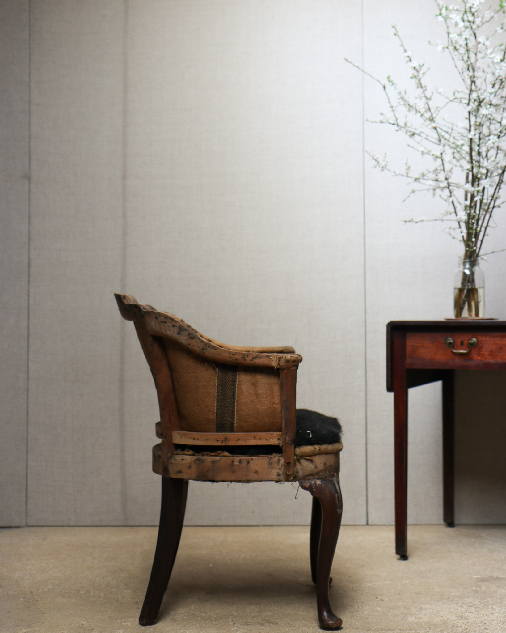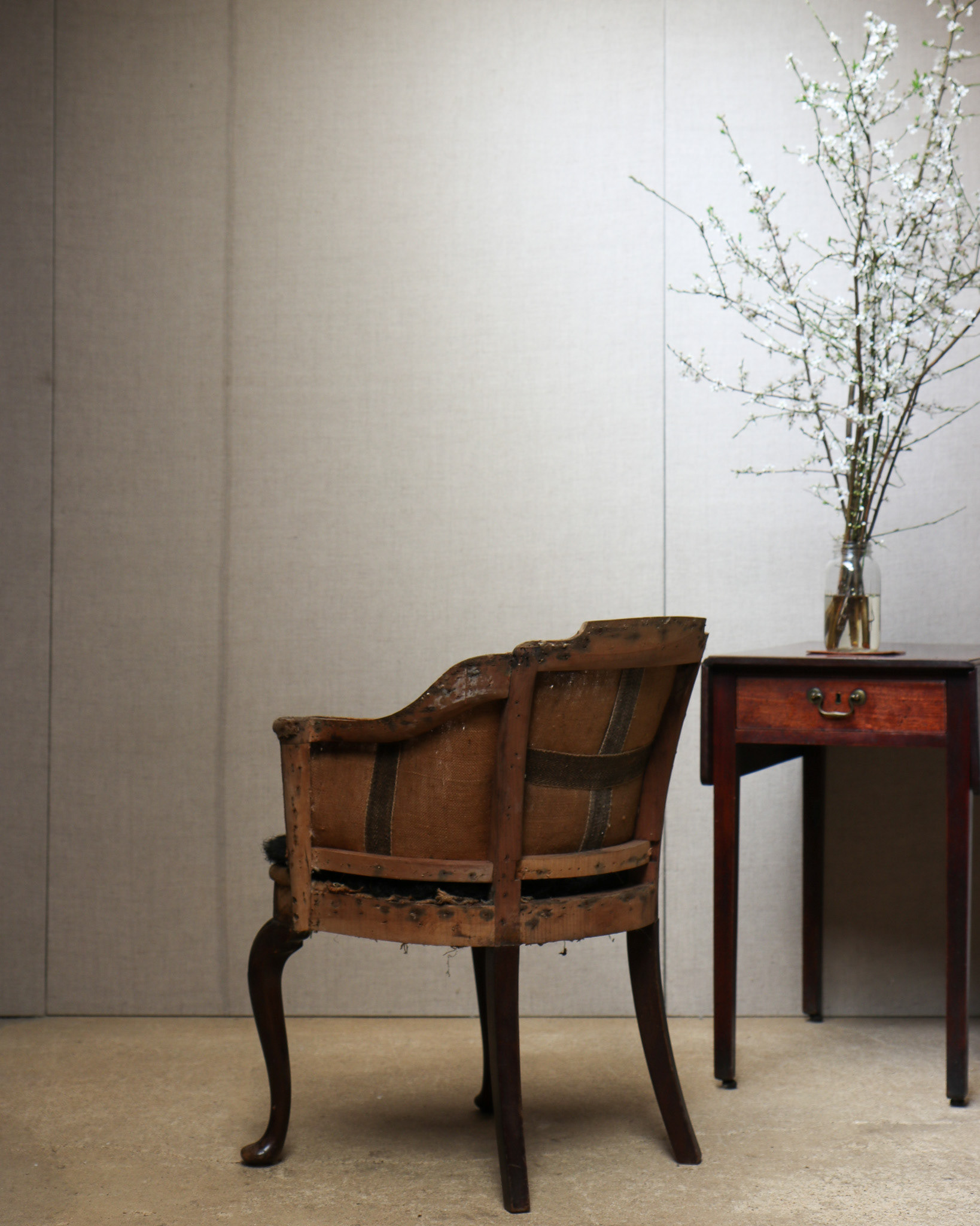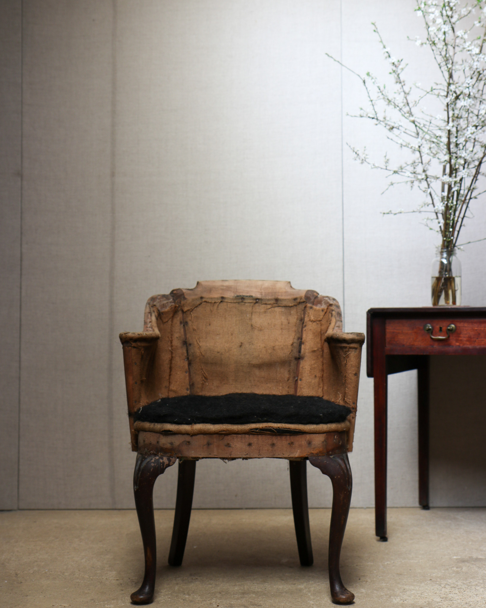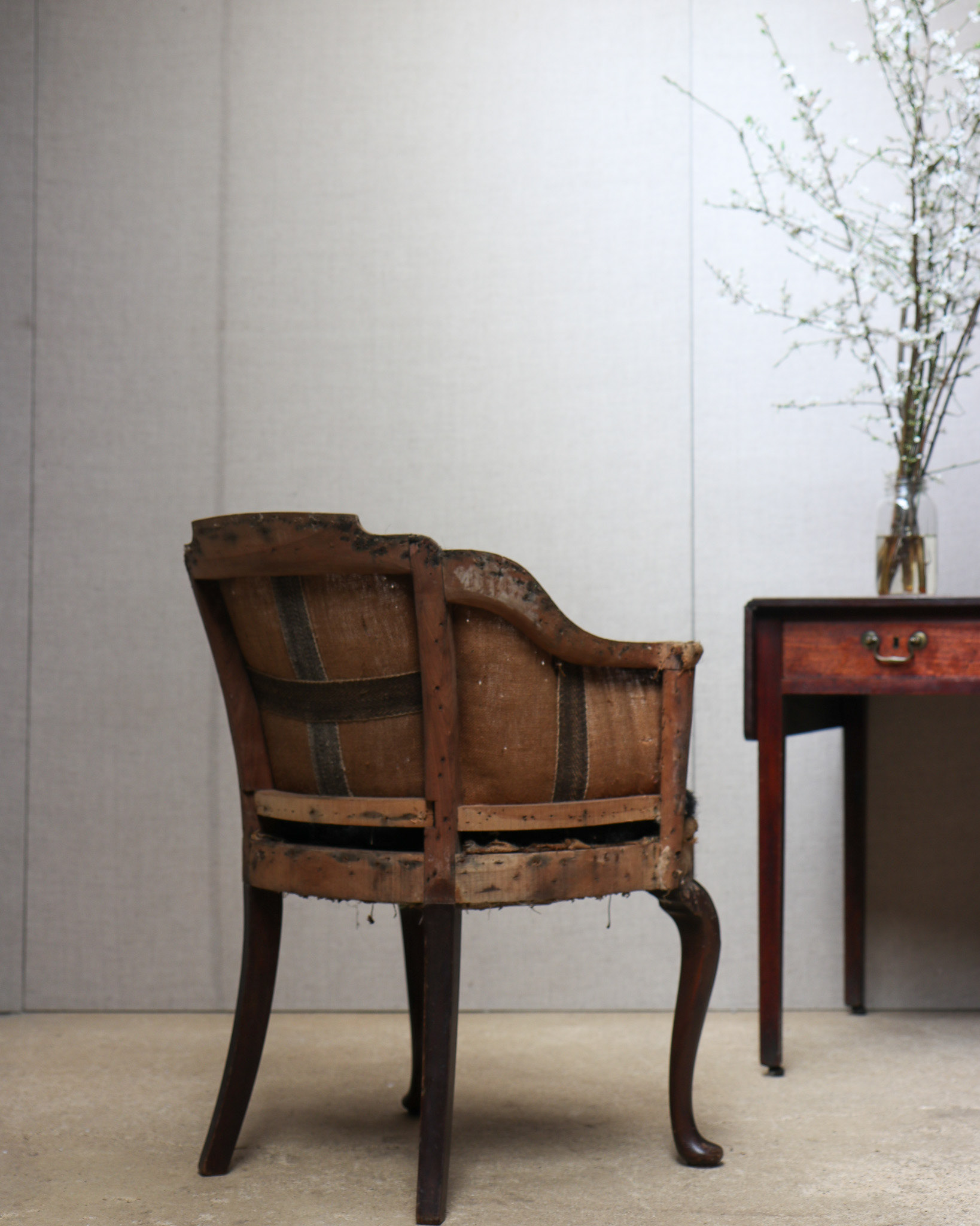 Scrolled arm walnut framed tub chair on carved walnut cabriole legs. Solid frame for upholstery. Available as is or re-upholstered.