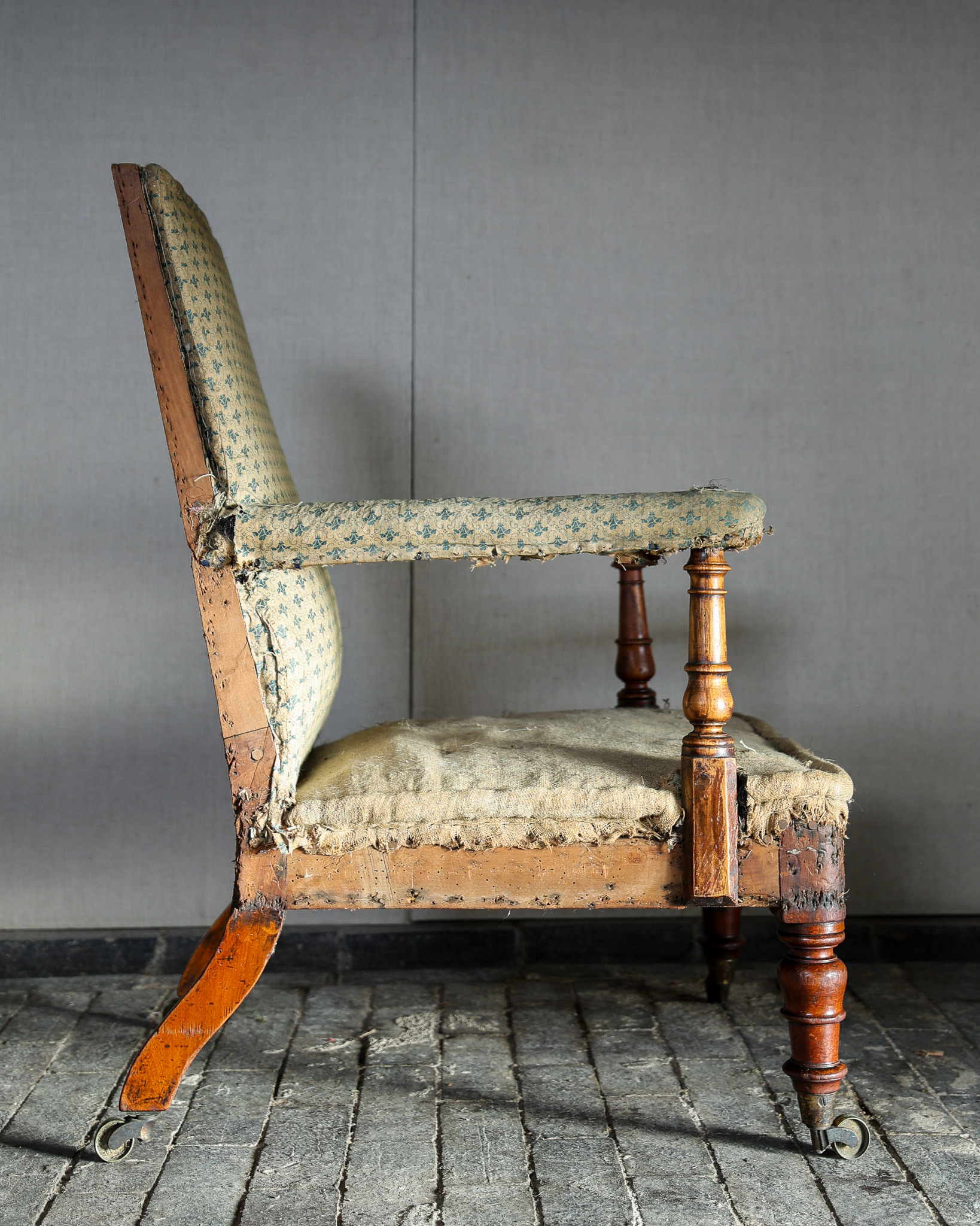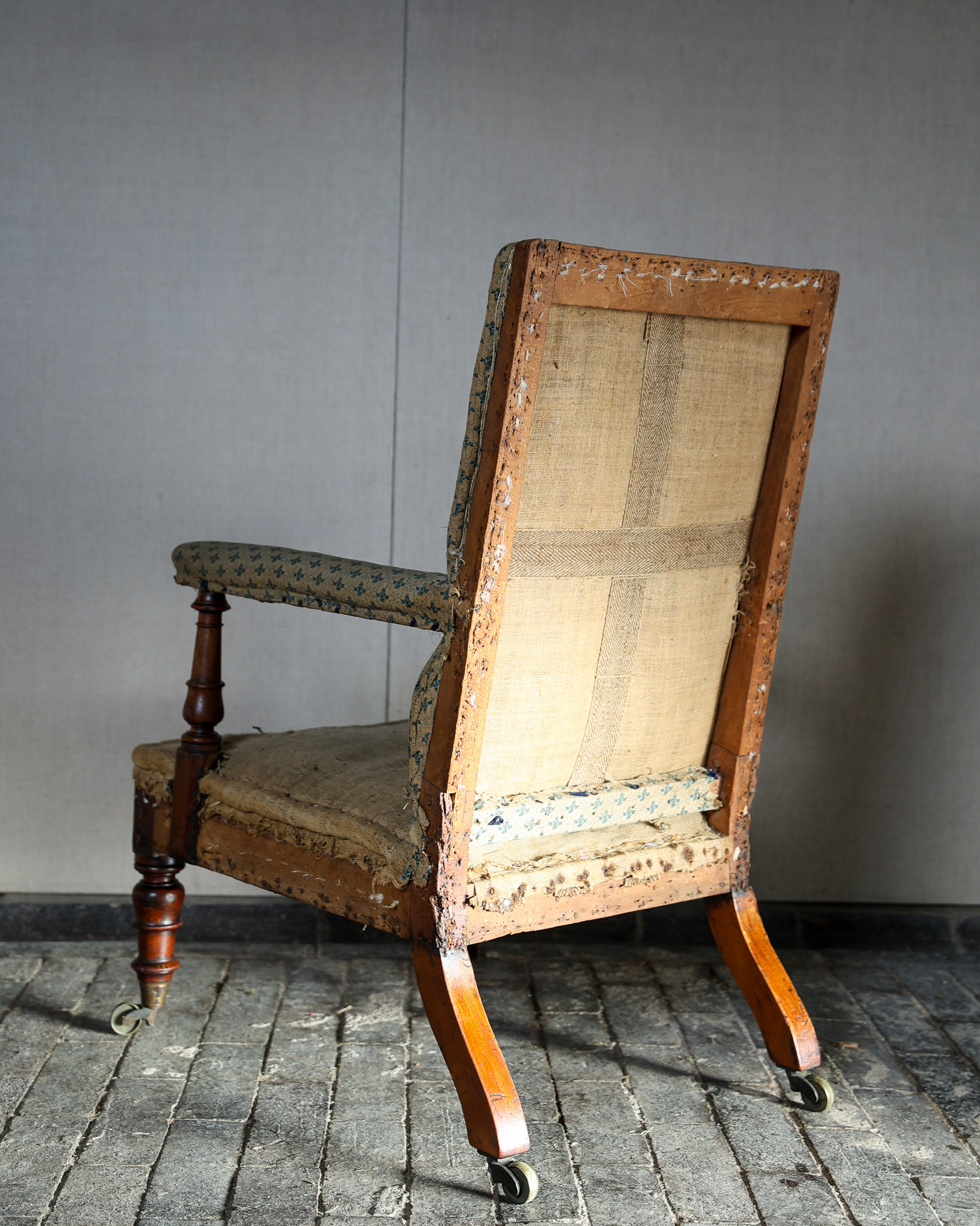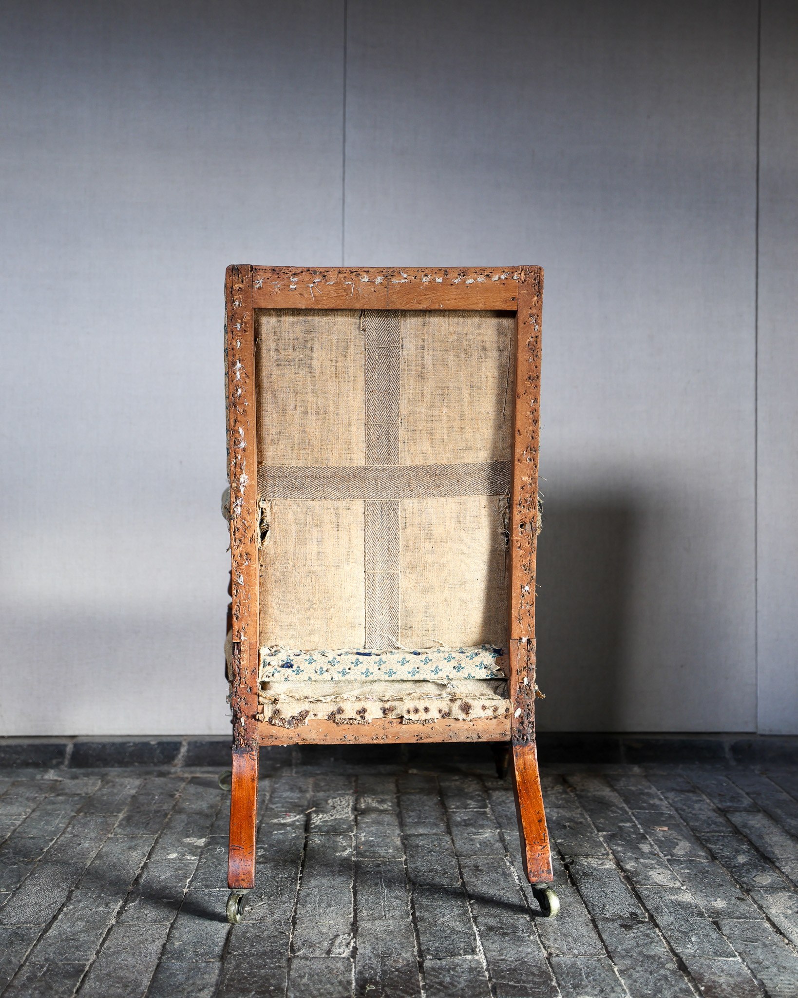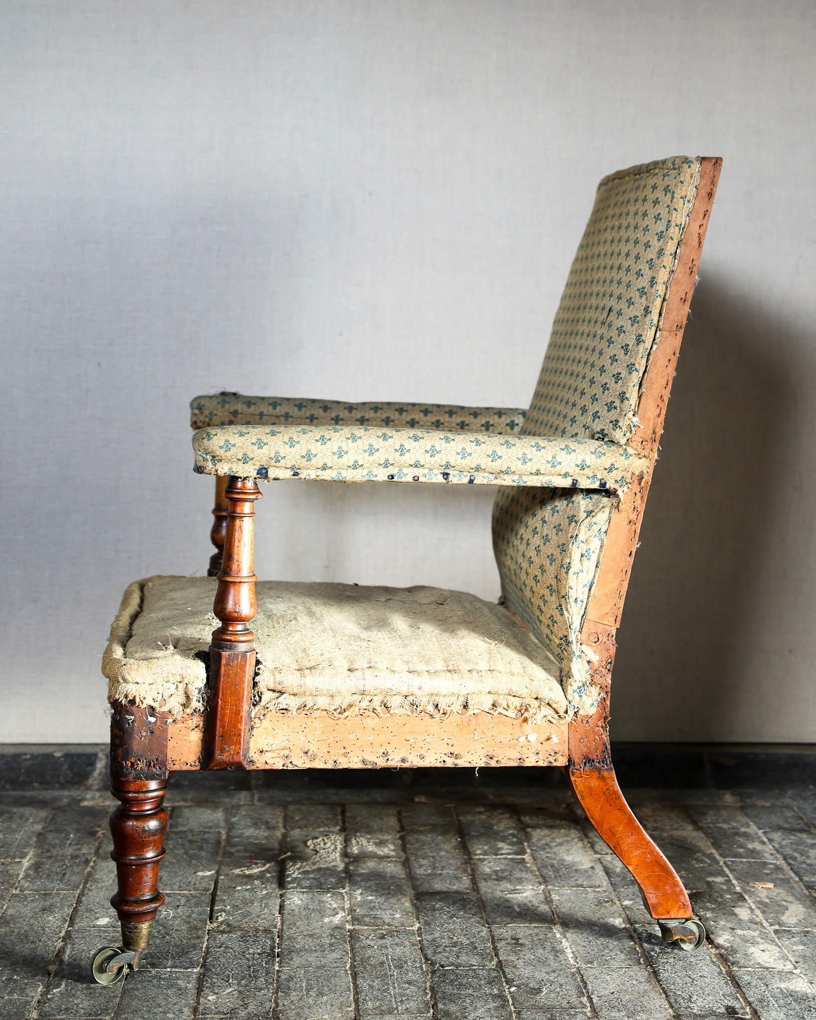 Open armchair on rosewood turned supports, brass caps and castors. Original print to back and arms with Prince of Wales fleur de lys. Circa 1820. Bit of worm damage to seat rails but otherwise good frame condition. Available as seen £750 or including upholstery £1150 plus 4 meters of cloth.