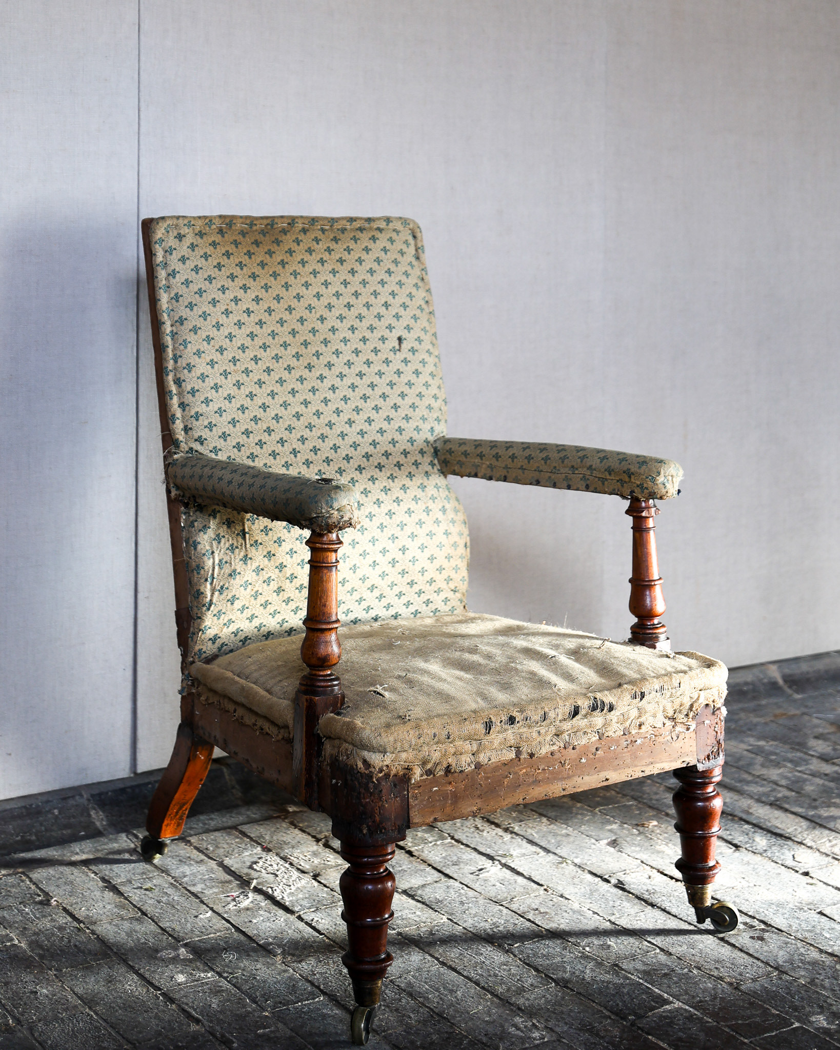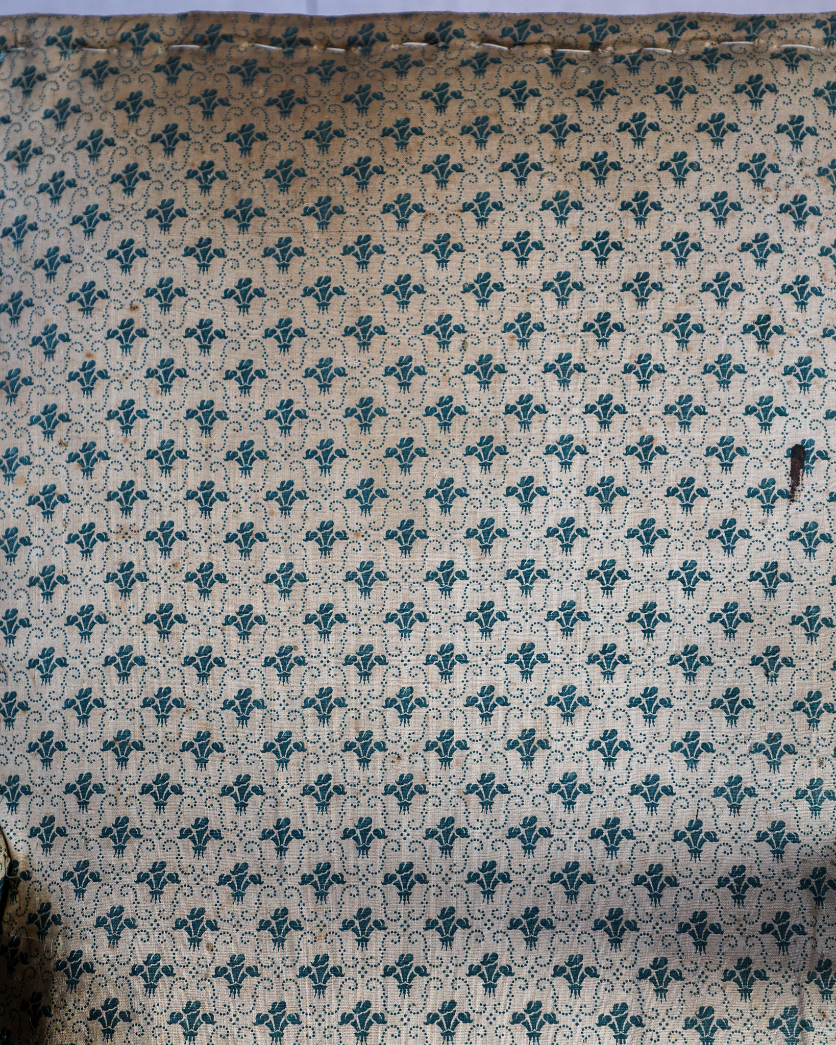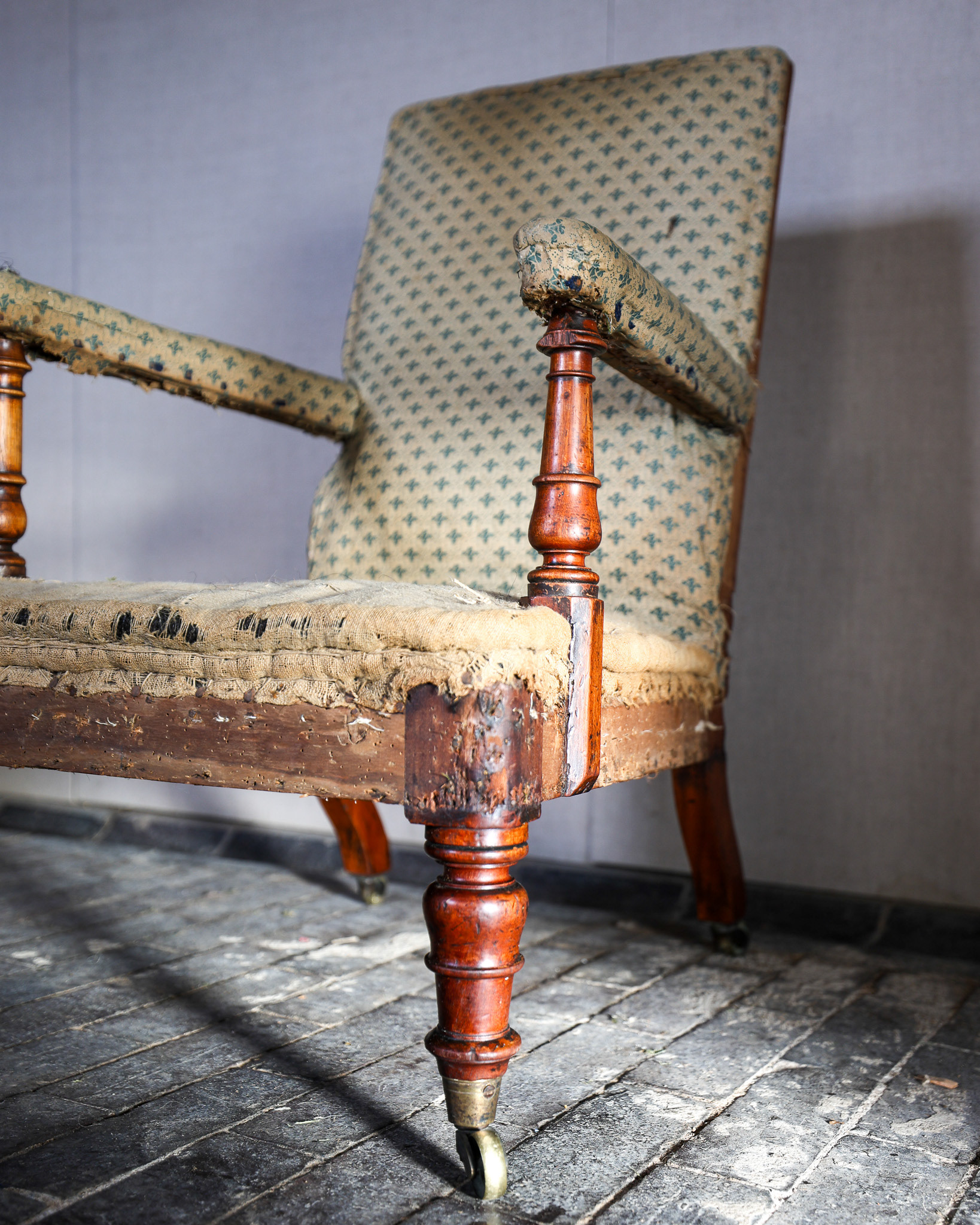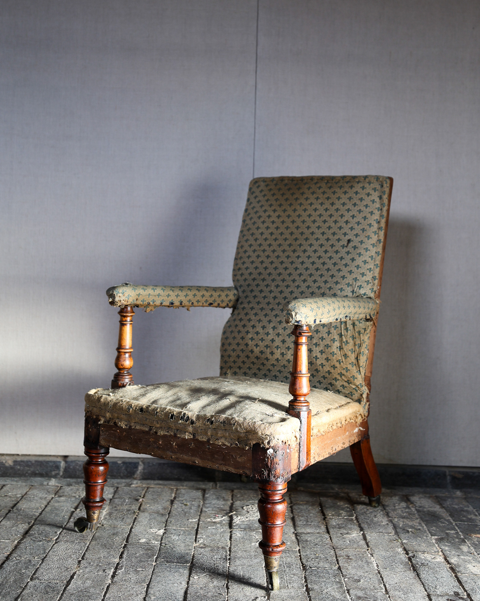 Open armchair on rosewood turned supports, brass caps and castors. Original print to back and arms with Prince of Wales fleur de lys. Circa 1820. Bit of worm damage to seat rails but otherwise good frame condition. Available as seen £750 or including upholstery £1150 plus 4 meters of cloth.