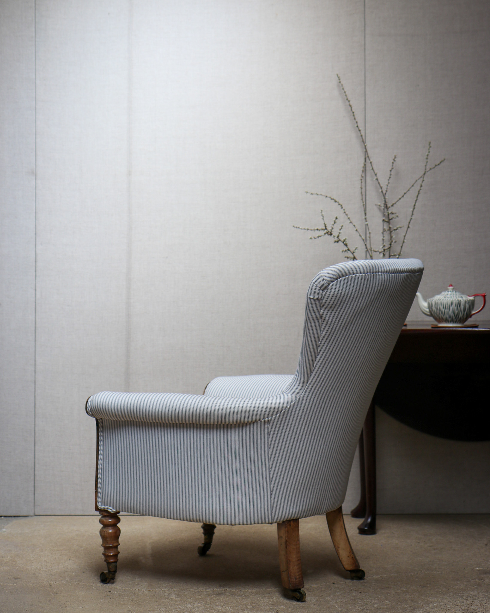 Early 19th century spoon-back deep seated armchair circa 1820 with carved rosewood show-wood on turned legs and brass castors. Traditionally upholstered and finished to classic stripe ticking with a feather and down seat cushion. All seating can be covered in fabric of own choosing.