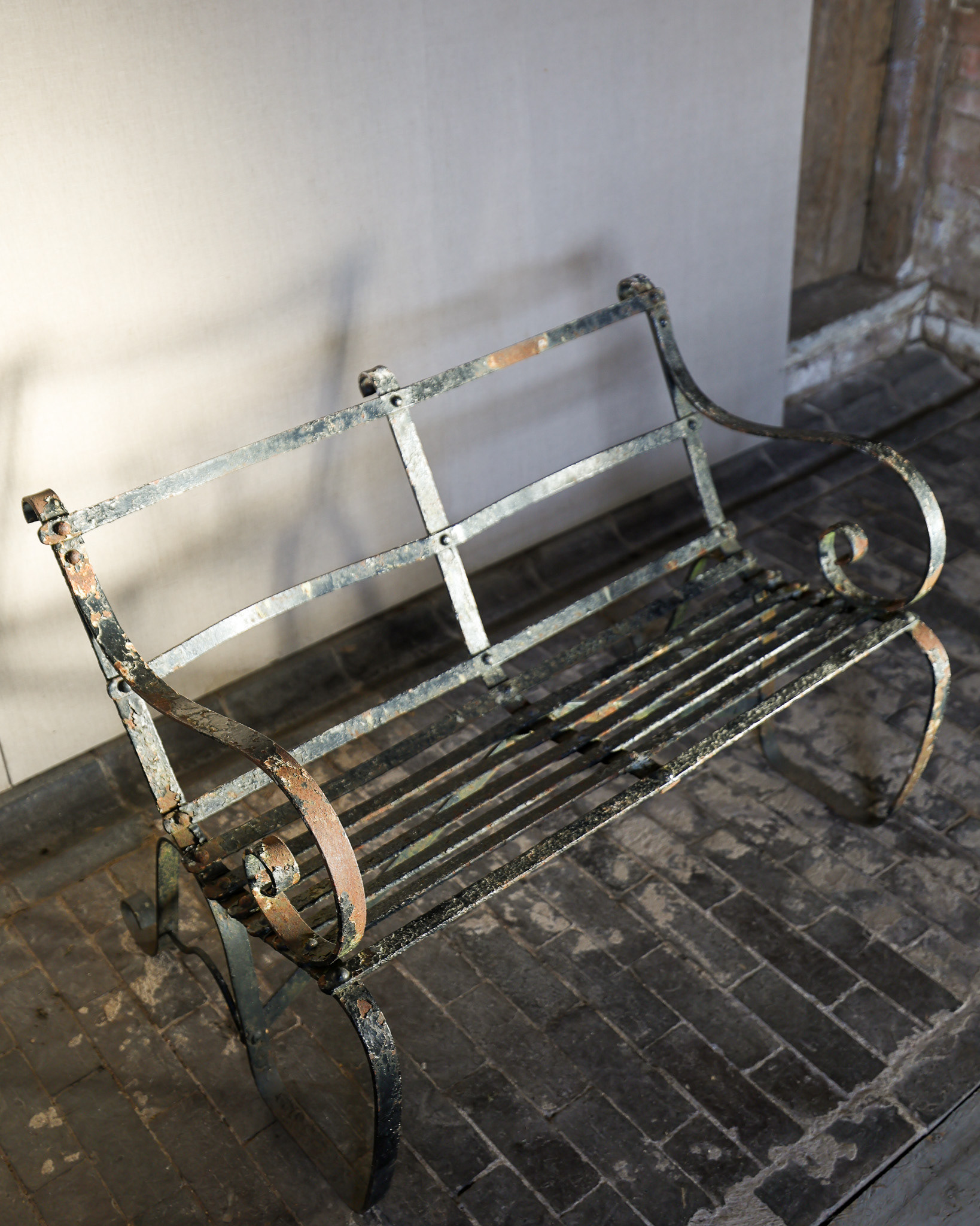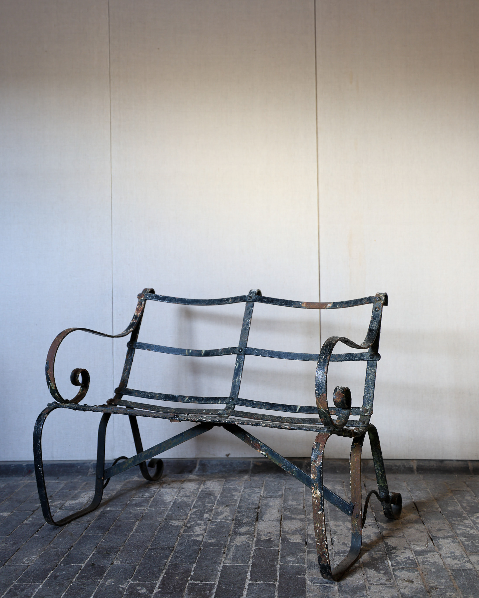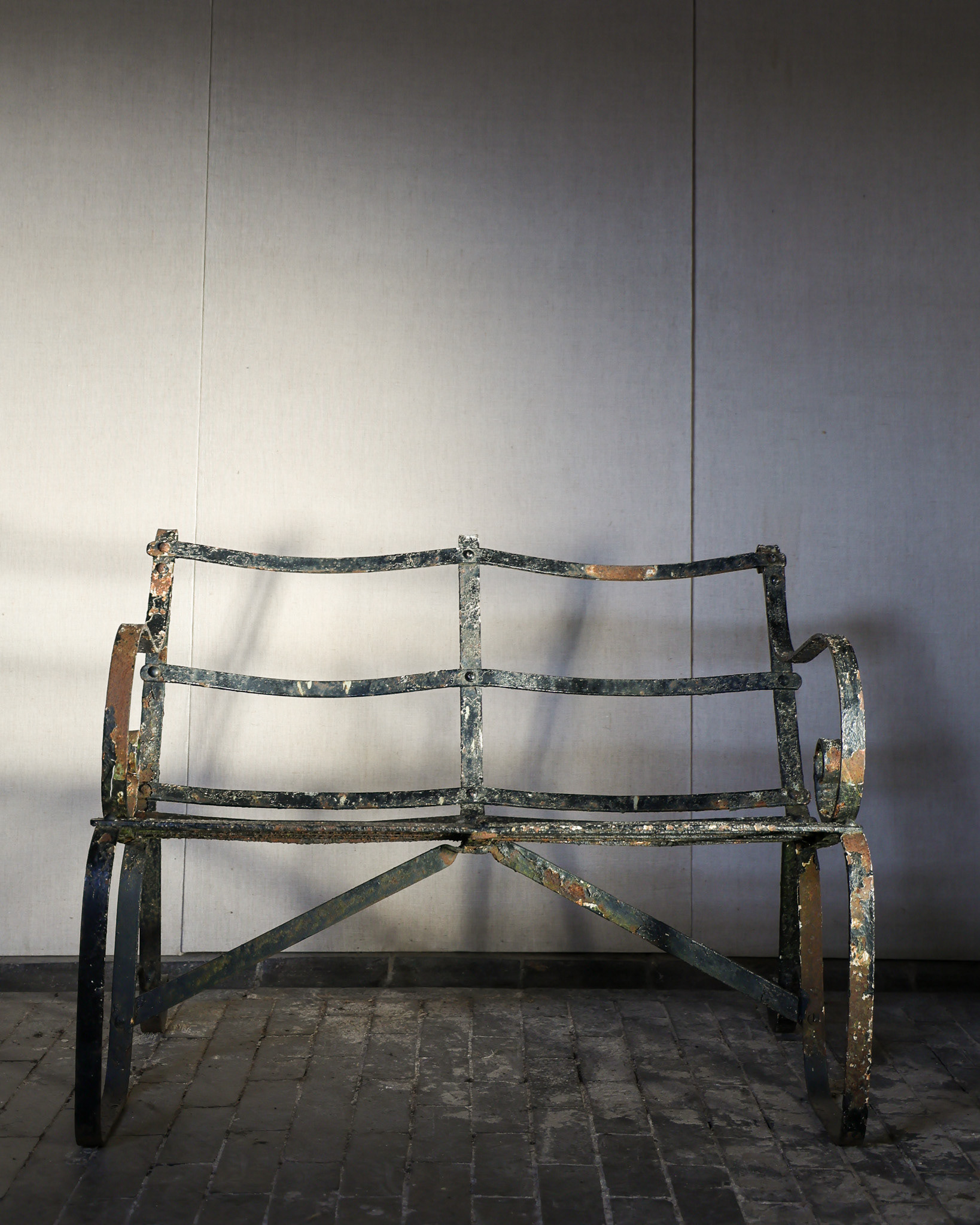Two seater strap work wrought iron garden bench with concave slung back and scrolls. Well proportioned and of impressive solid condition. Circa 1810. £1150