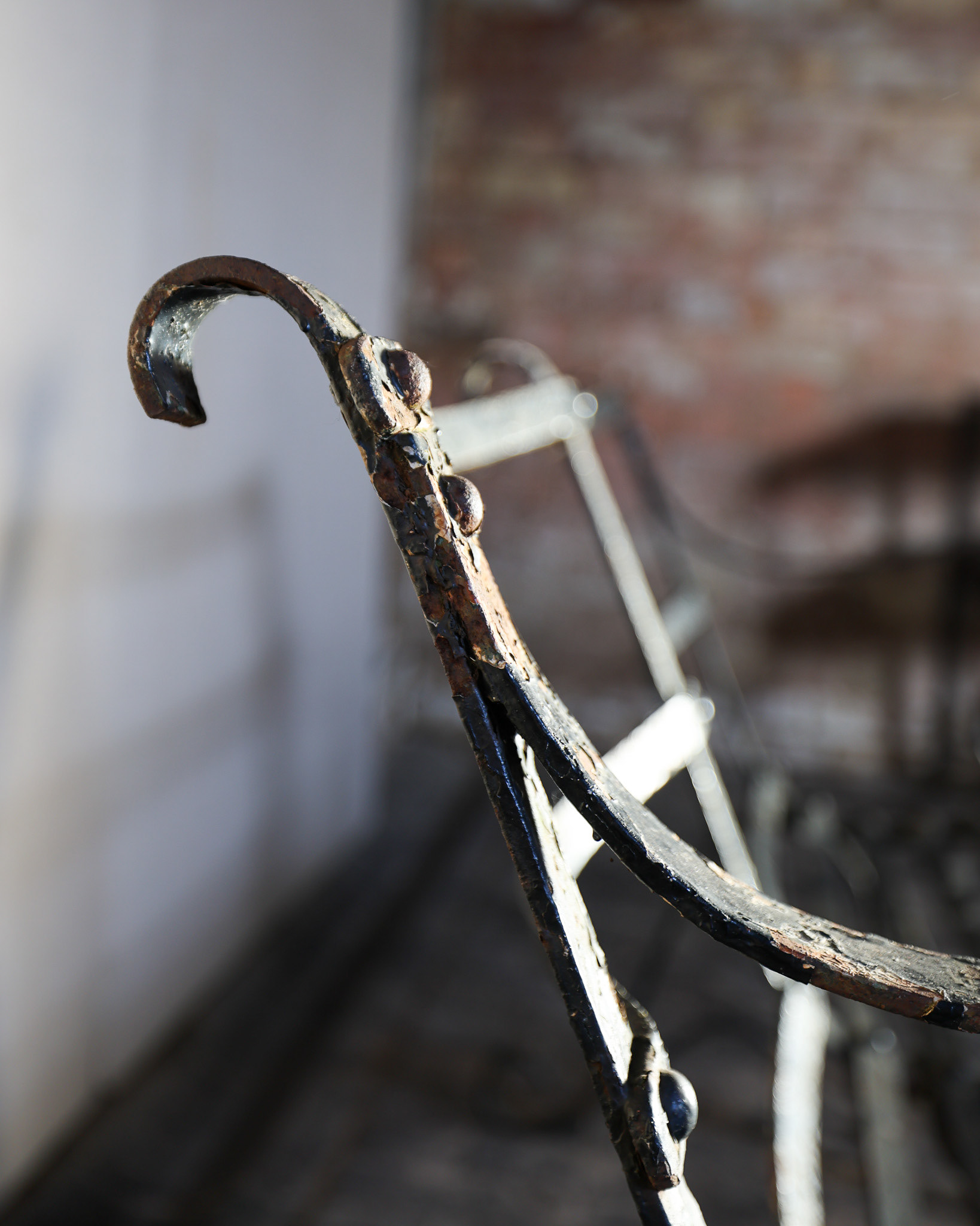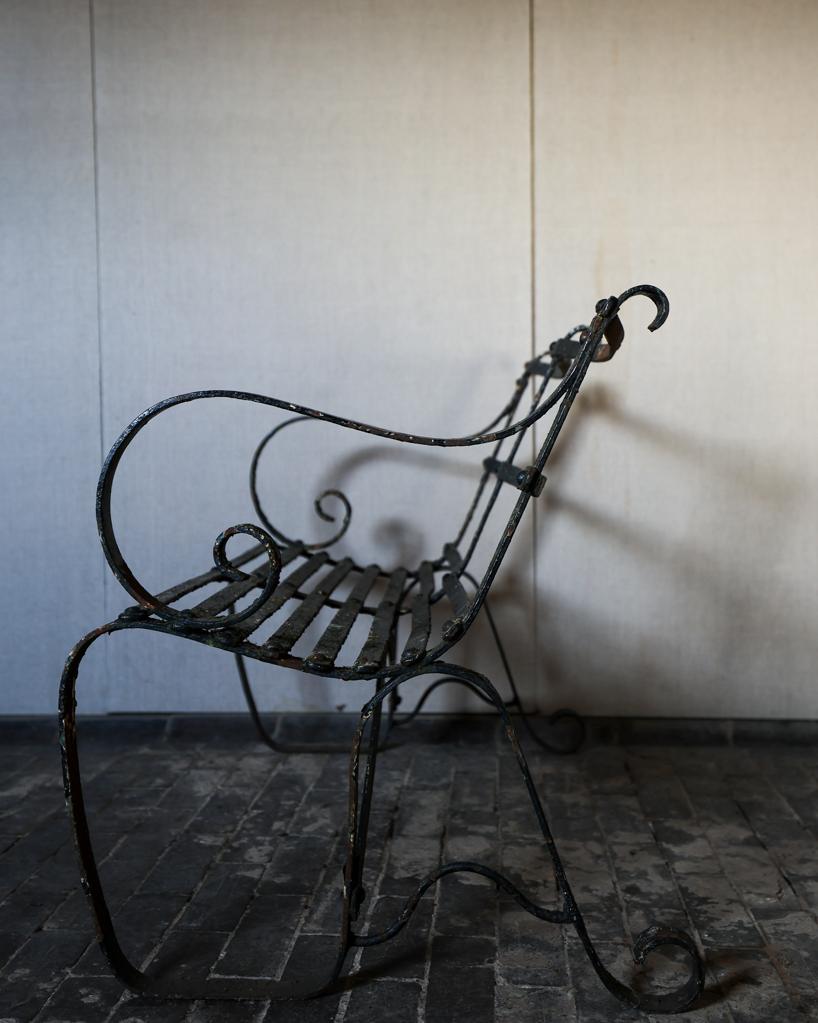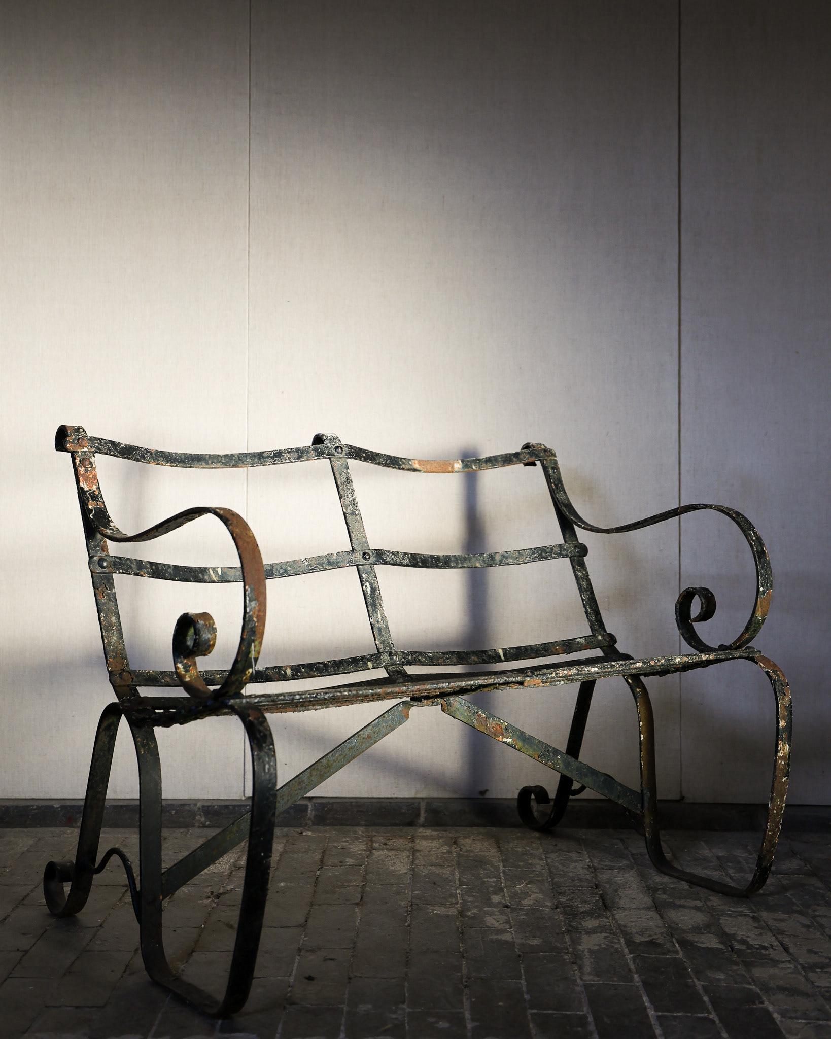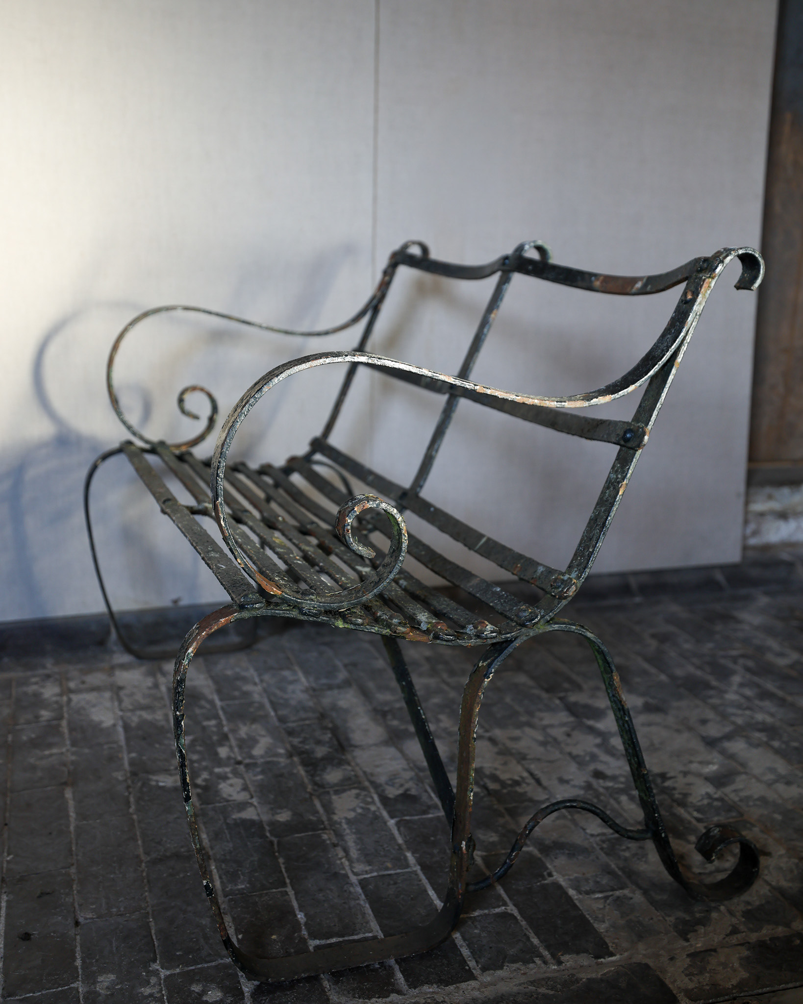 Two seater strap work wrought iron garden bench with concave slung back and scrolls. Well proportioned and of impressive solid condition. Circa 1810. £1150