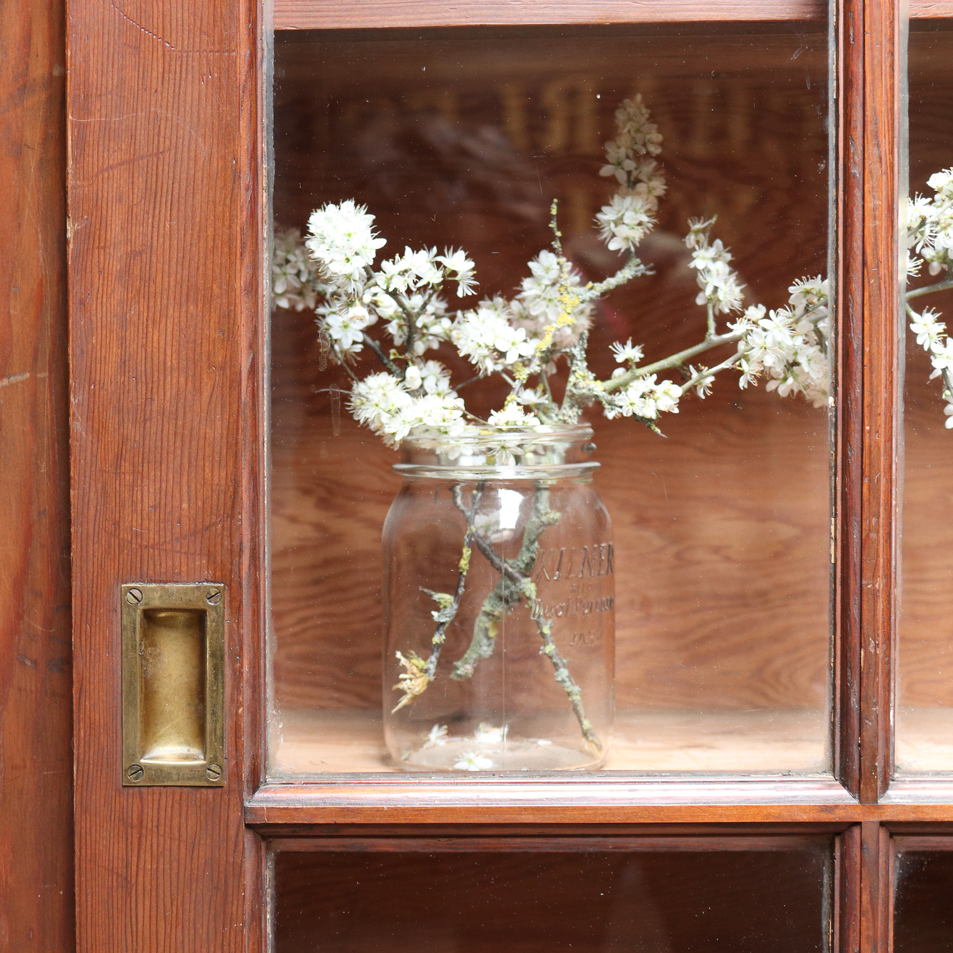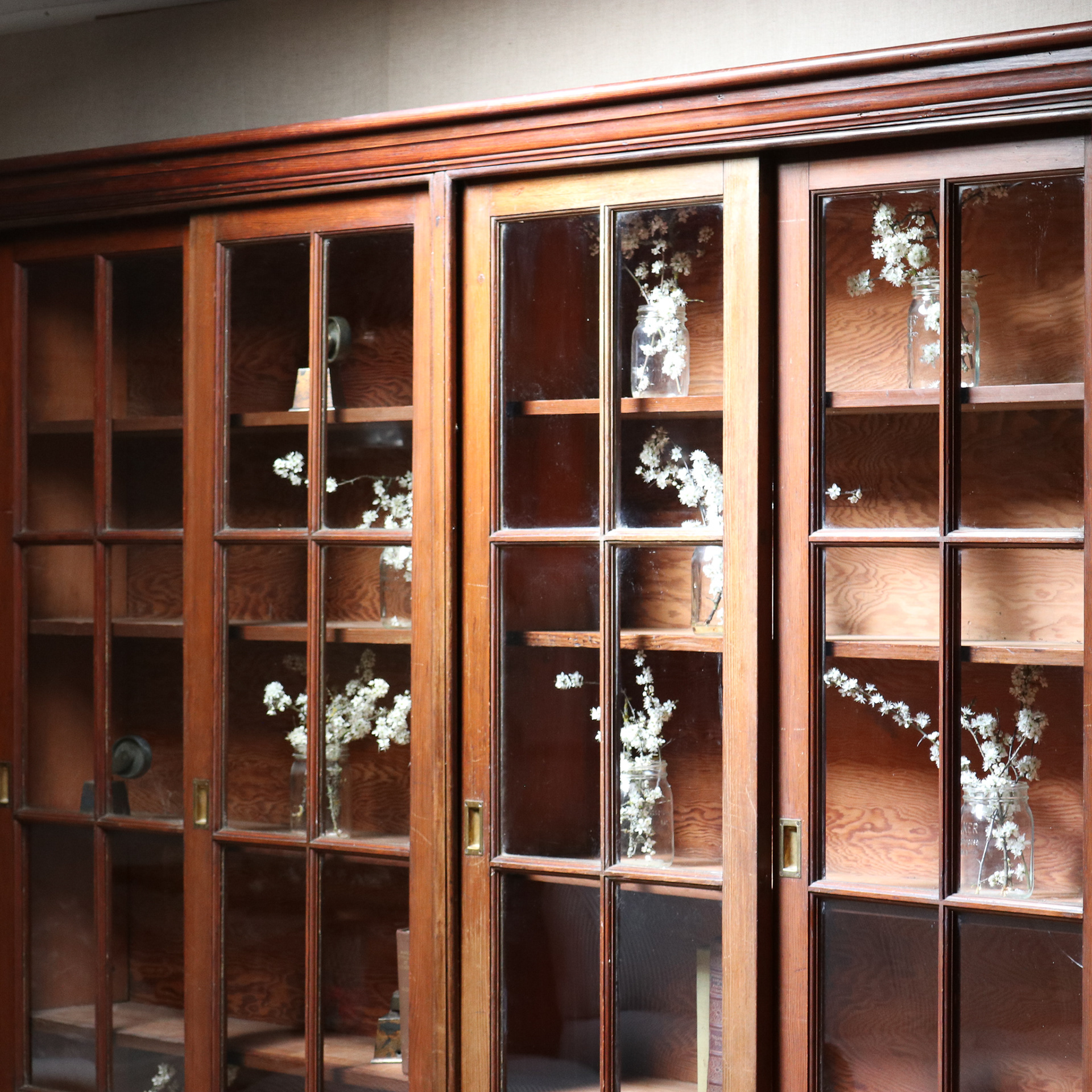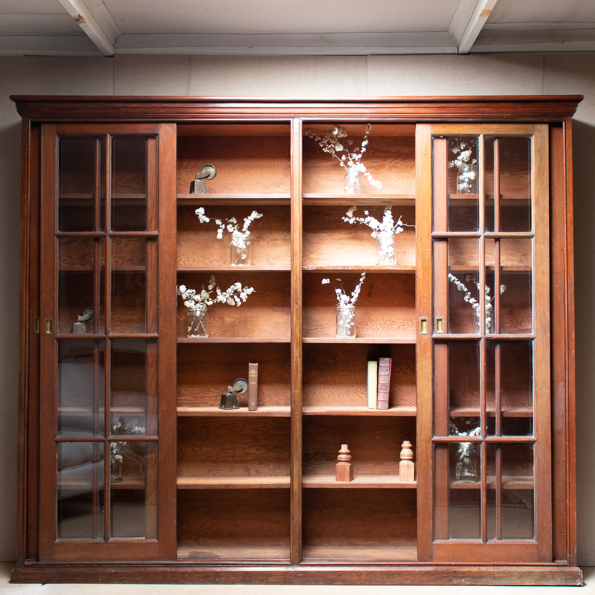 A large Edwardian bookcase with glazed sliding doors, brass finger plates and shelves with an internal Height of 30" or 31" and Depth of 10". Reassembly included plus delivery.