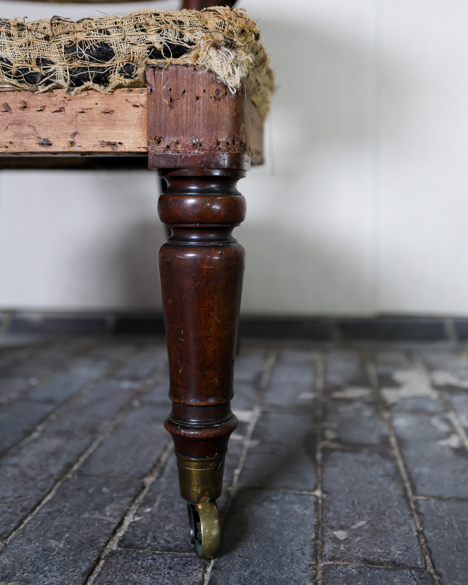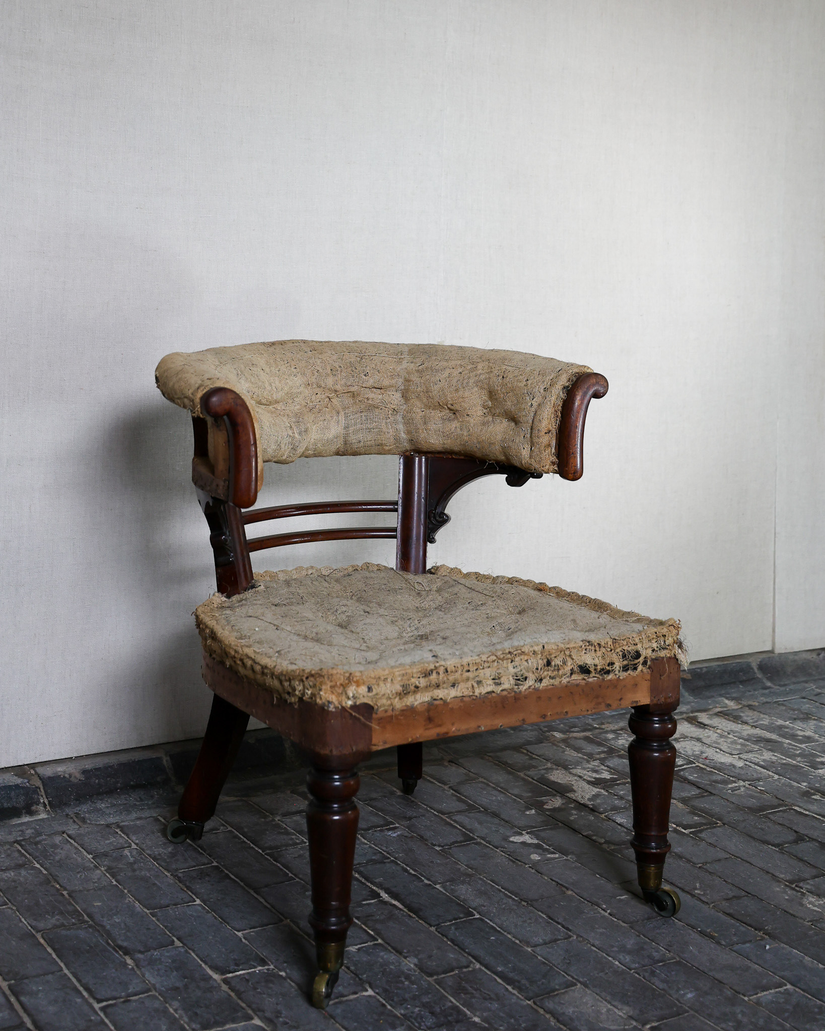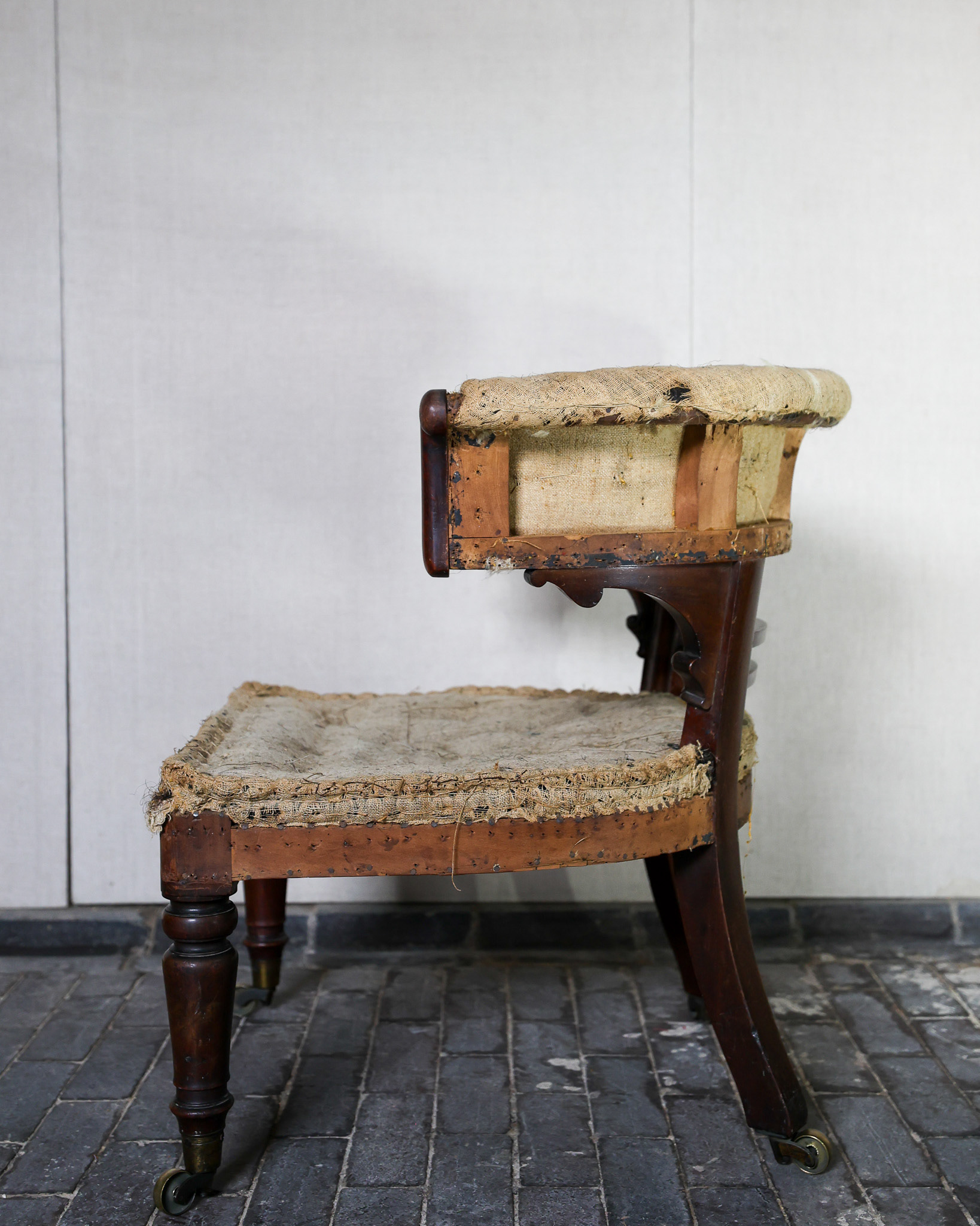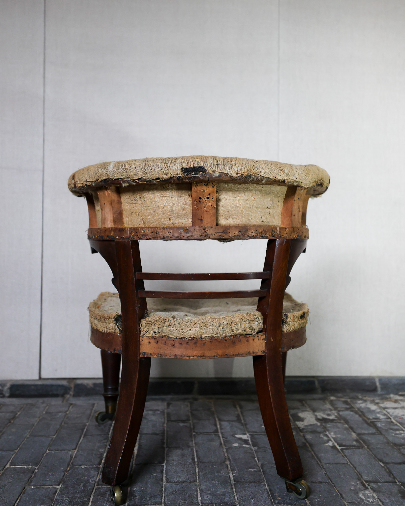 Early 19th Century horse-shoe back mahogany desk chair. Attributed to Holland & Son's with journey mans stamp H.M to underside. Available as seen £1500 or re-upholstered £2100 plus 3 meters of material.
