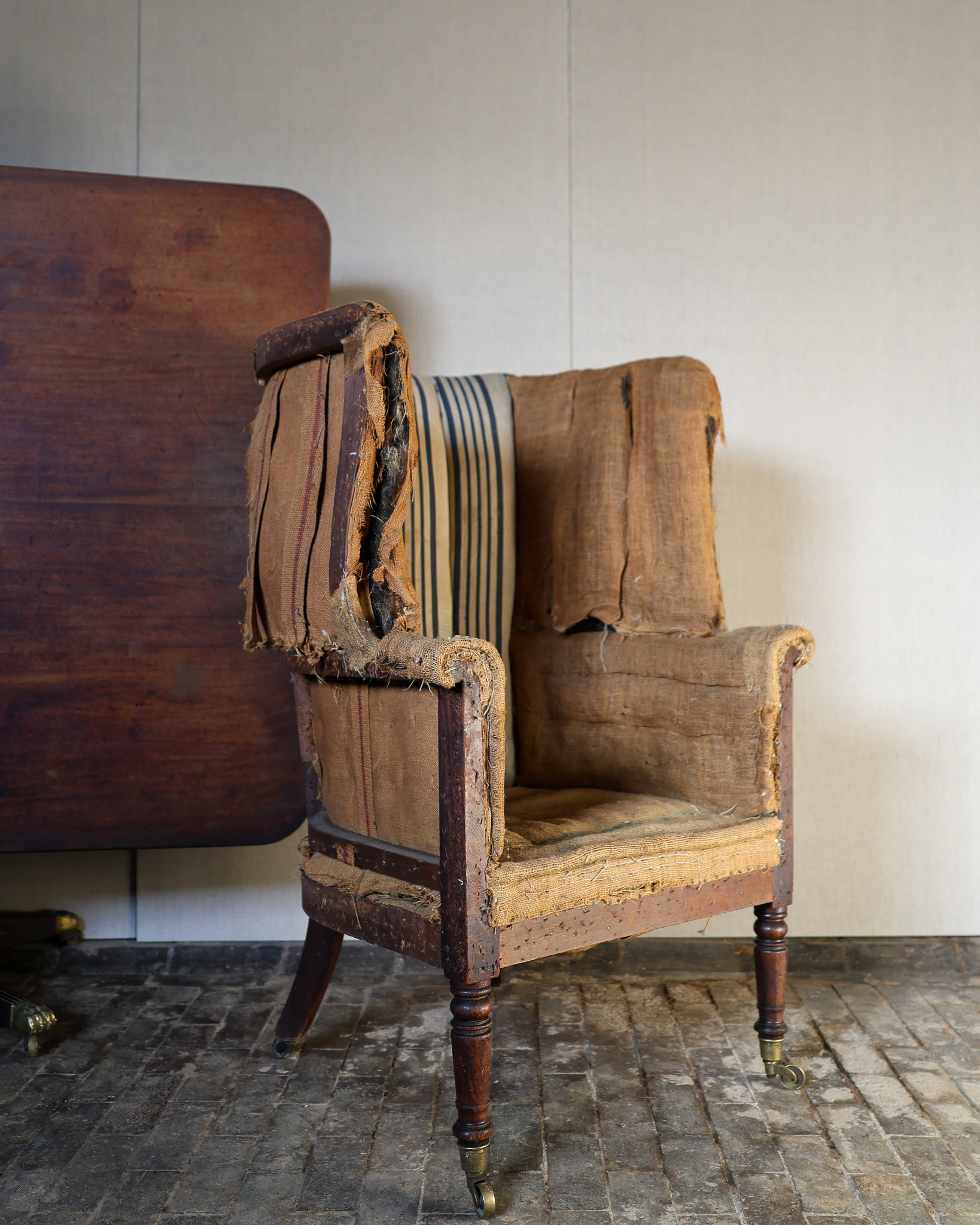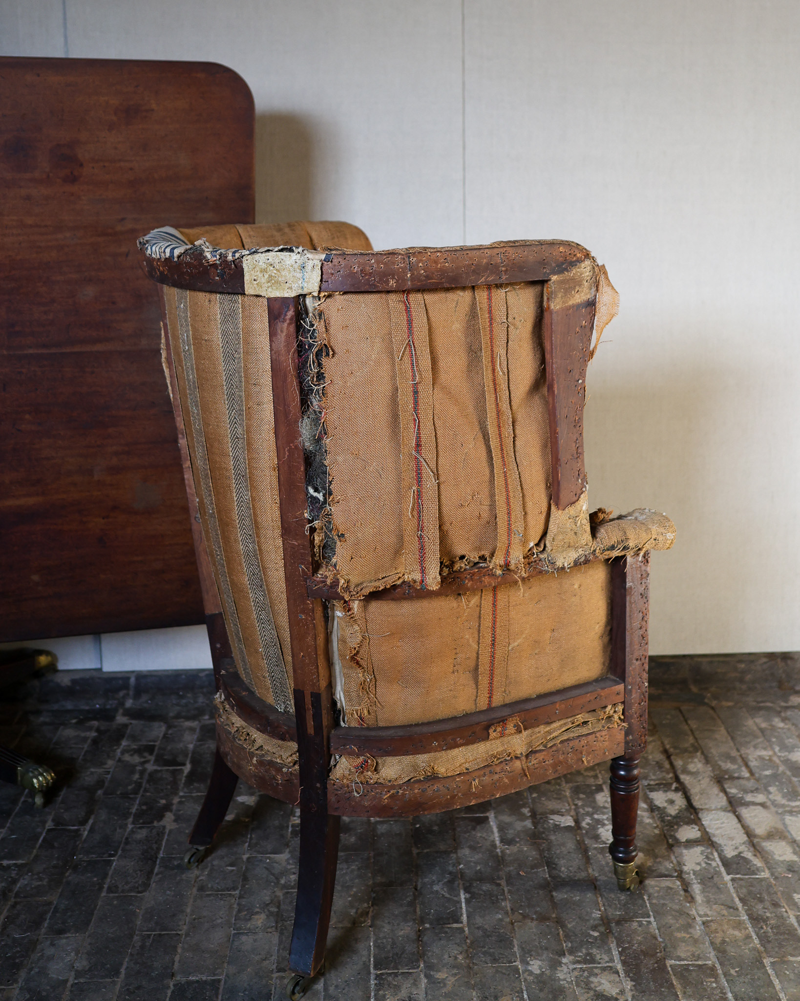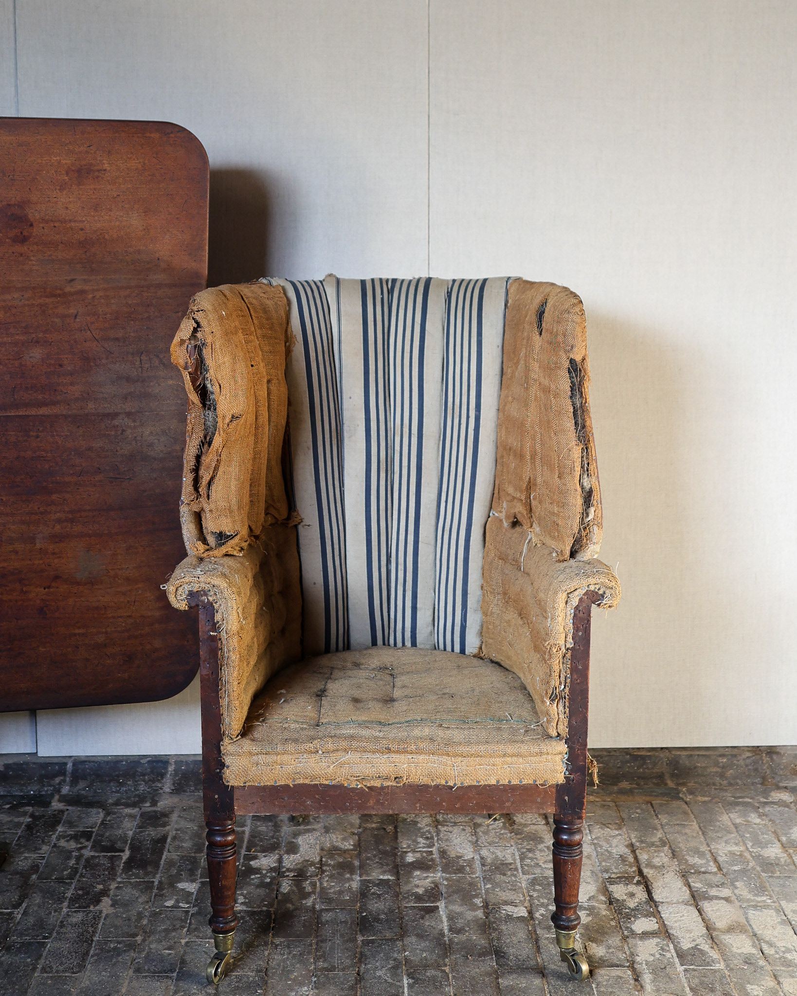 George III barrel-back wing armchair terminating on turned mahogany legs, brass caps and castors. Original fluted horsehair stuffed upholstery. Circa 1800.