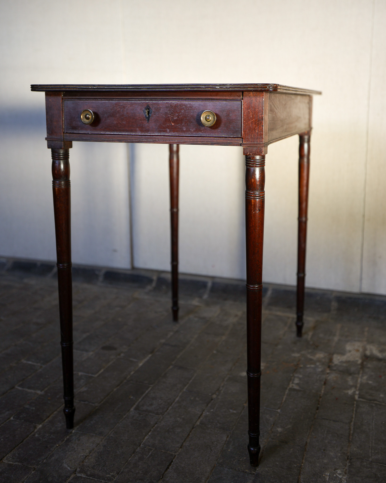 Elegantly proportioned George III mahogany side table with two drawers and brass knobs. Circa 1790. Structurally solid. £1800