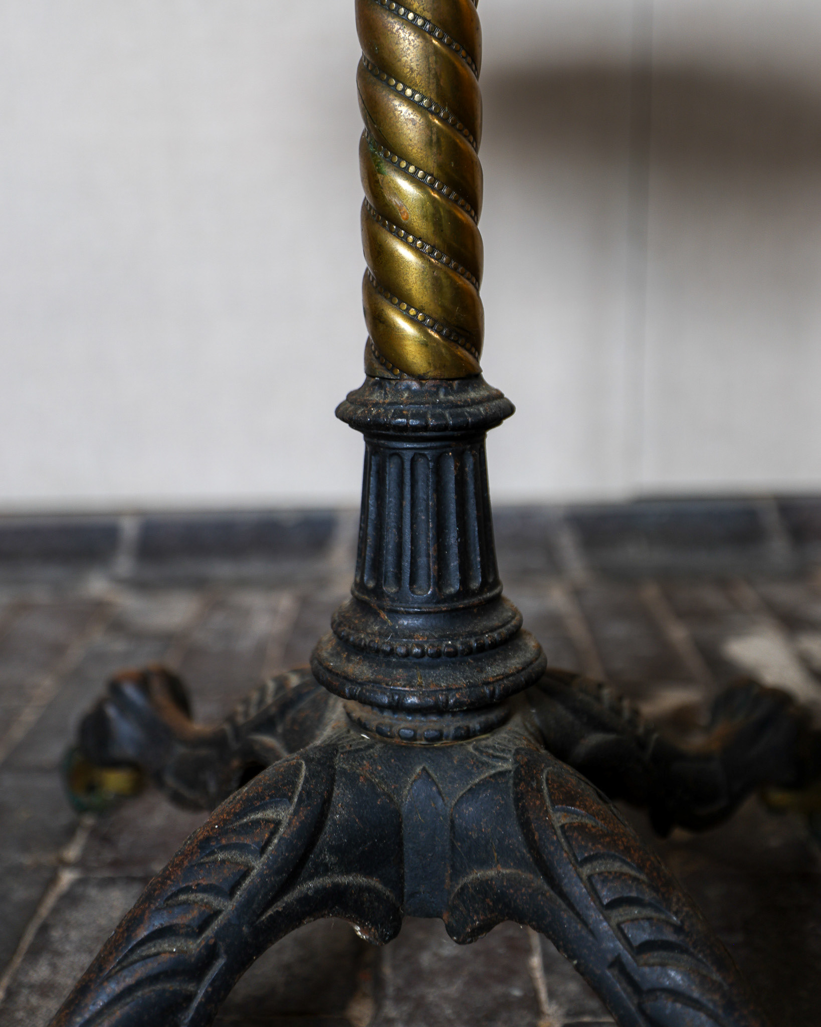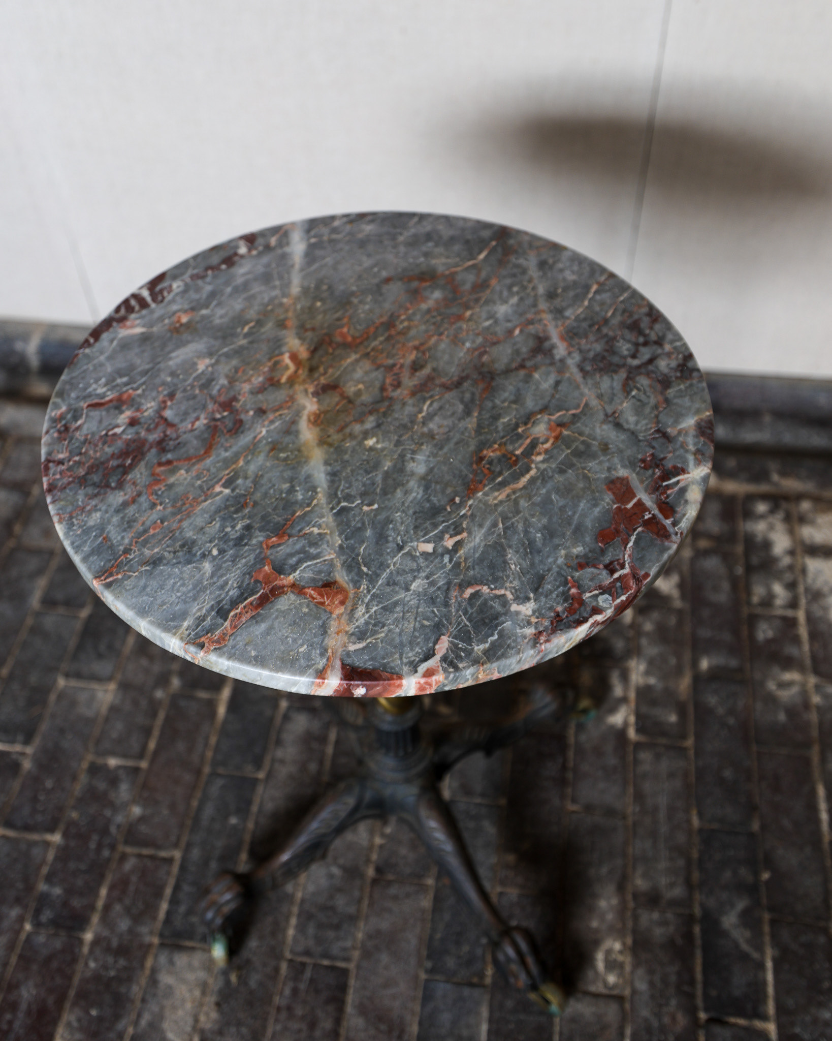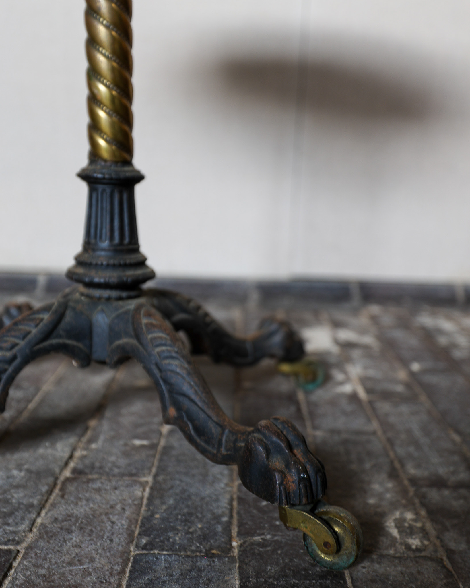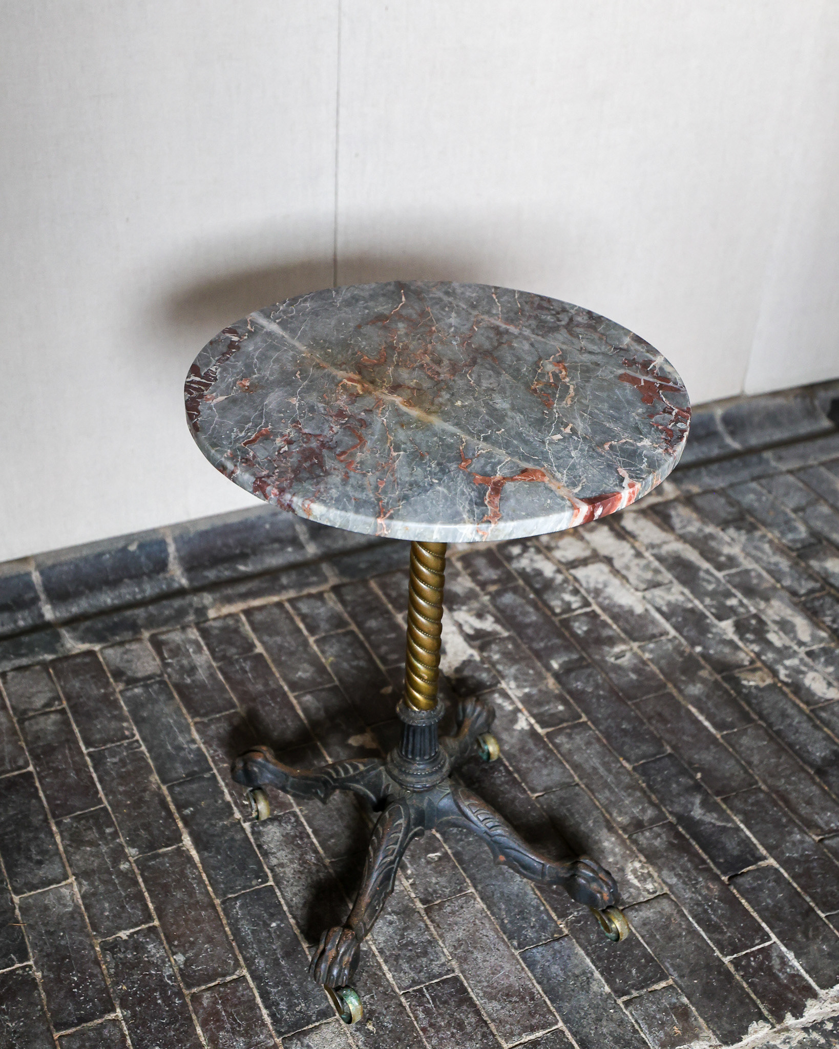 Marble topped cast-iron quadruped base with paw feet and brass castors. £680