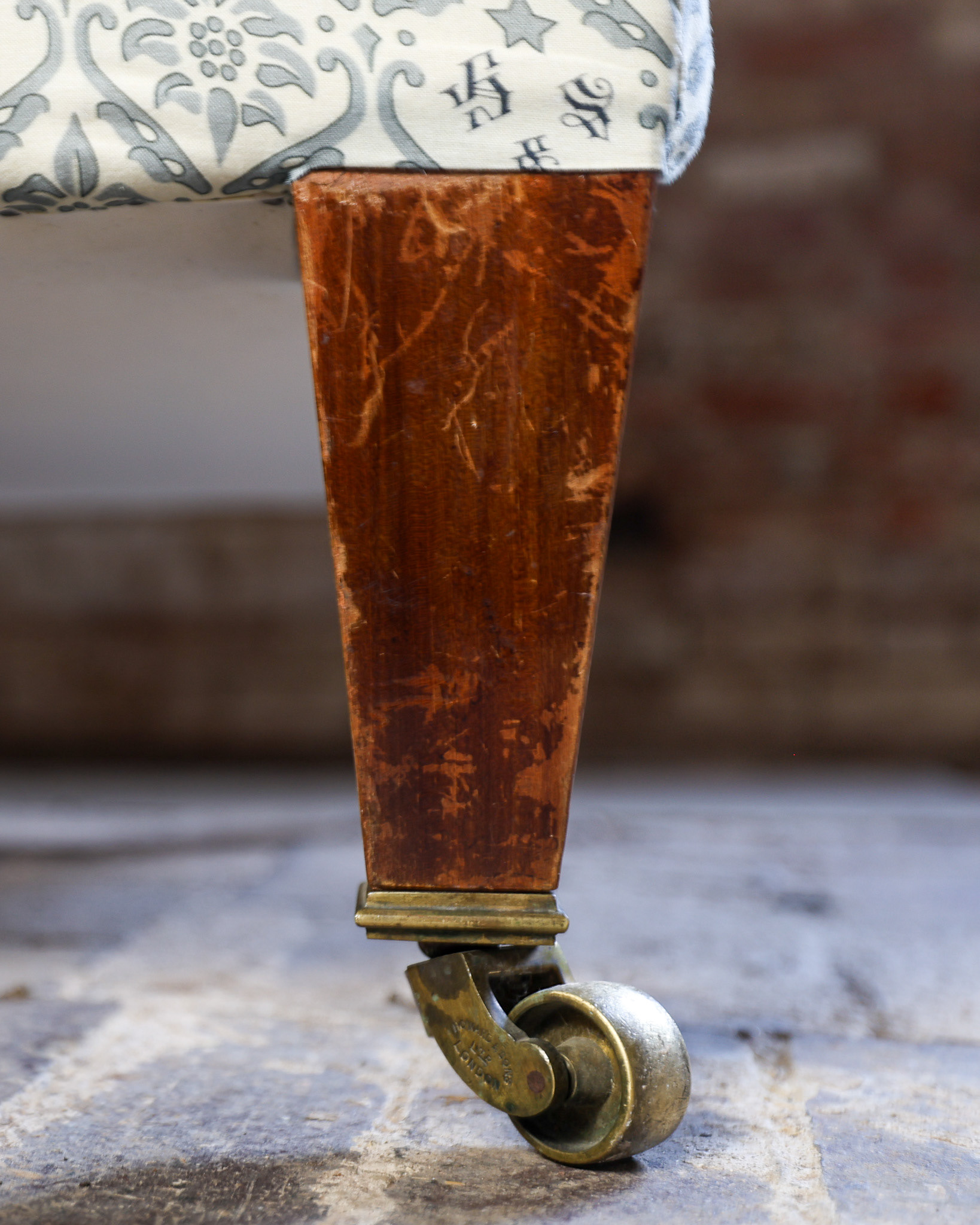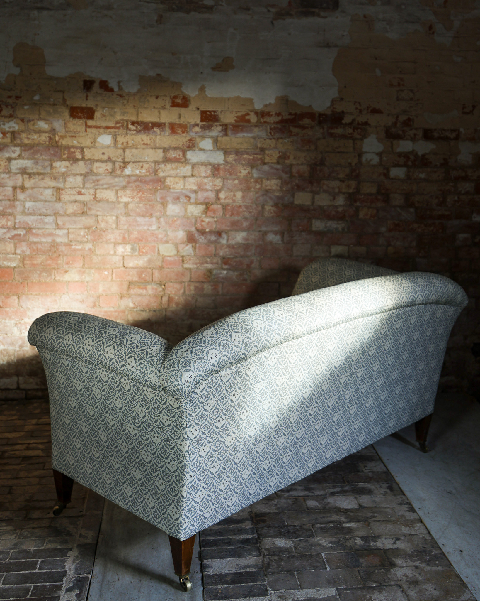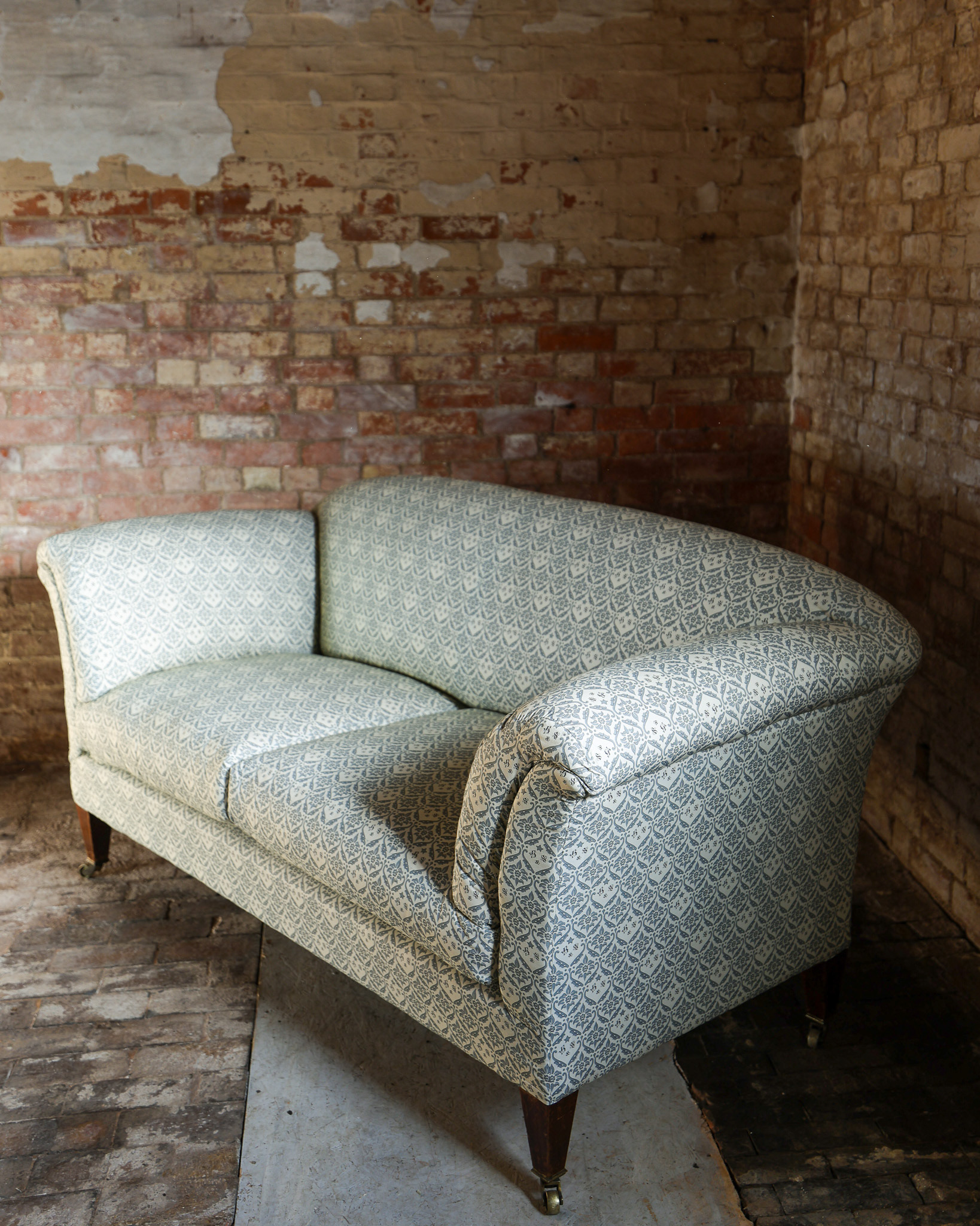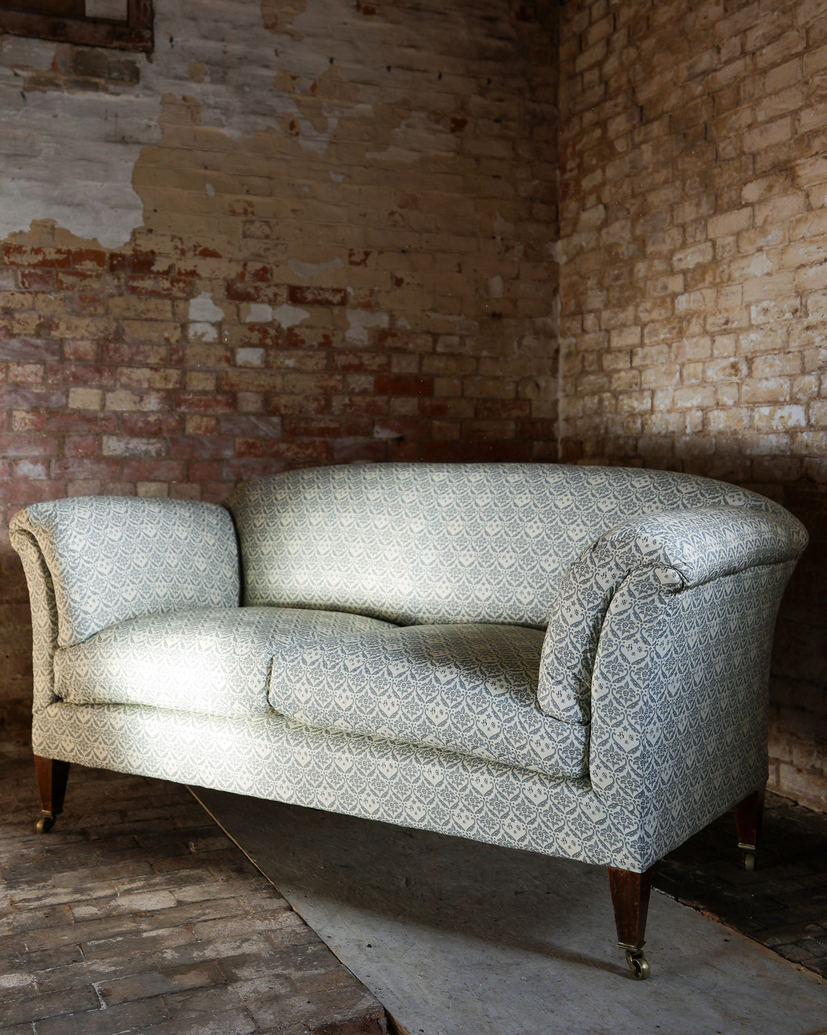 Portdarlington sofa on tapering walnut legs and brass castors. Circa 1900. Tight birch wood frame of exceptional condition, completely re-upholstered frame up using only the finest materials, jute webbing, horsehair, fustian pure down cushions and finished in H&S monogram ticking. Available as seen £22,500.