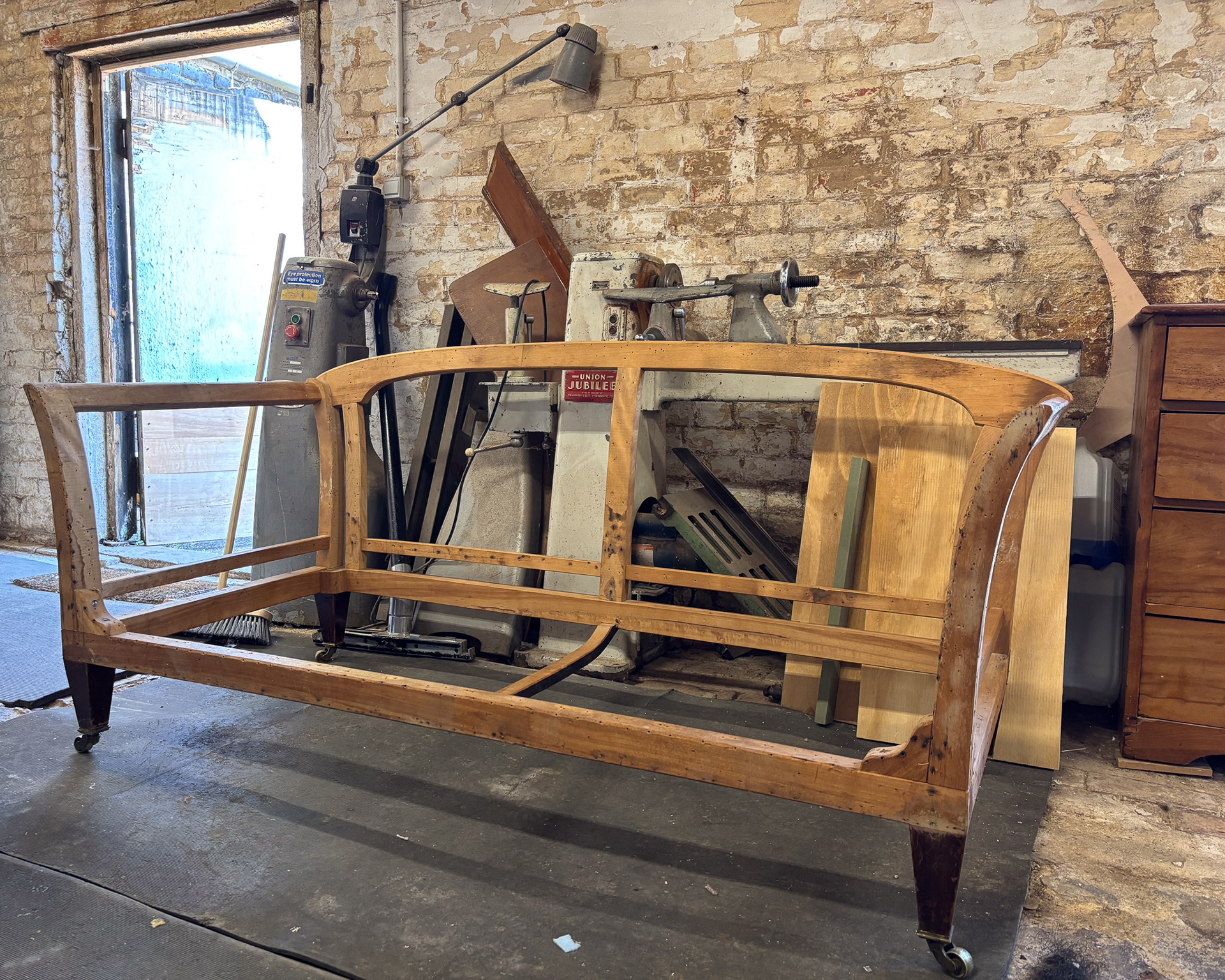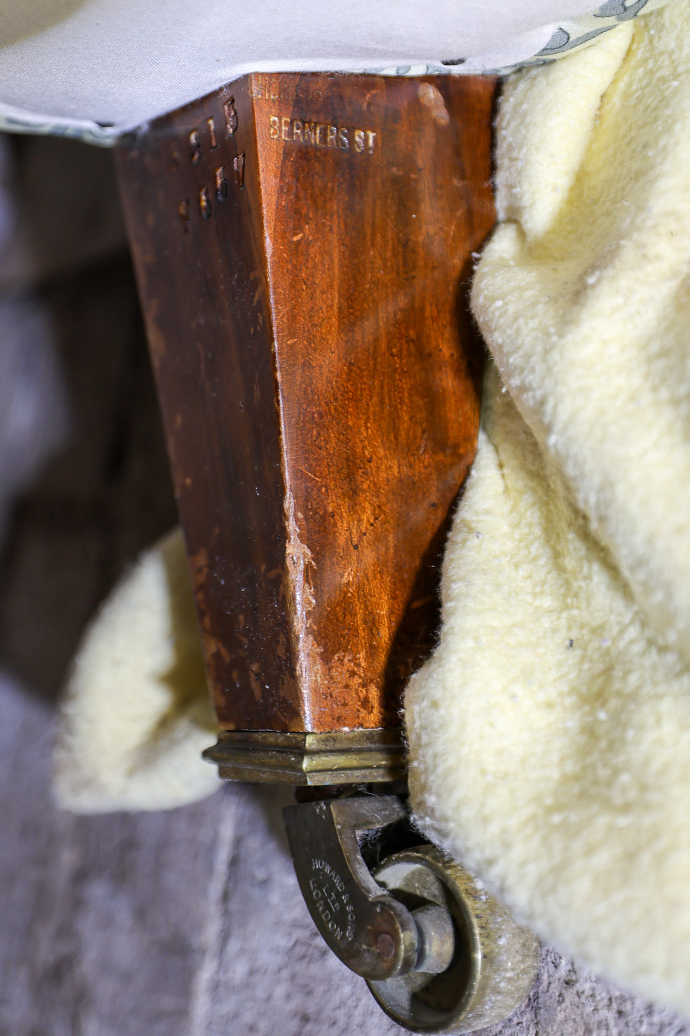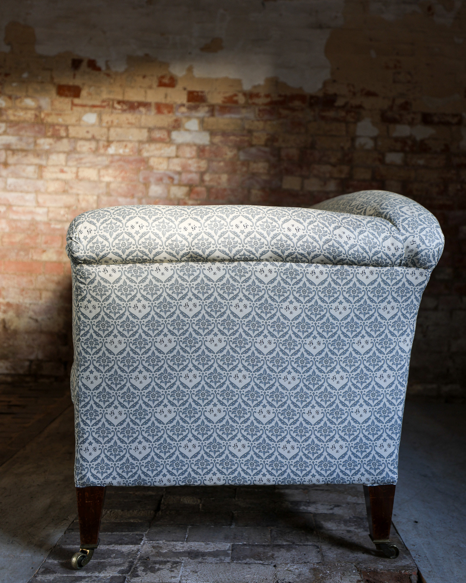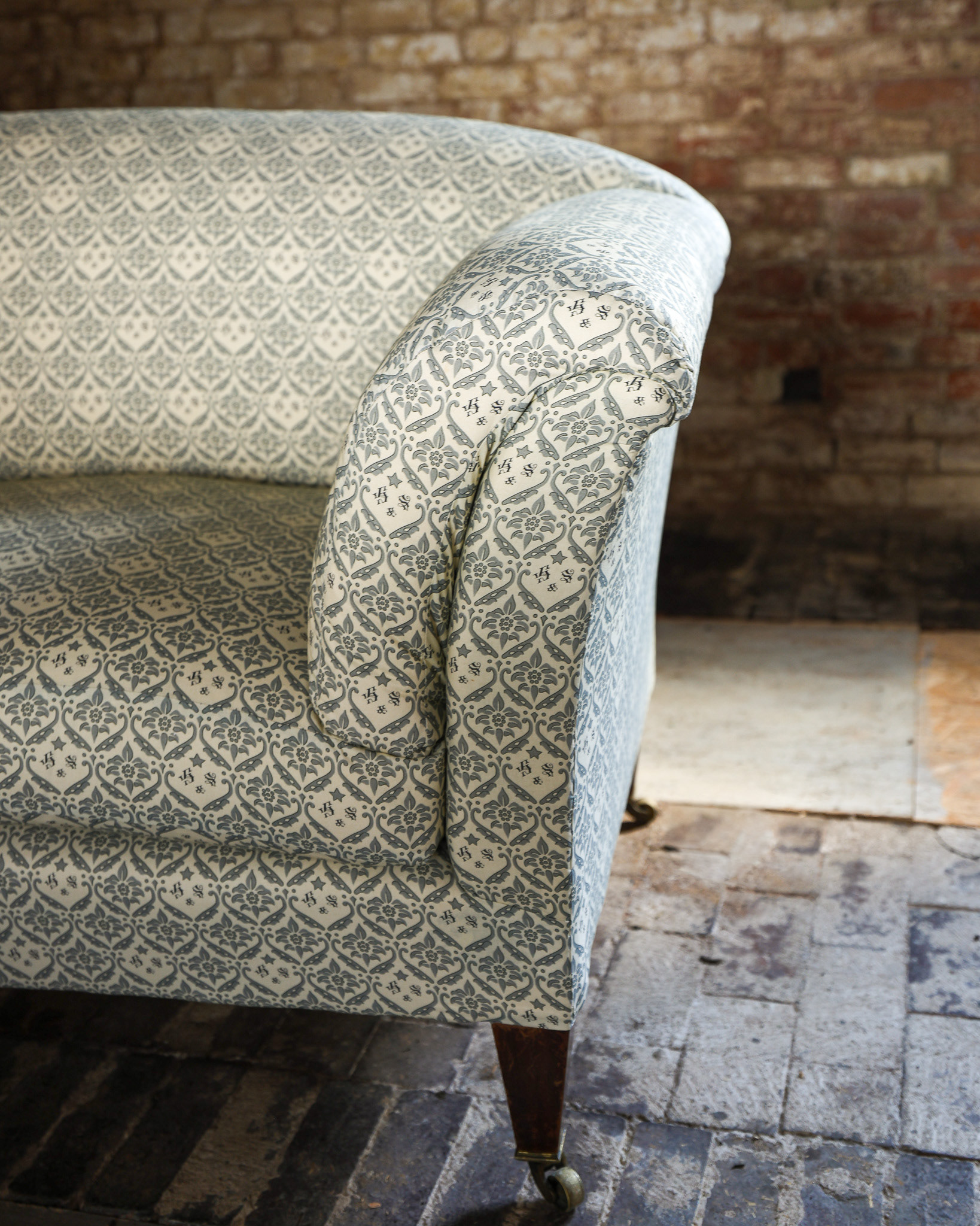 Portdarlington sofa on tapering walnut legs and brass castors. Circa 1900. Tight birch wood frame of exceptional condition, completely re-upholstered frame up using only the finest materials, jute webbing, horsehair, fustian pure down cushions and finished in H&S monogram ticking. Available as seen £22,500.