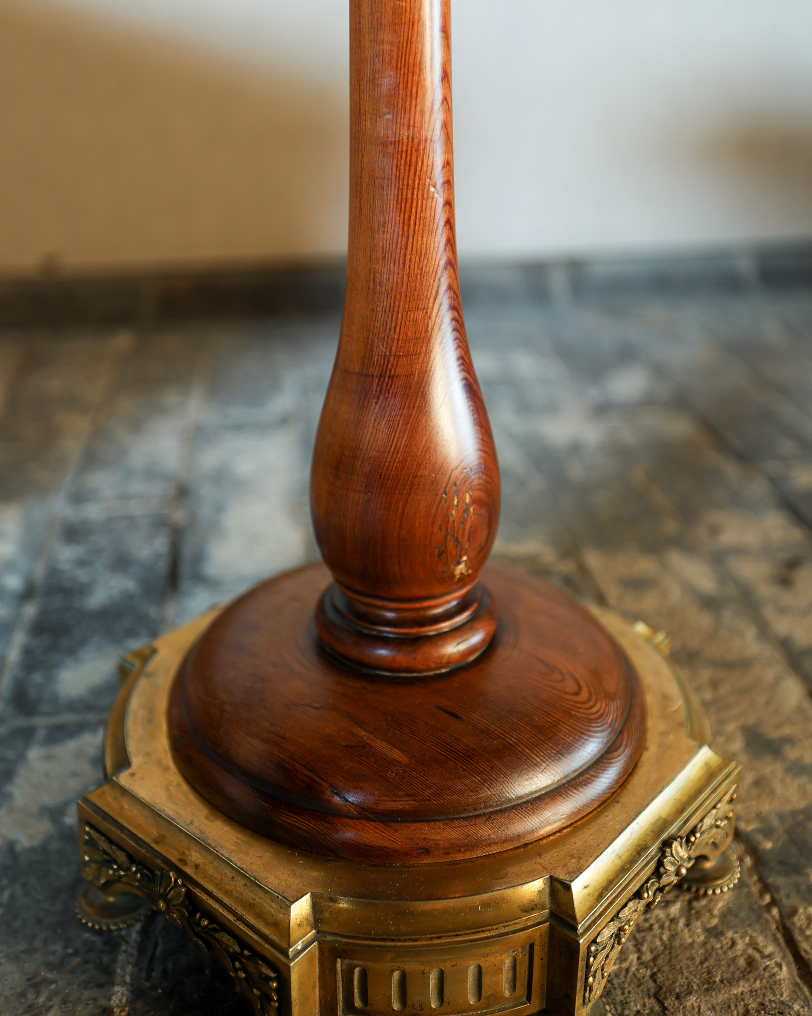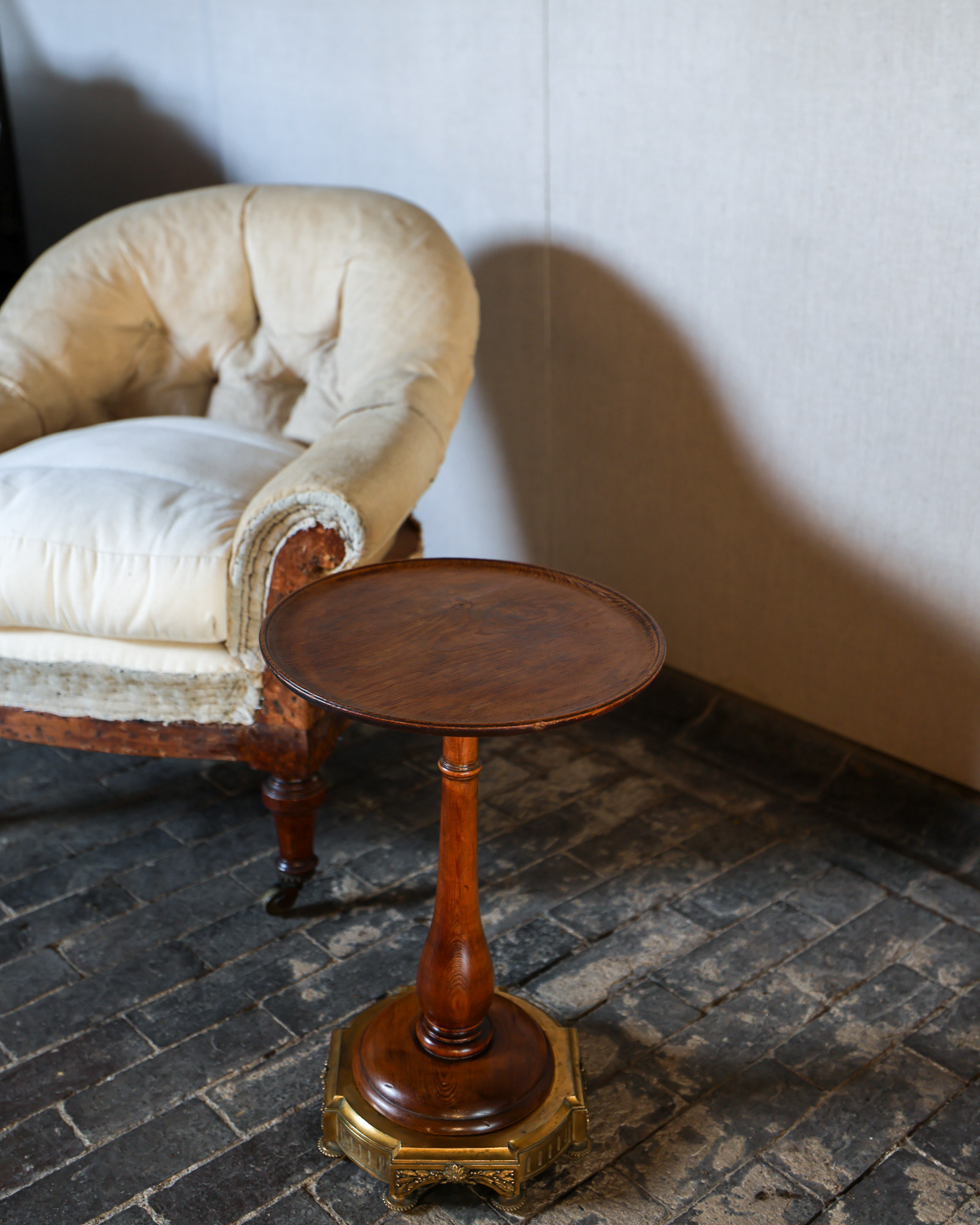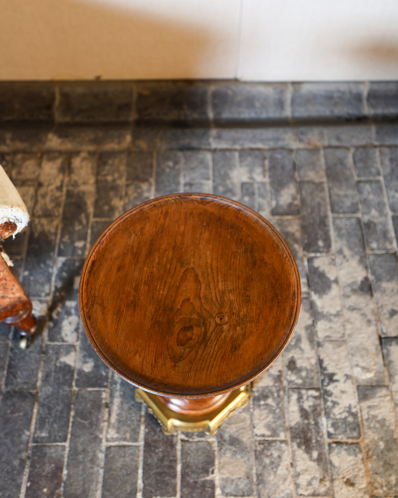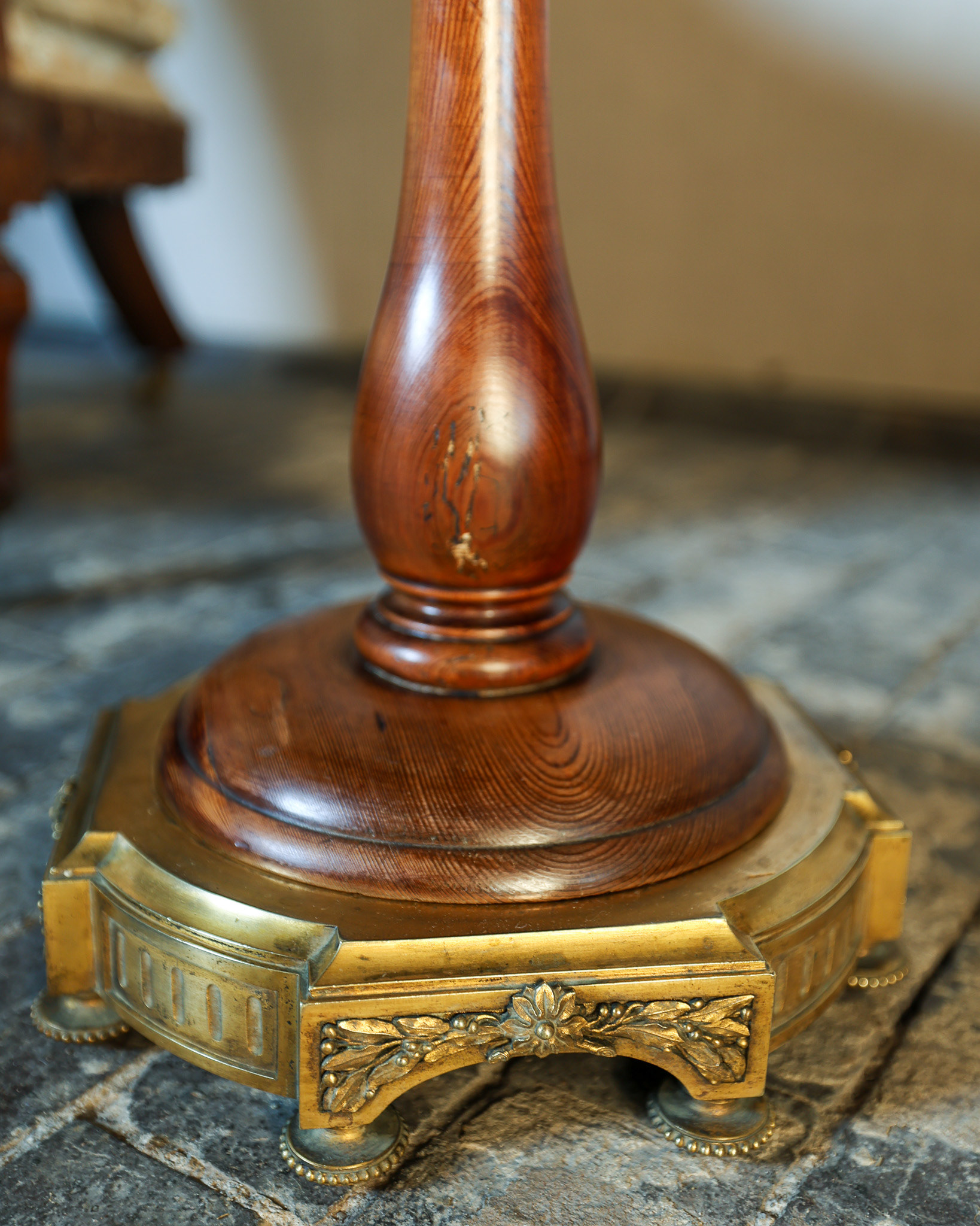 Small proportioned yew-wood pedestal table, ring turned support, octagonal gilt brass metal bass with foliated decoration. Circa 1890. Now available £680.