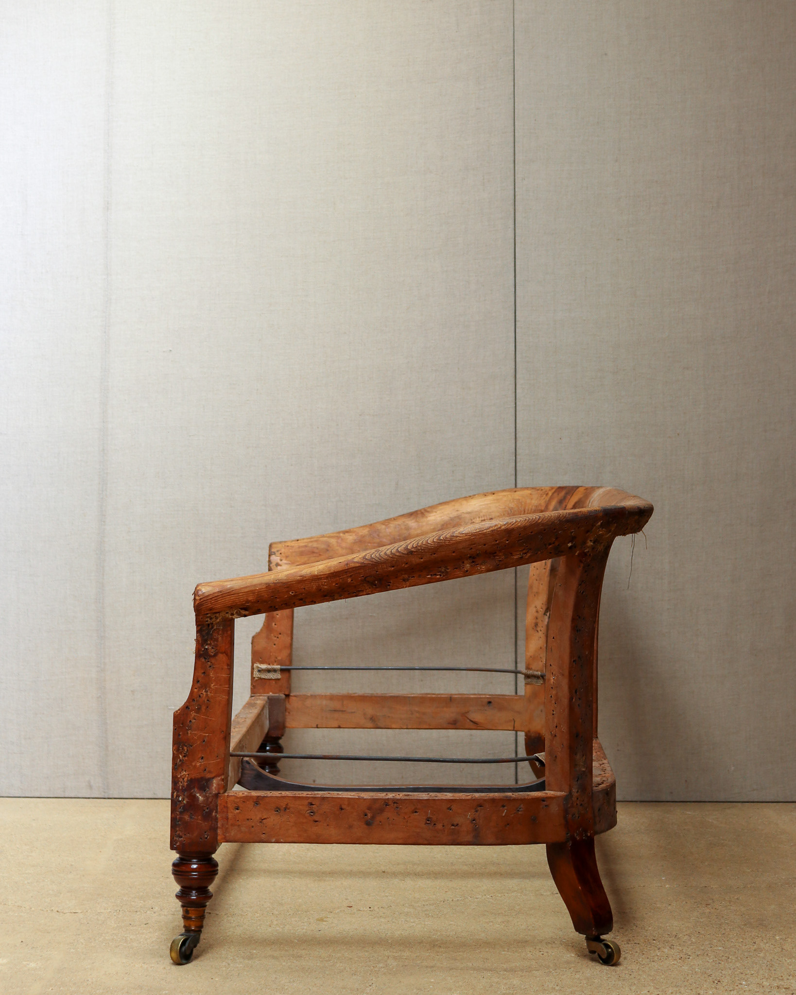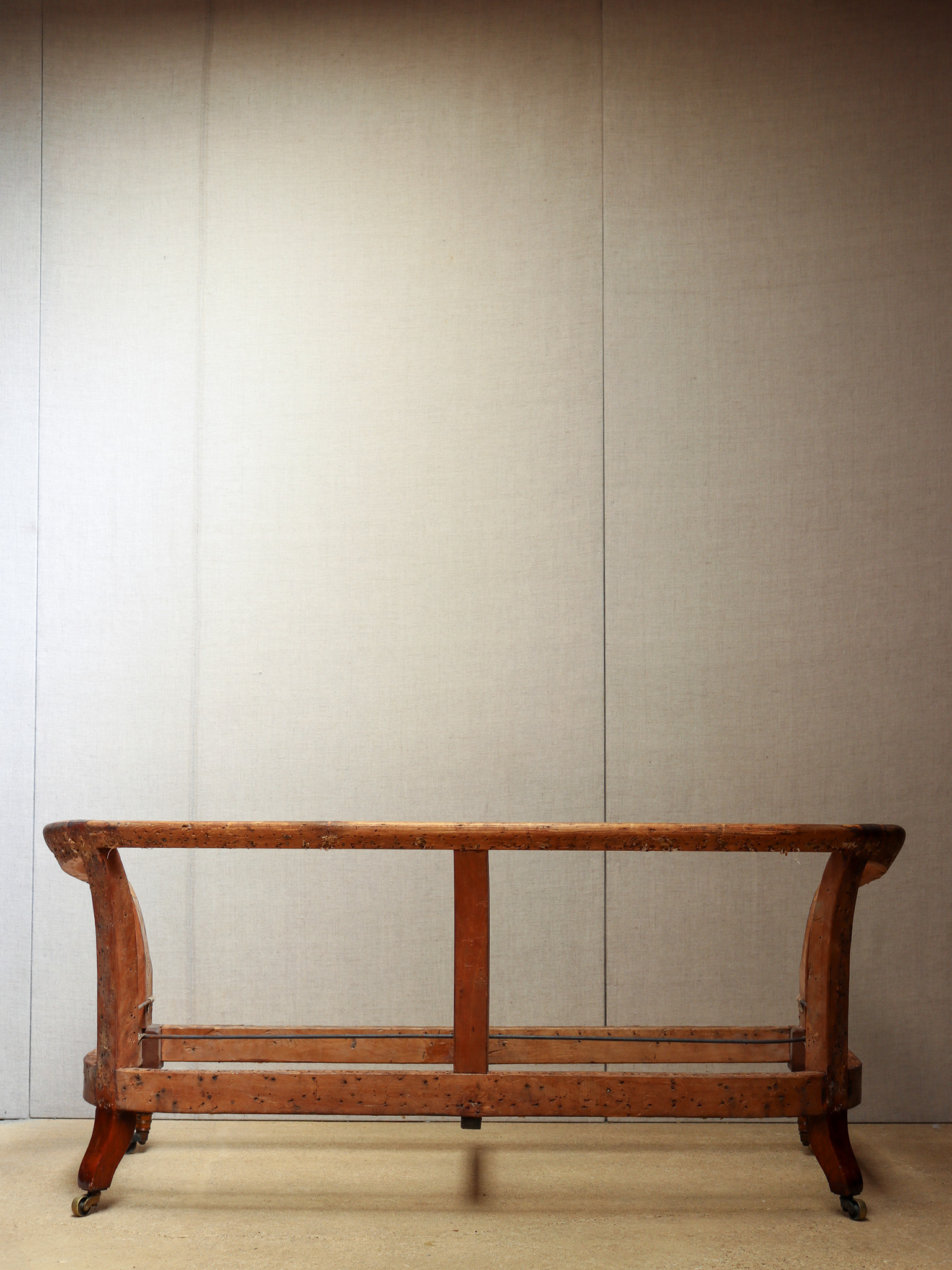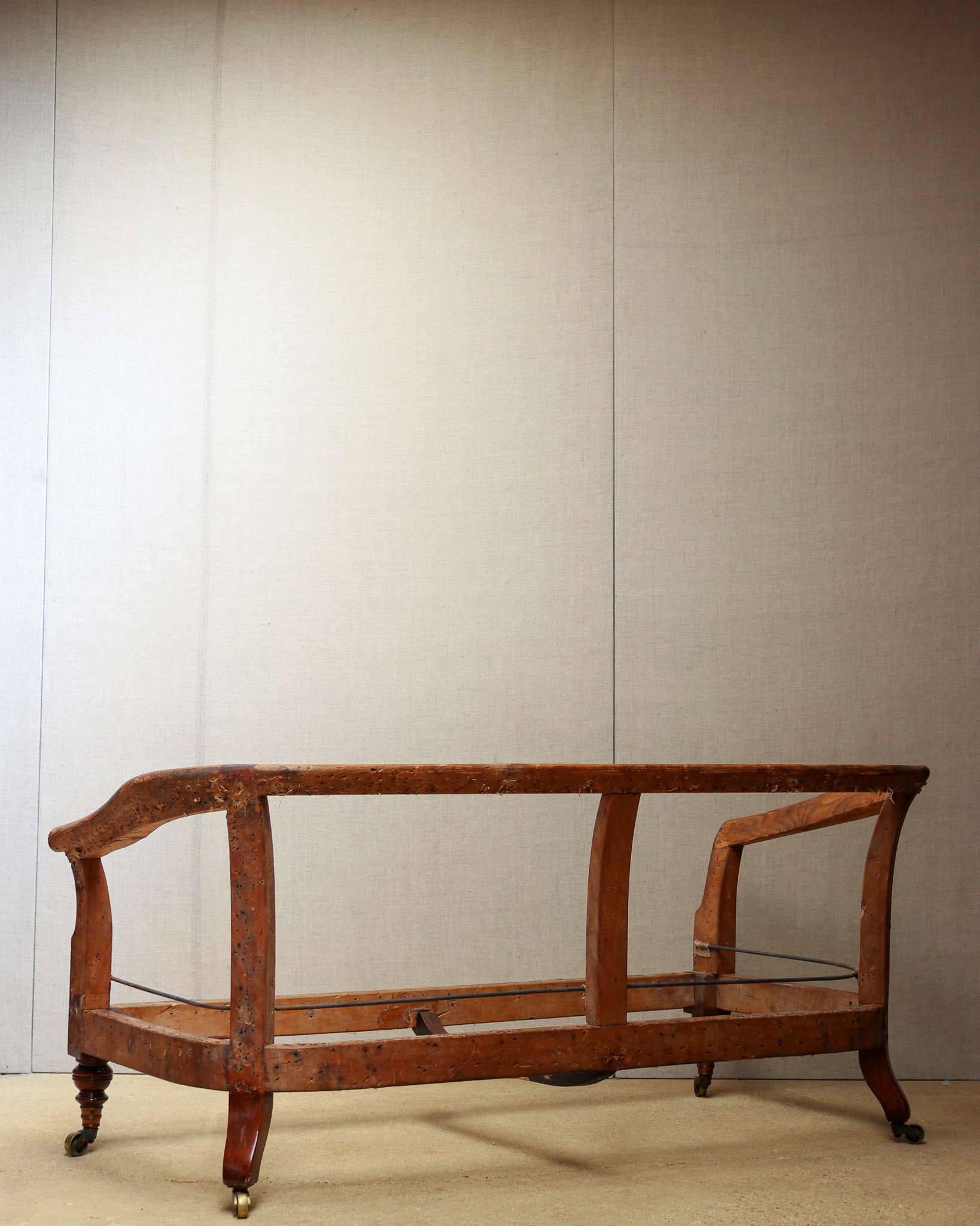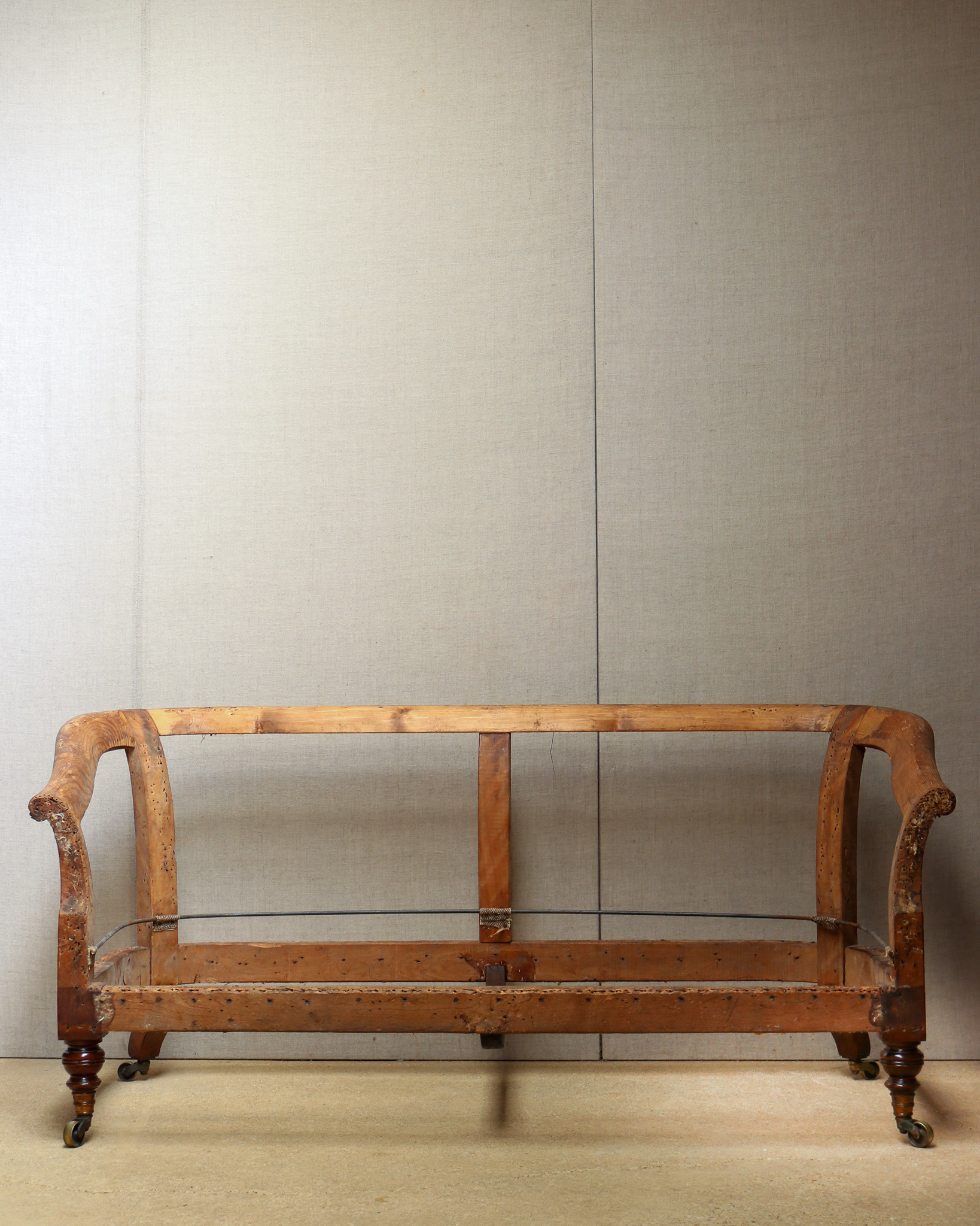 Small buttoned sofa by Howard & Sons. This being the Lloyd model terminating on mahogany legs and lacquered brass castors. Fully stamped and with paper label to underside counter stretcher.
