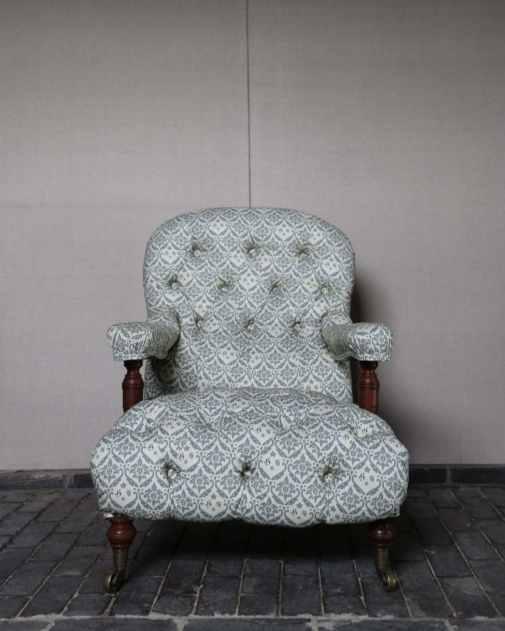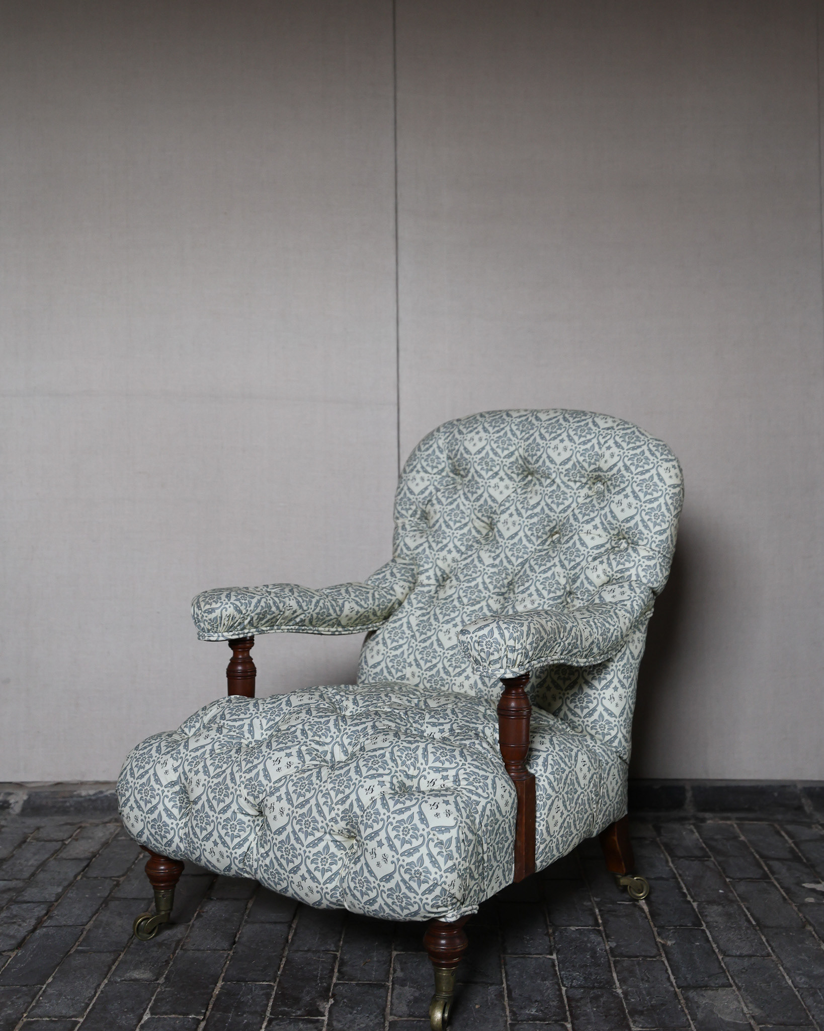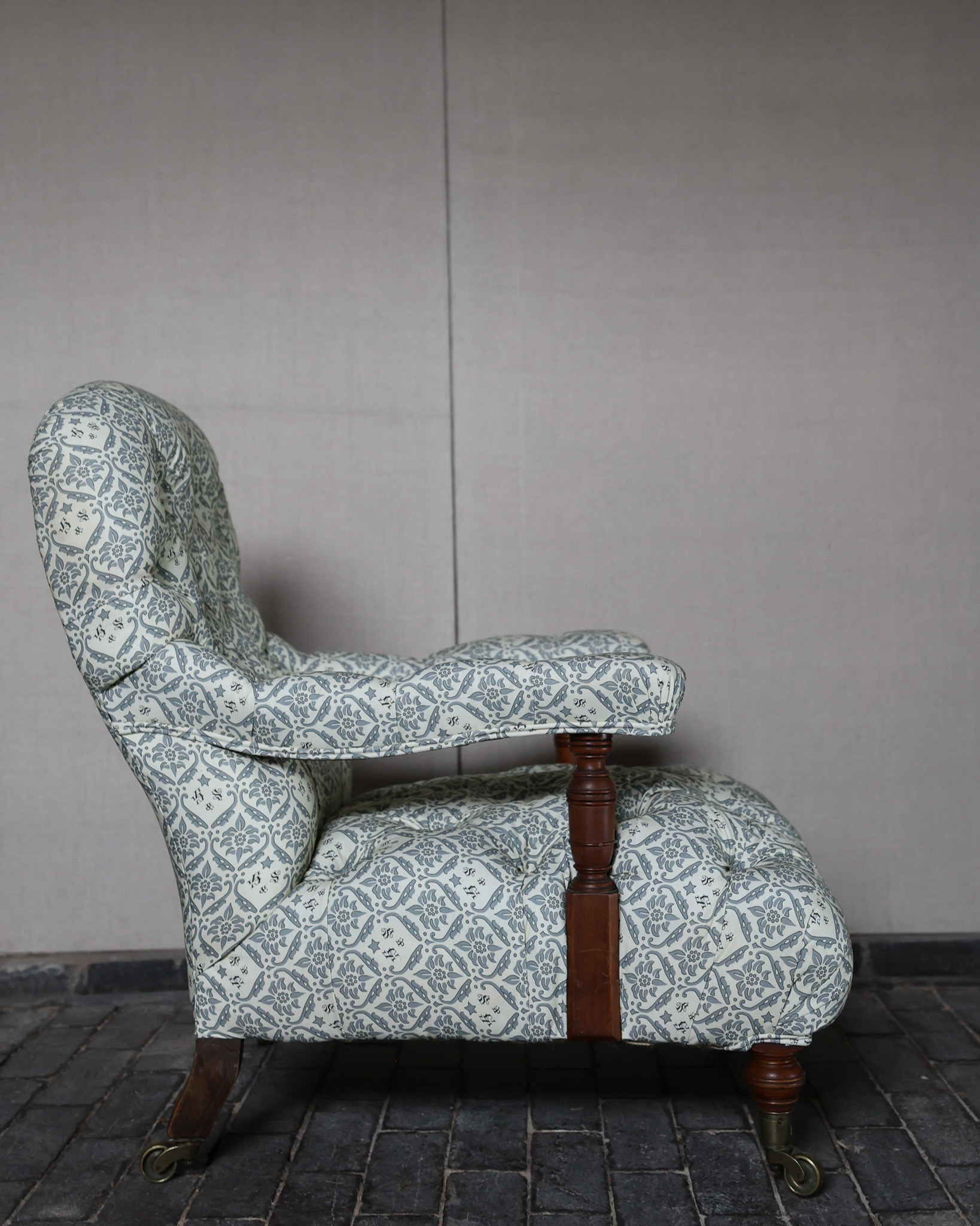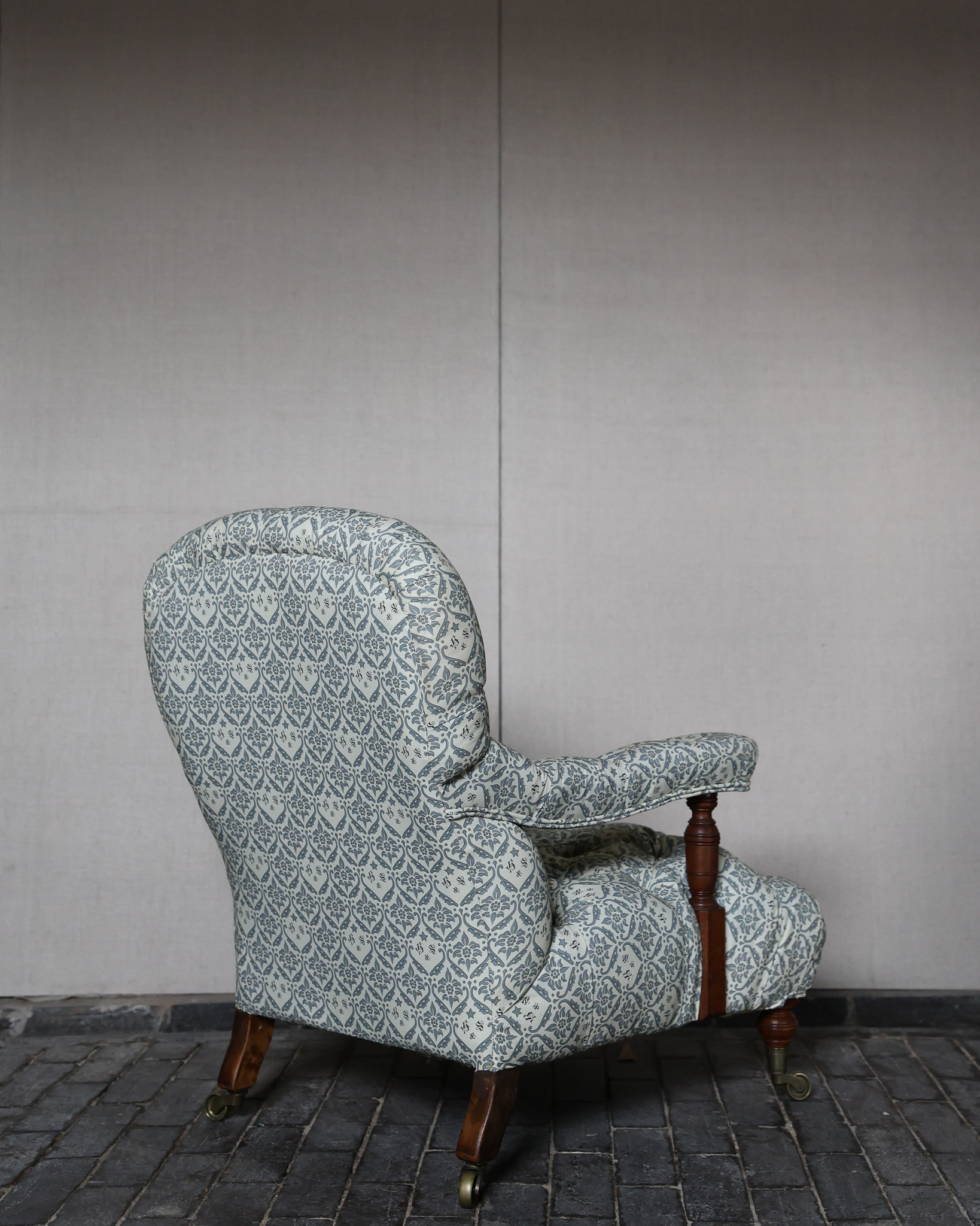 Howard & Sons walnut open armchair on turned supports, brass caps and castors. Copes castors and double serial number to back leg. Newly covered in to H&S ticking. £2900.