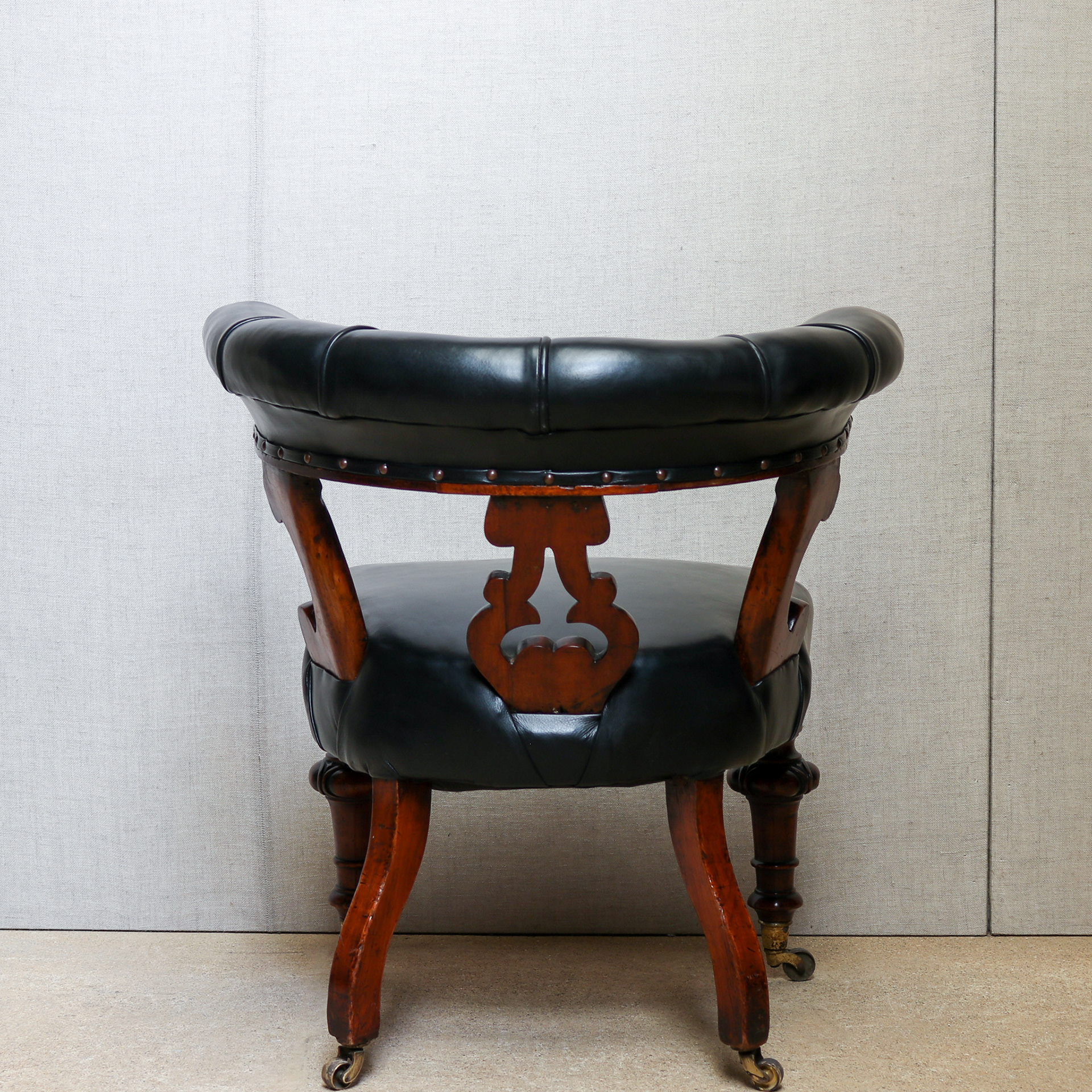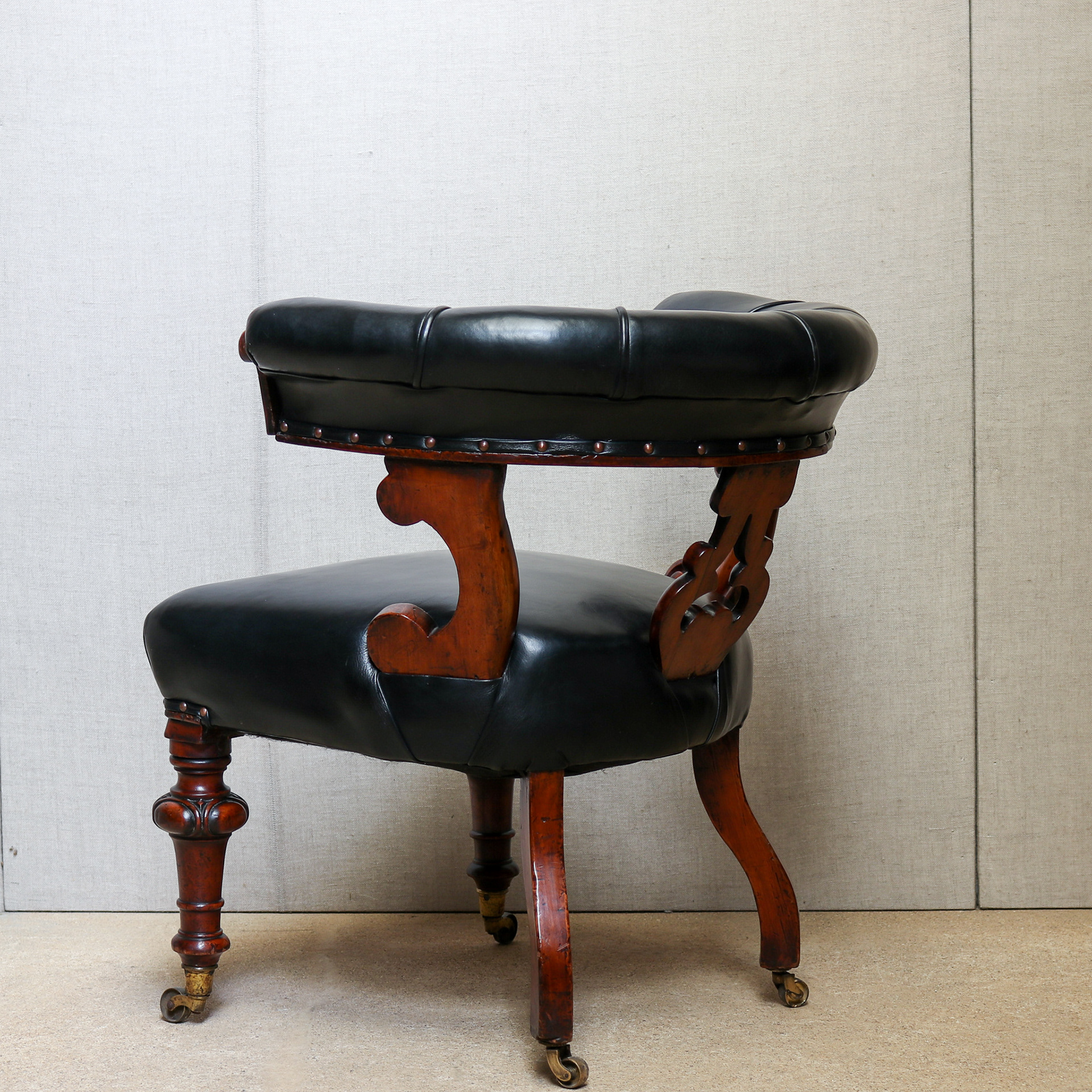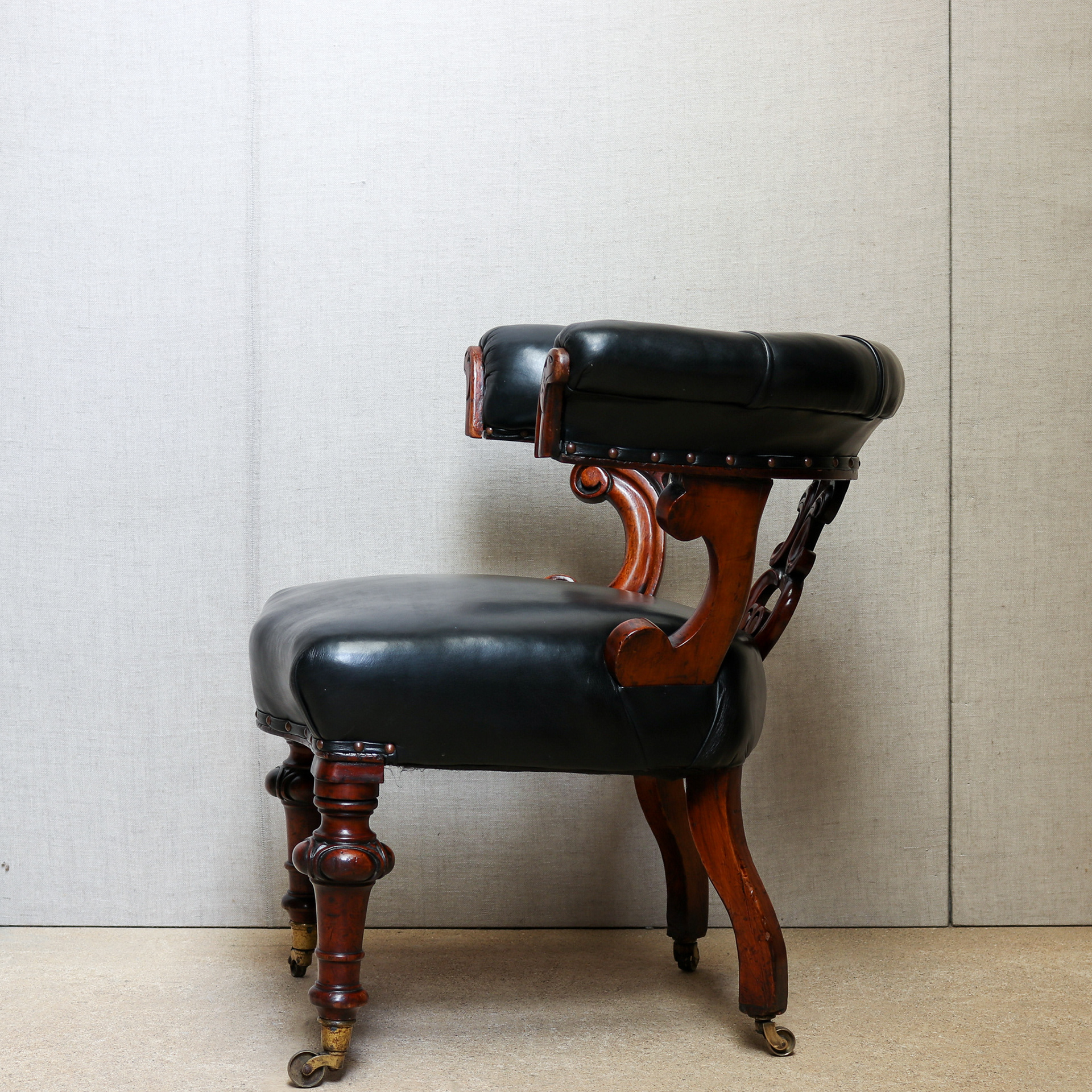 Desk chair upholstered to black leather, sprung seat, mahogany carved show-wood finishing on turned legs and brass castors. Circa 1860.