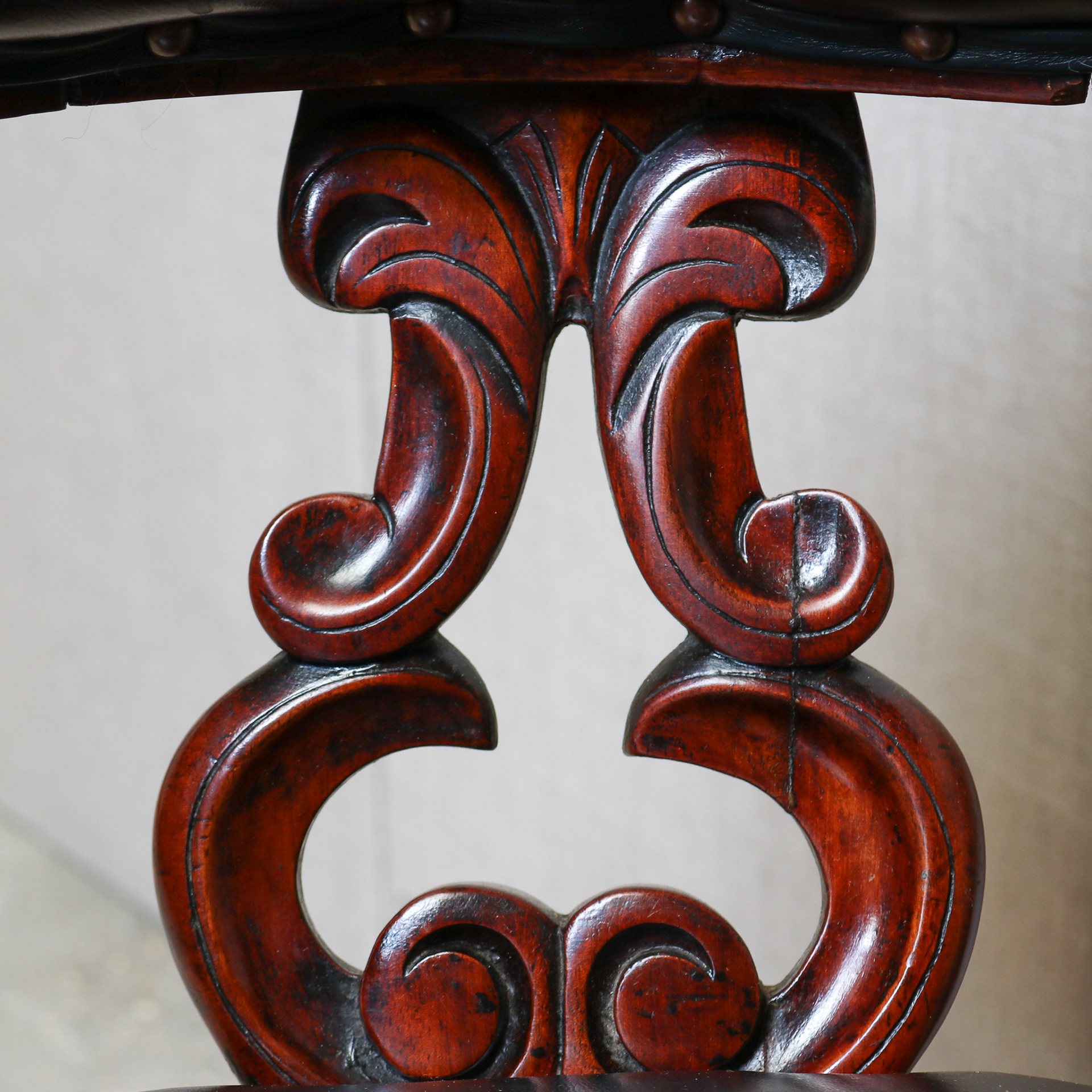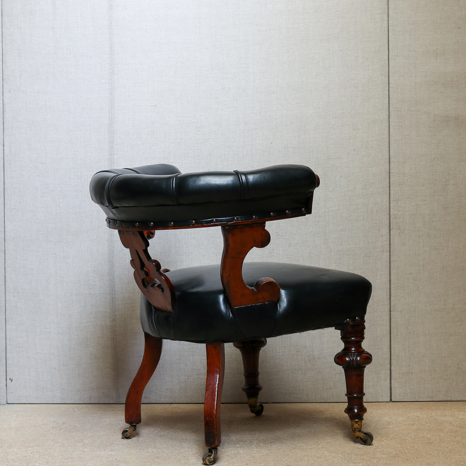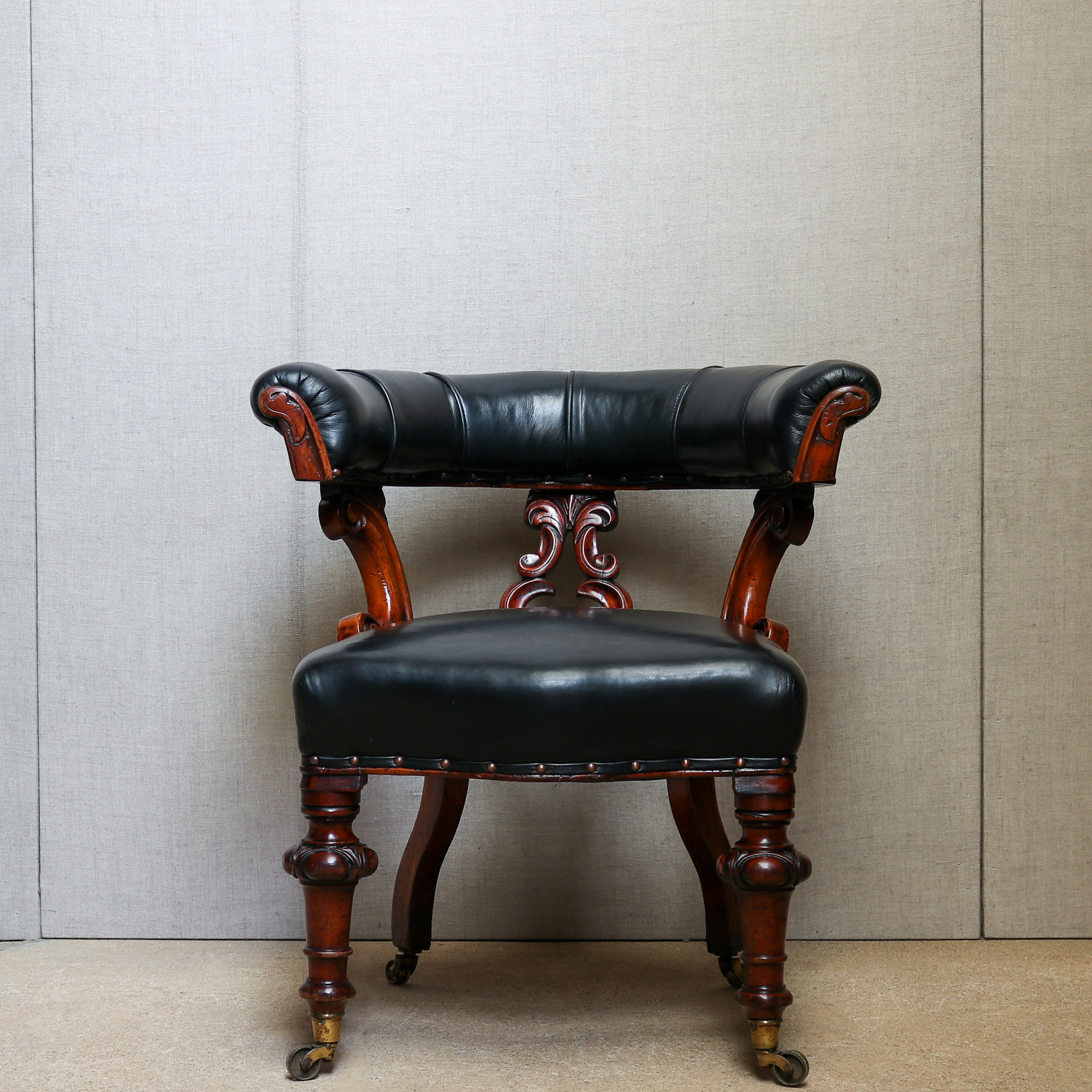 Desk chair upholstered to black leather, sprung seat, mahogany carved show-wood finishing on turned legs and brass castors. Circa 1860.