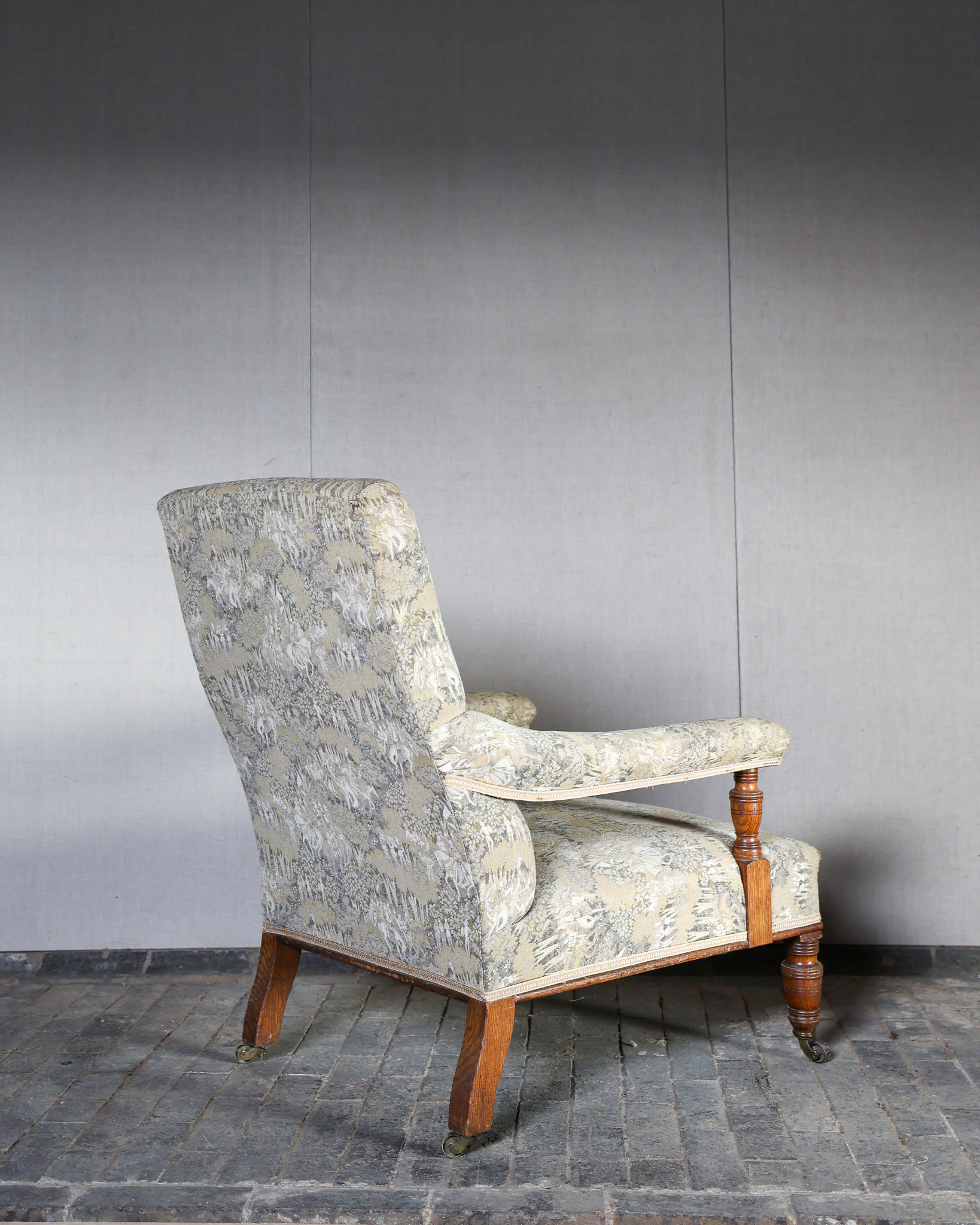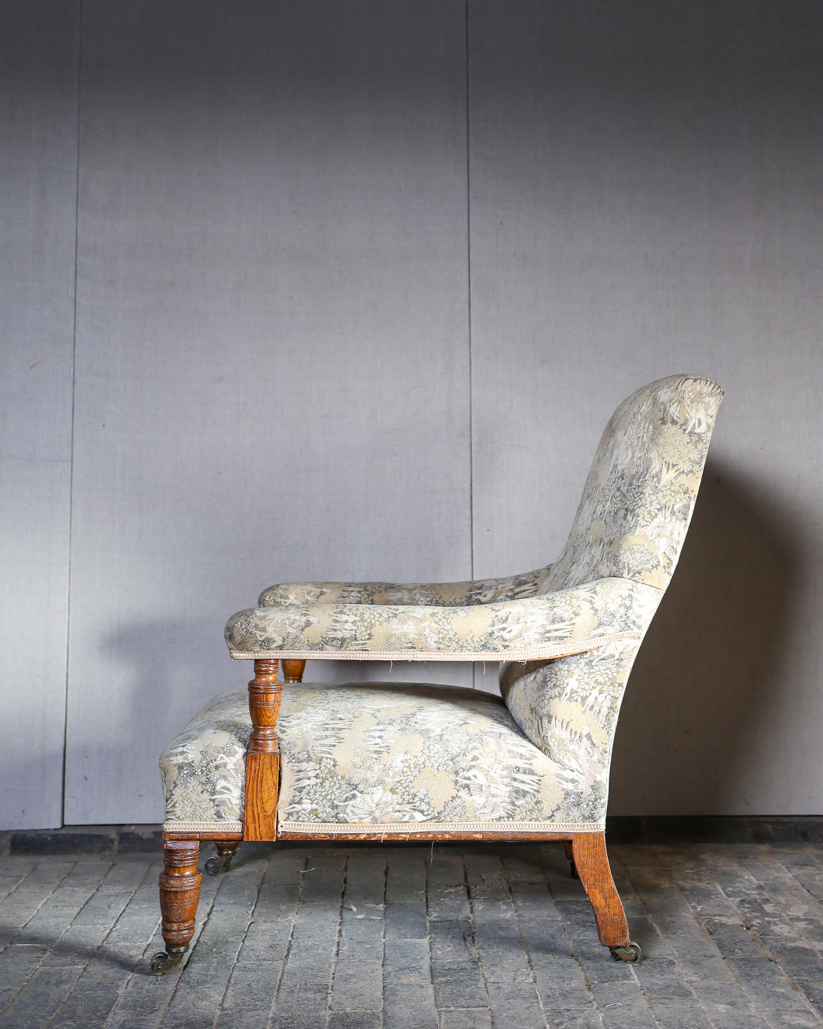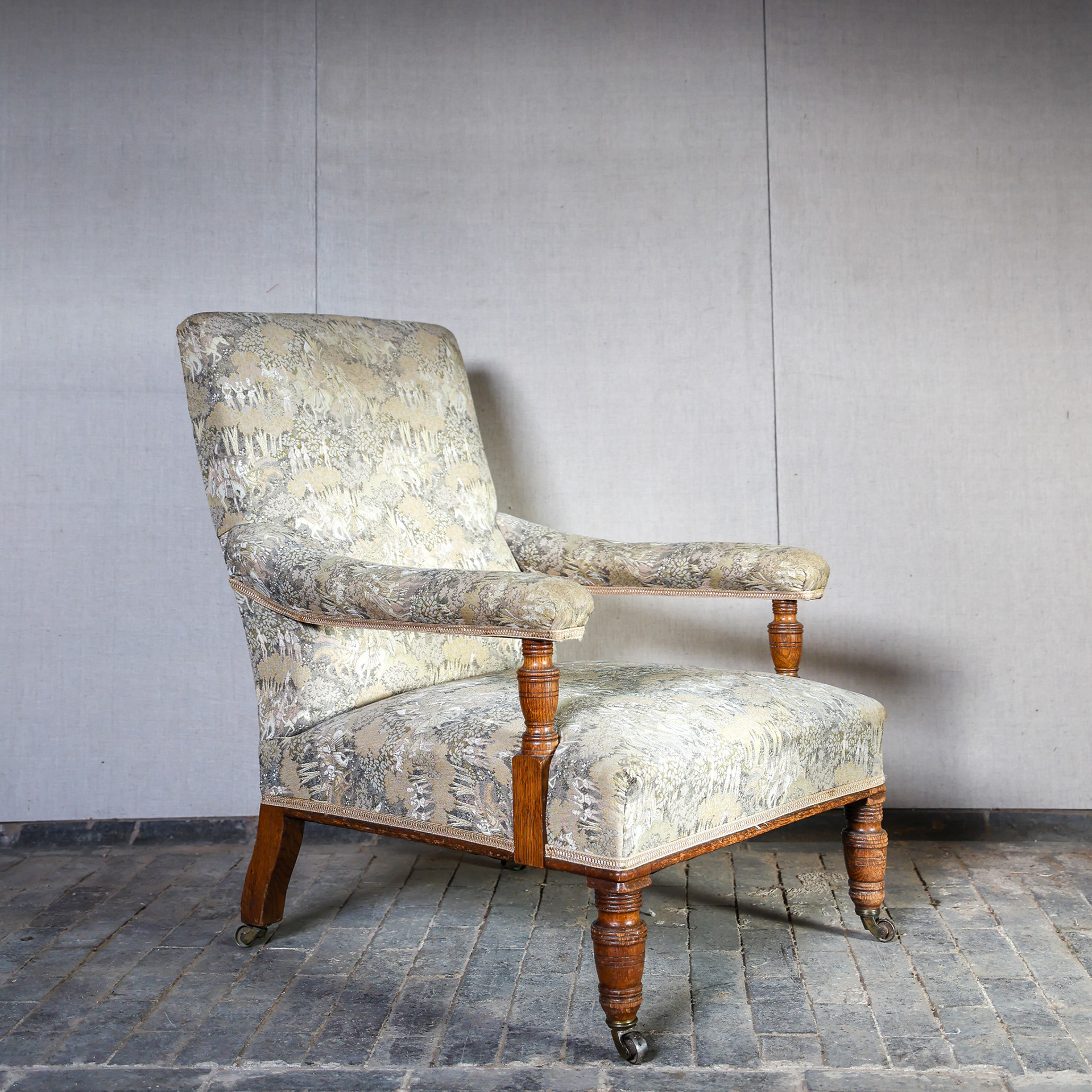 Late 19th century oak open-armchair by John Reid & Son's of Park Row, Leeds, Yorkshire. Available as is or with re-upholstery.