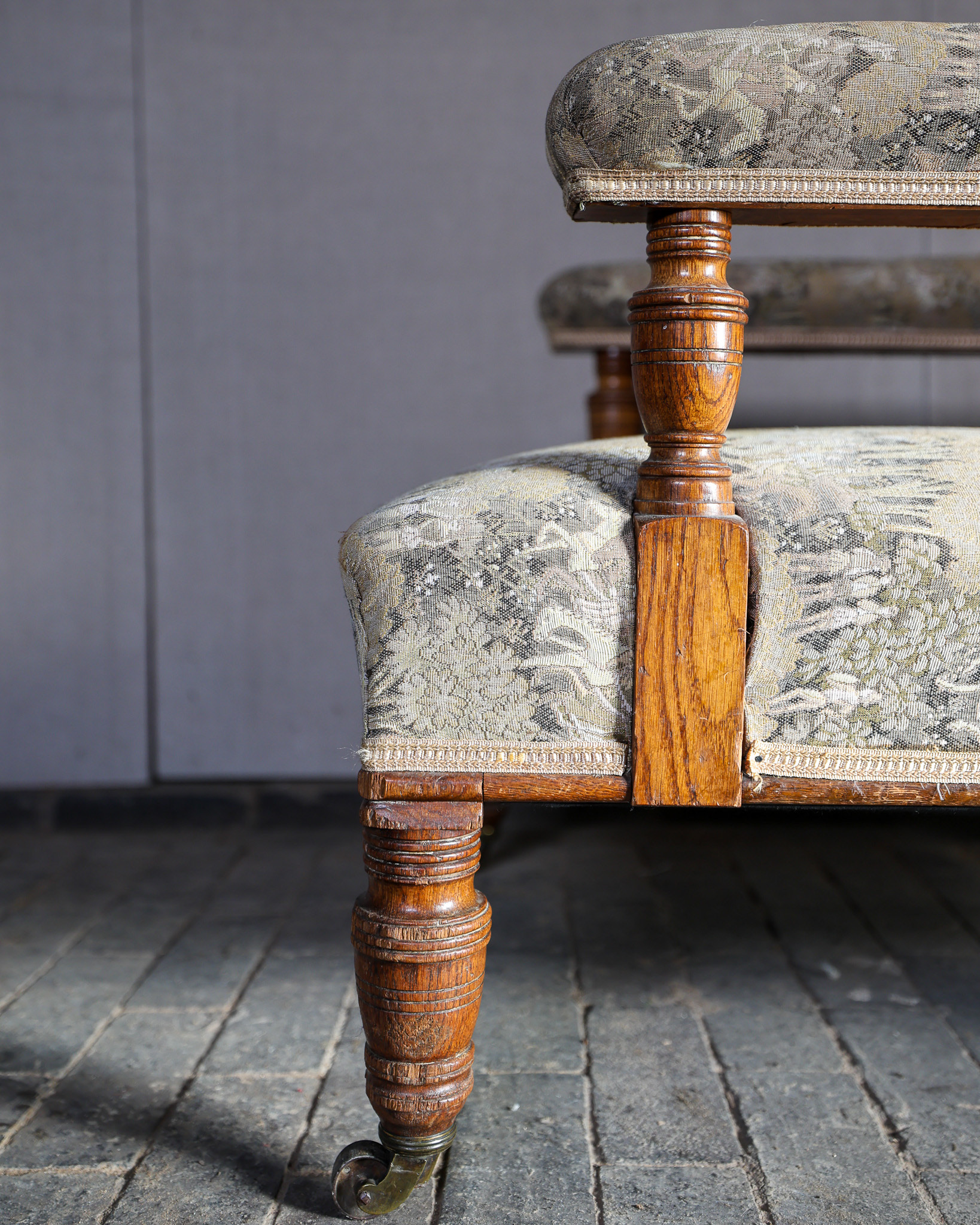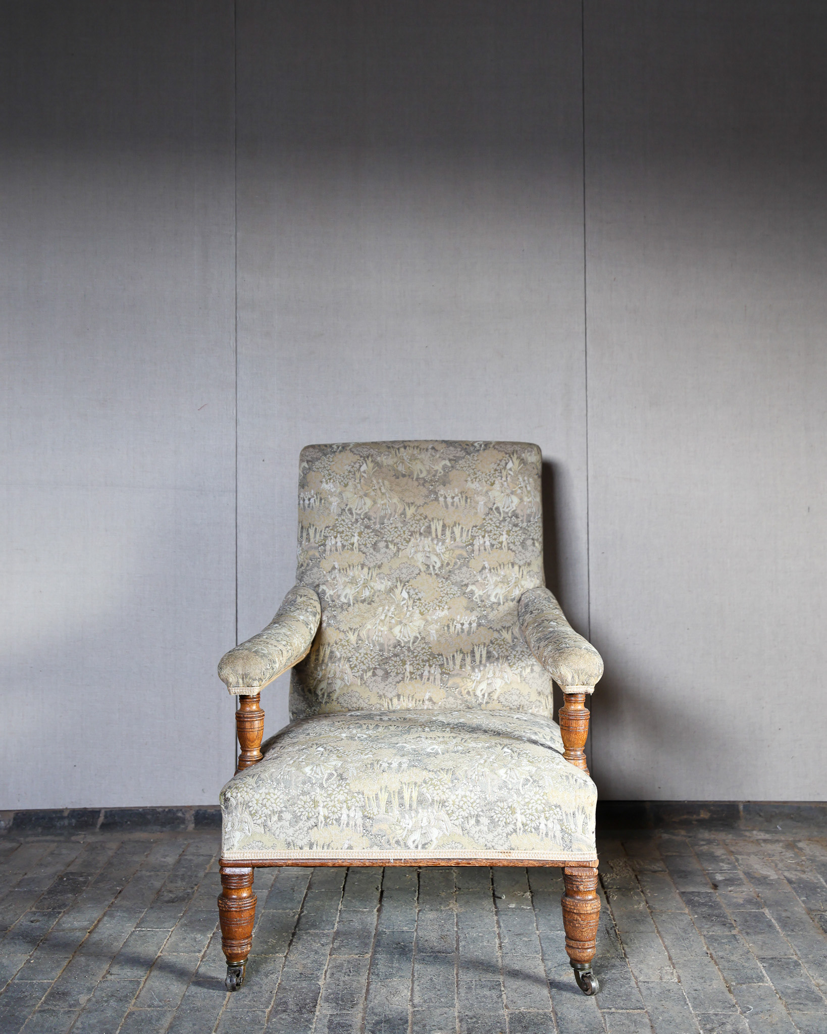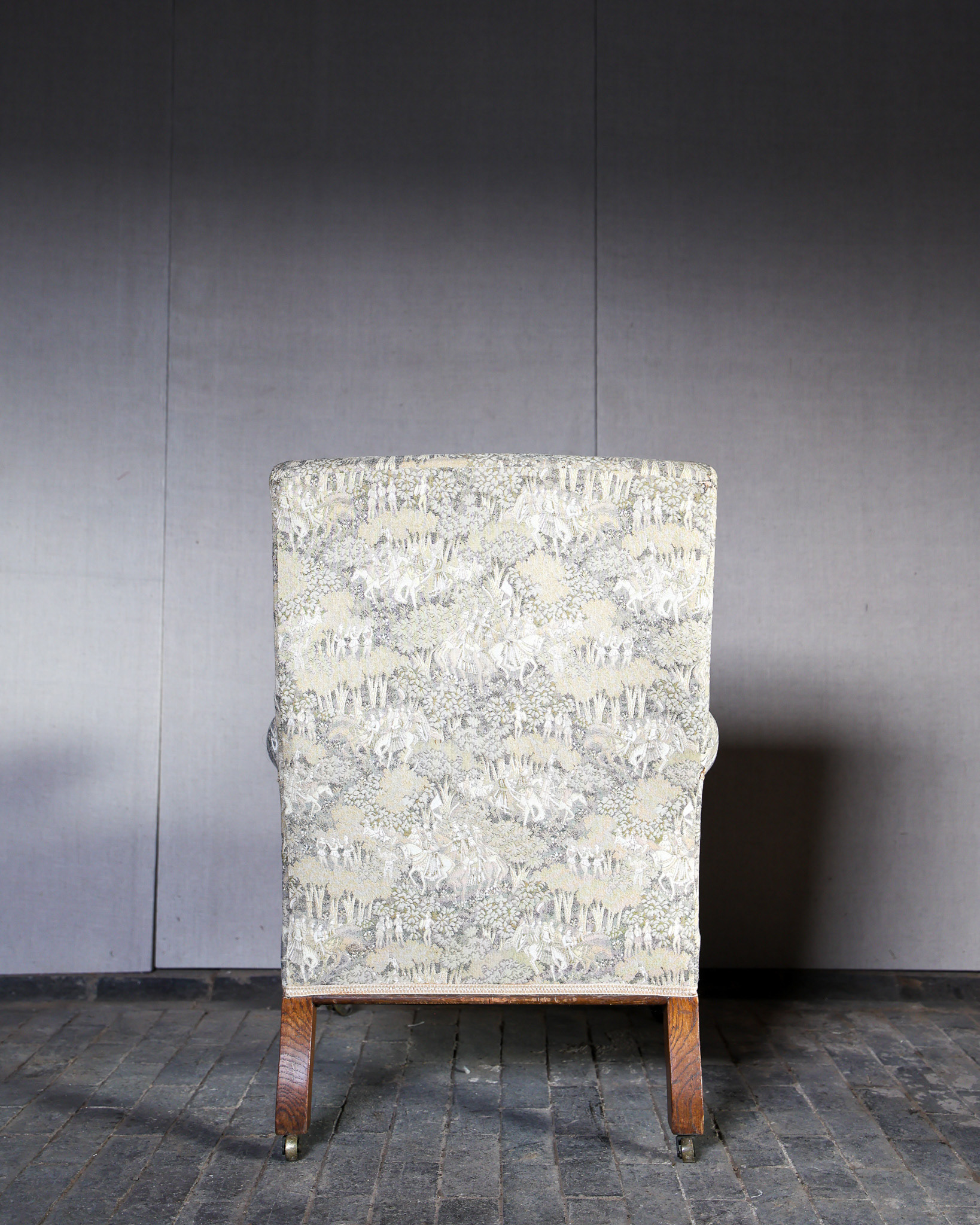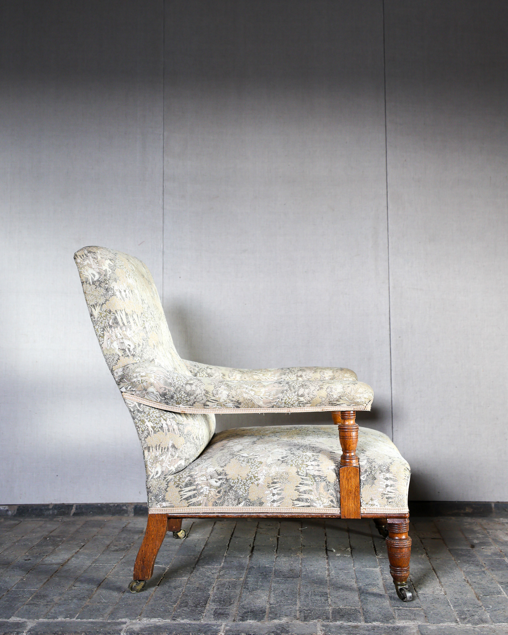 Late 19th century oak open-armchair by John Reid & Son's of Park Row, Leeds, Yorkshire. Available as is or with re-upholstery.