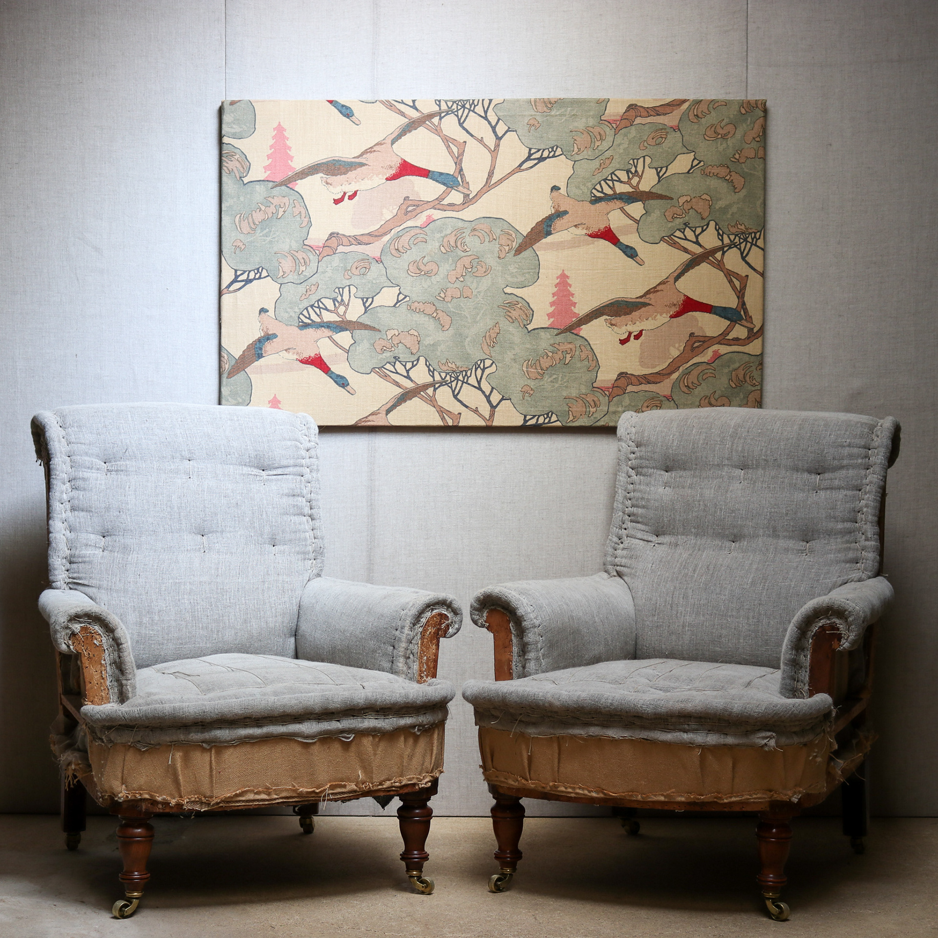 Pair of 19th century club chairs traditionally reupholstered for optimum comfort using copper coated coil springs on the seat and back and re-carded maid and tail horsehair to form seat back and arms. Moulding to form a comfortable seat. All springs and edges are tied and stitched by hand. Terminating on English walnut legs with brass castors. Can be upholstered to fabric or leather of choice. Deep-buttoned or plain.