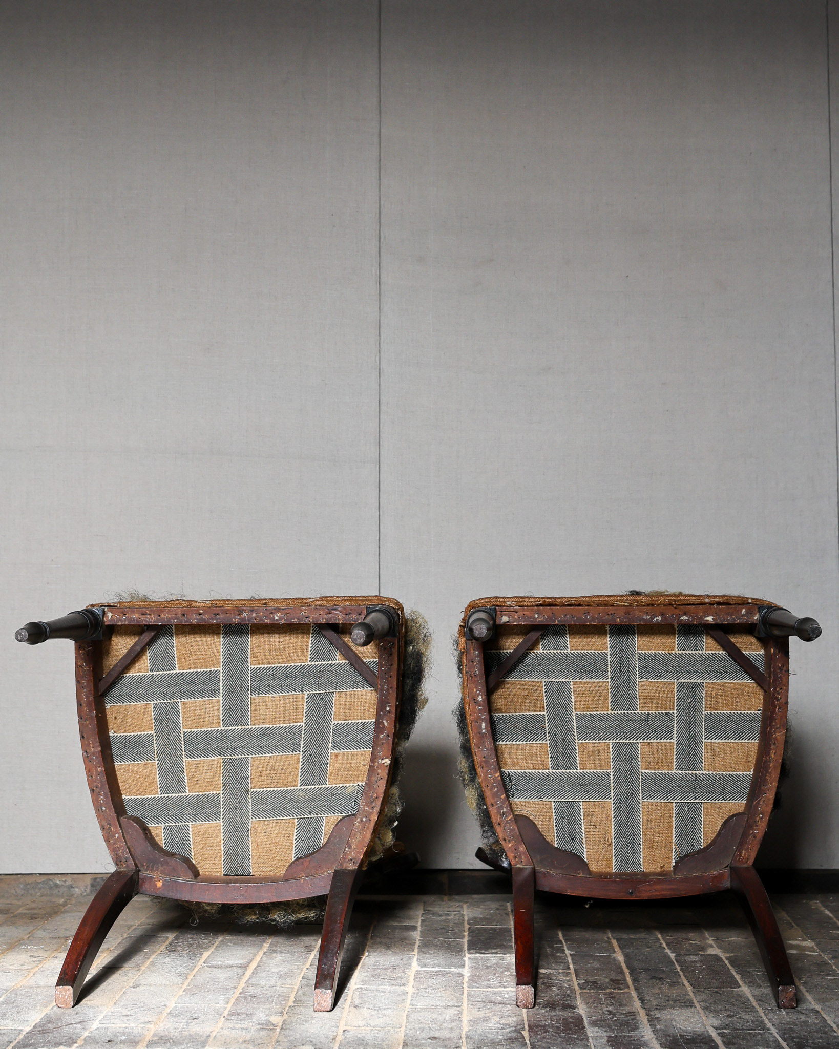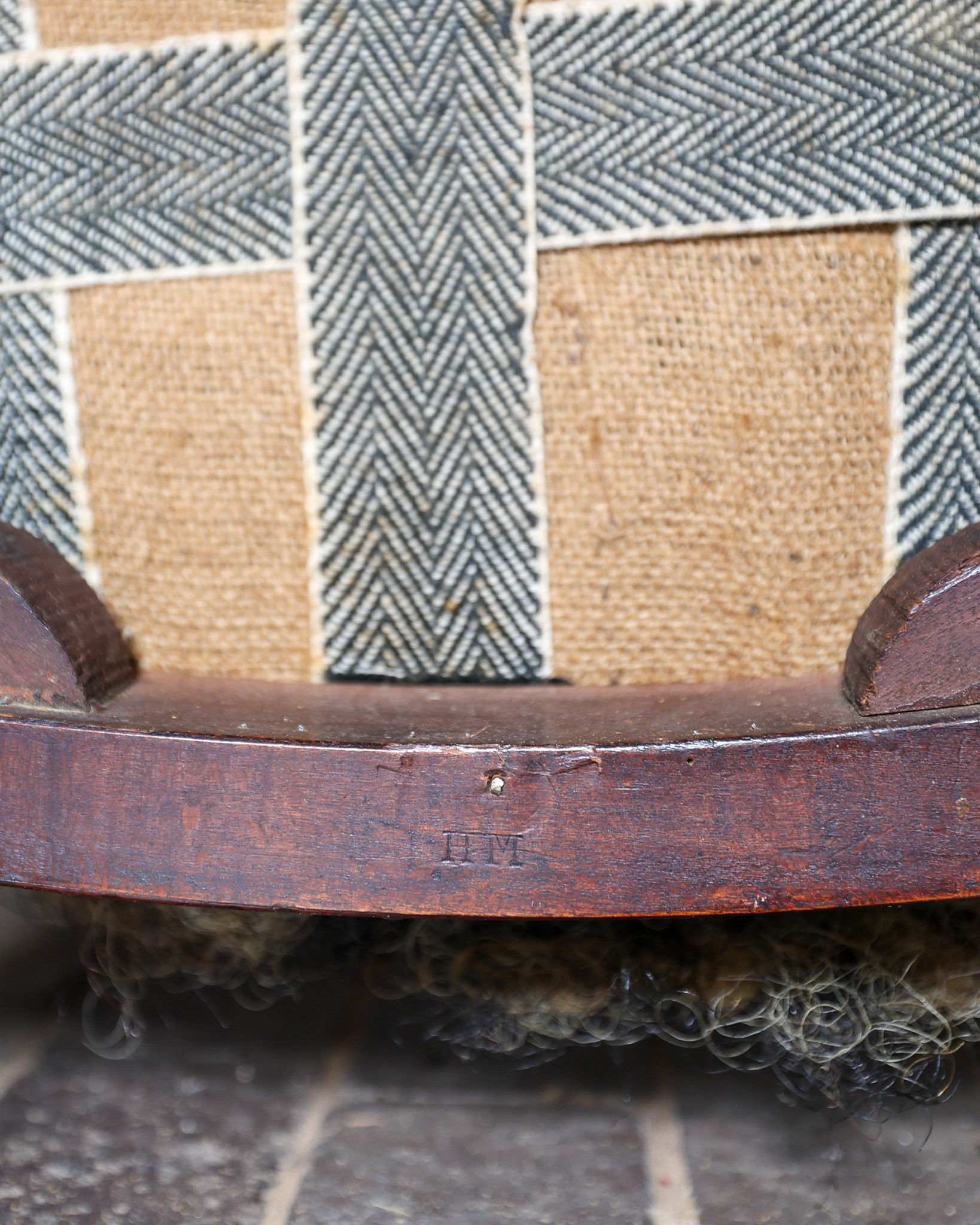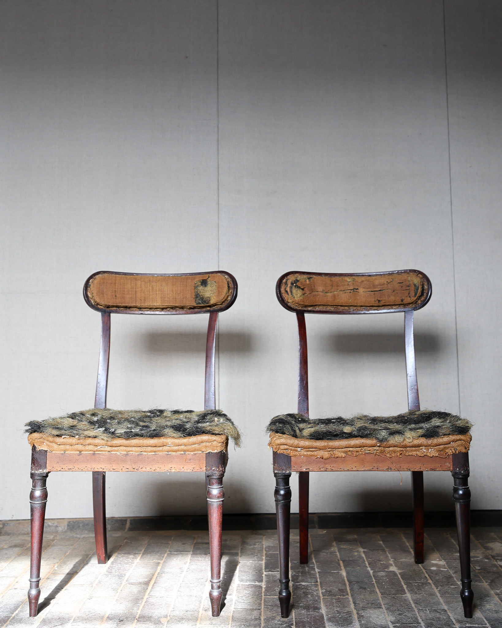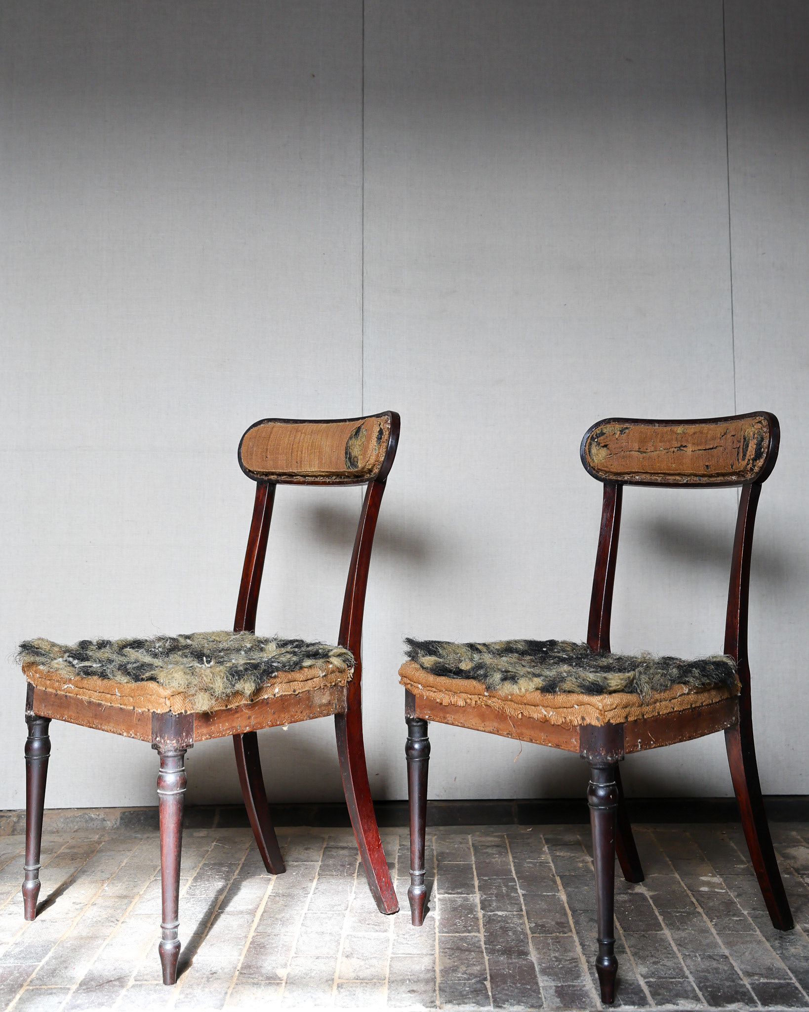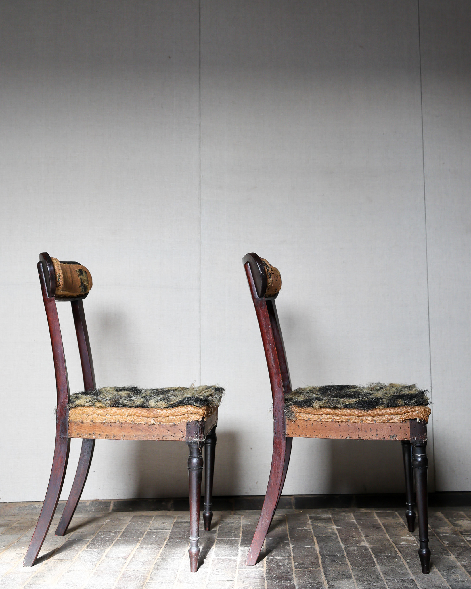 Pair of mahogany chairs with padded backs on turned legs. Journeyman's initials stamped under seat rail H M. Circa 1800.