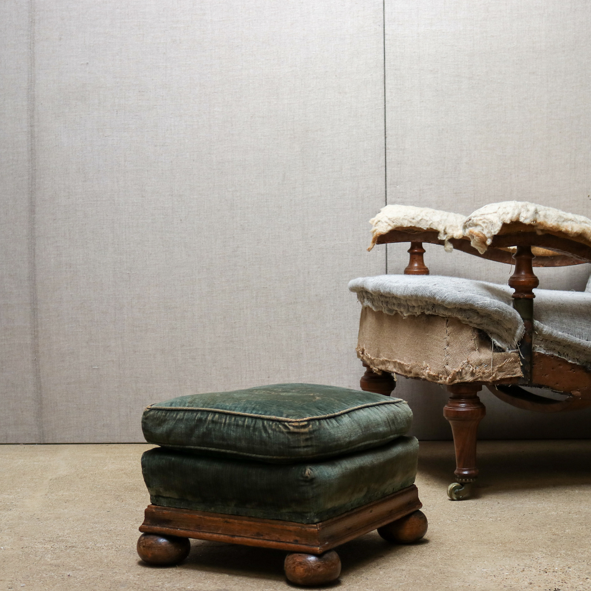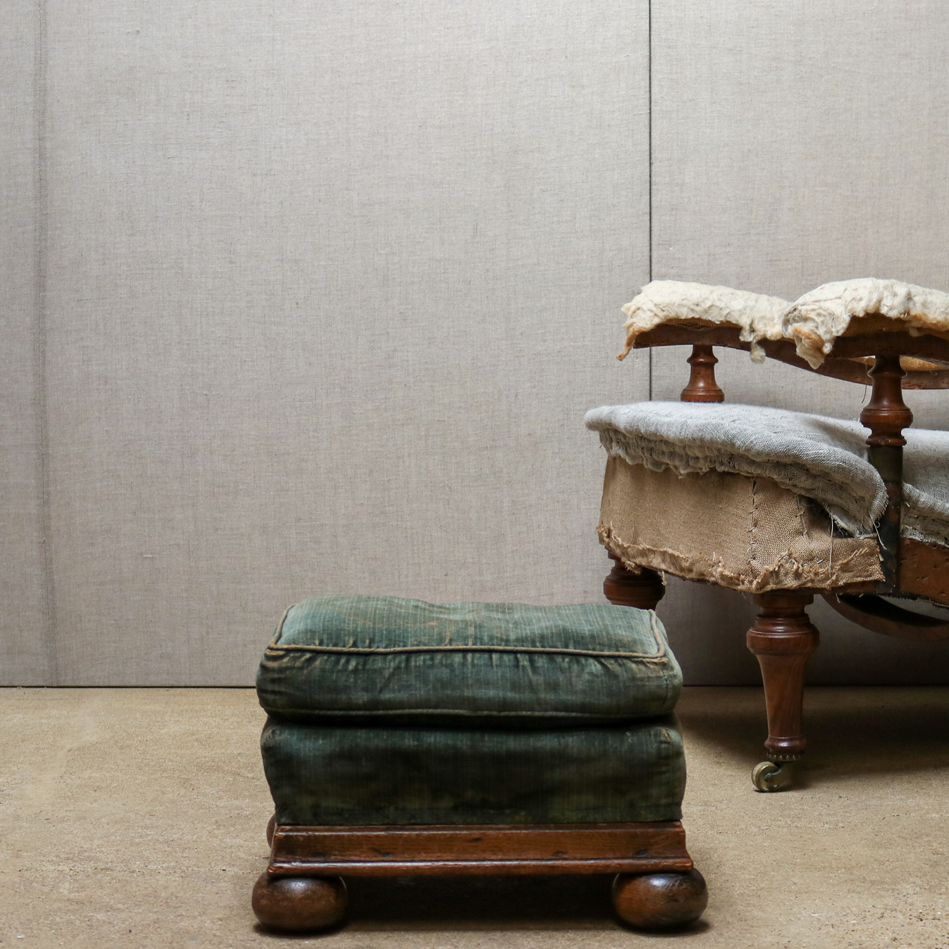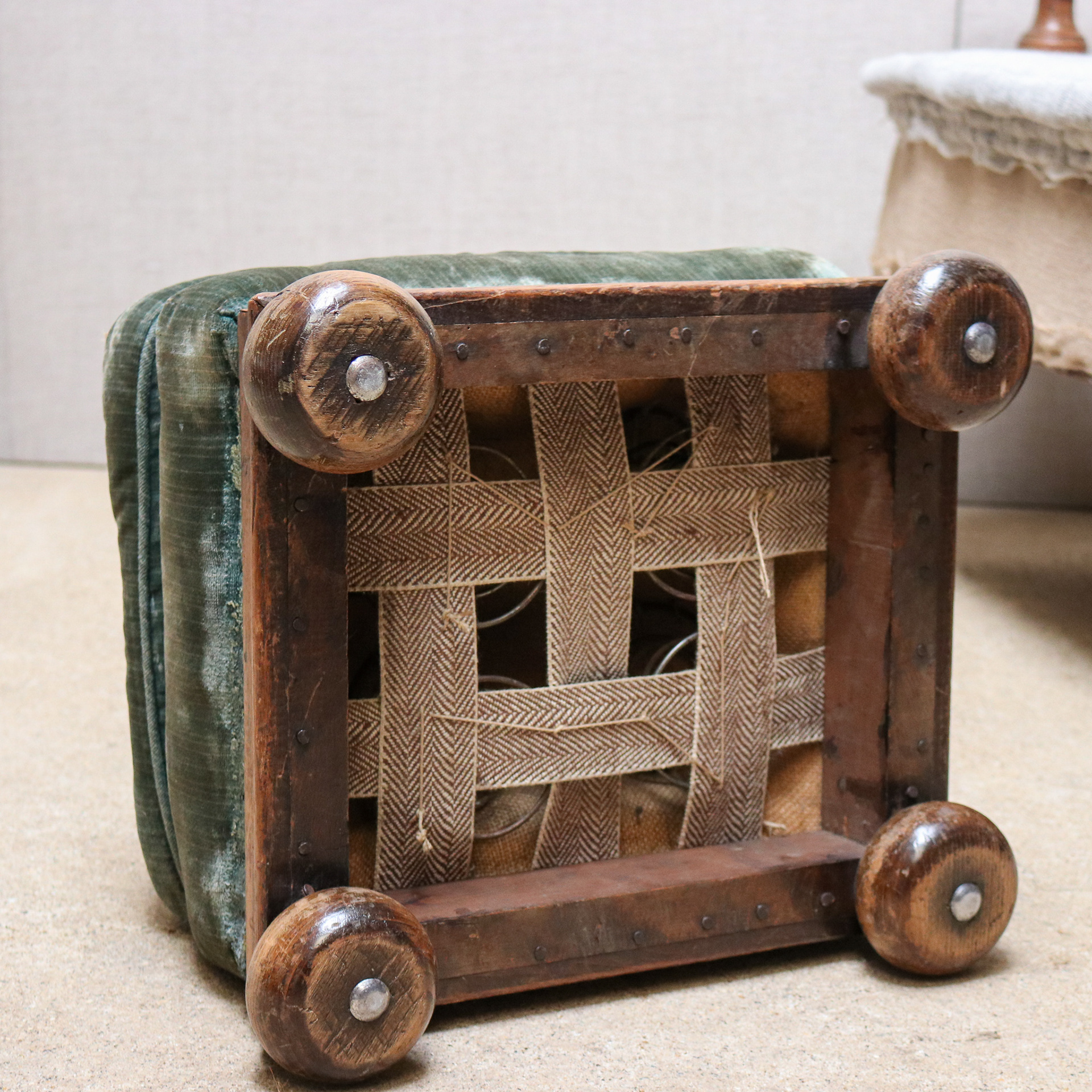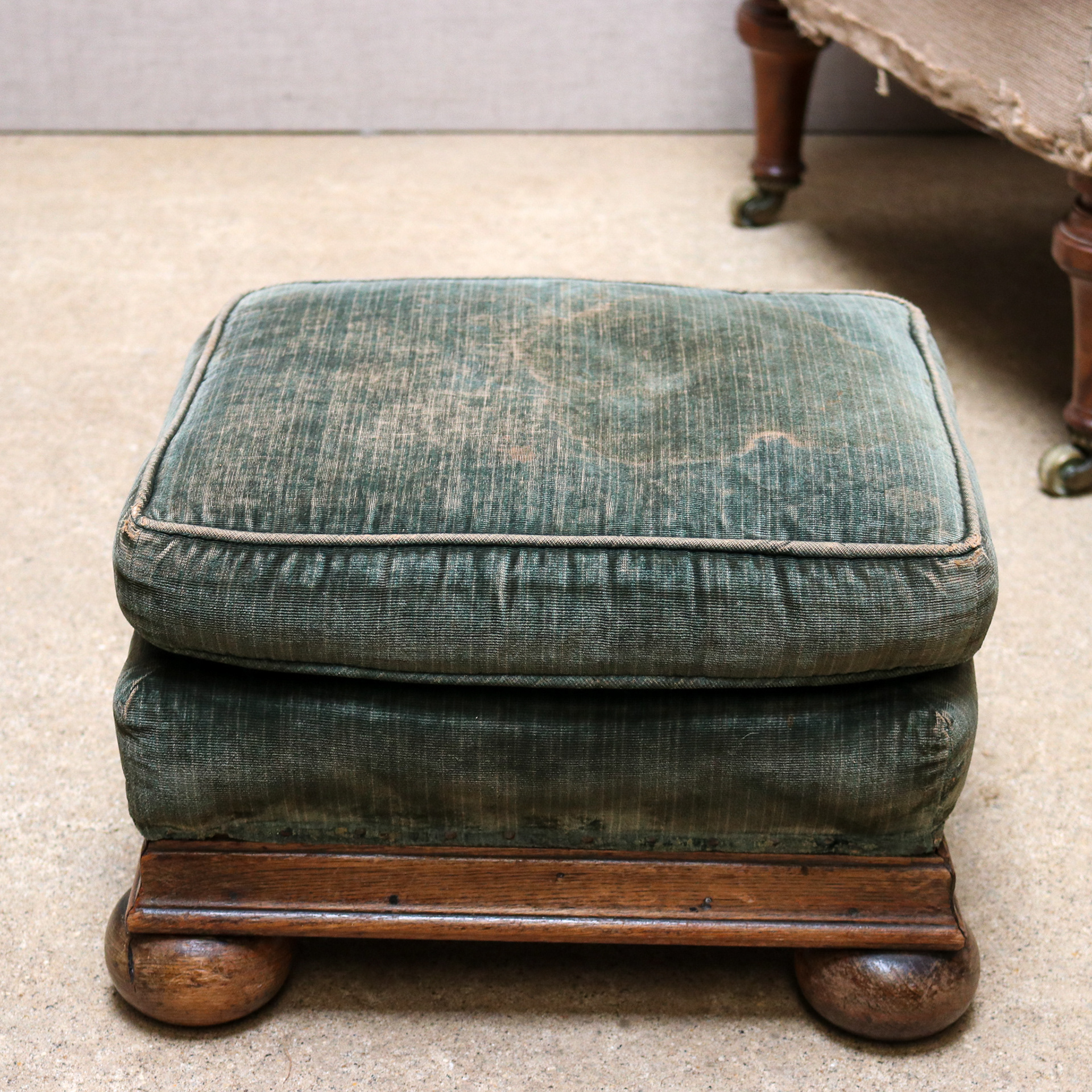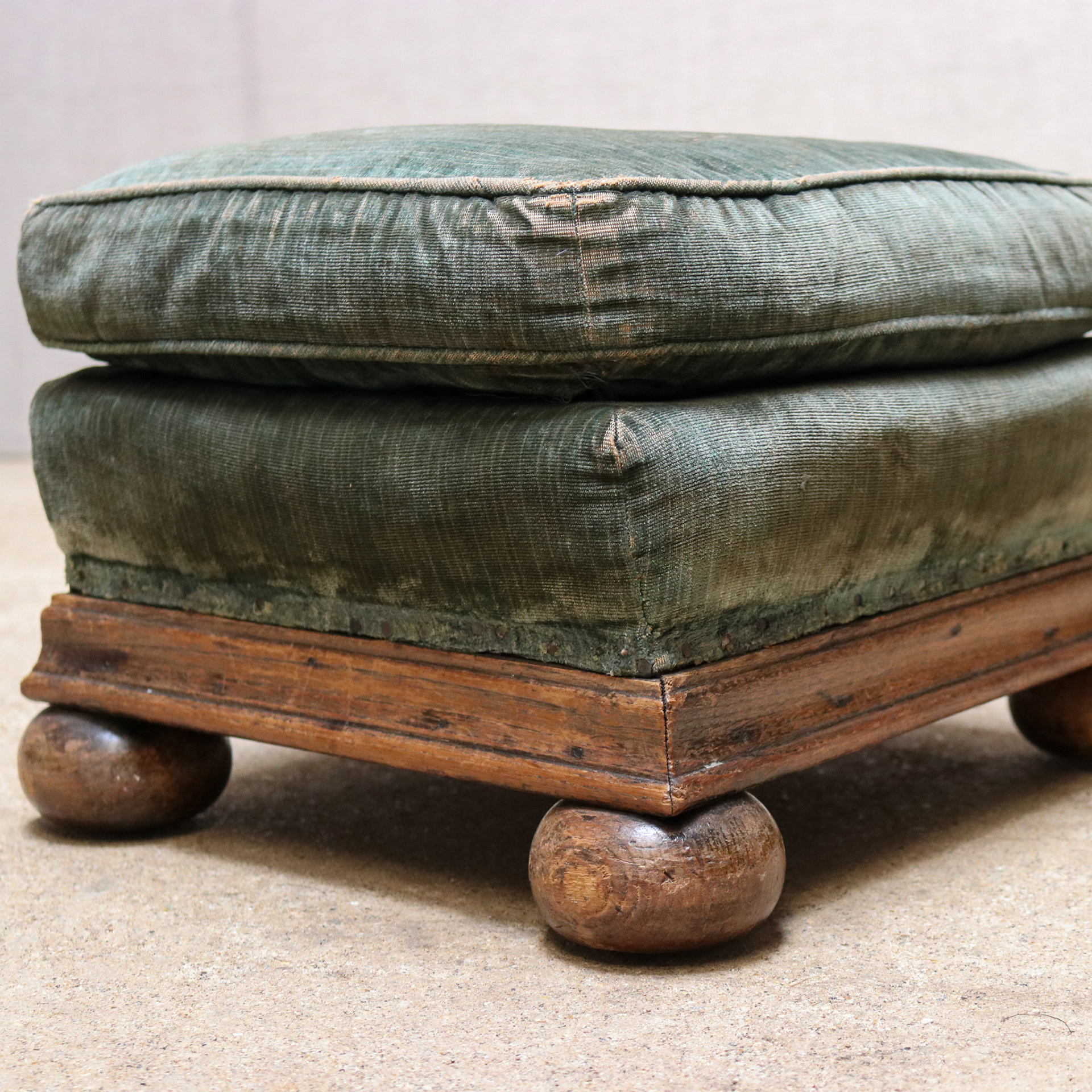 A small oak framed sprung footstool sitting on bun feet with down pillow top. Original upholstery early 20th century. Available as is or re-upholstered.