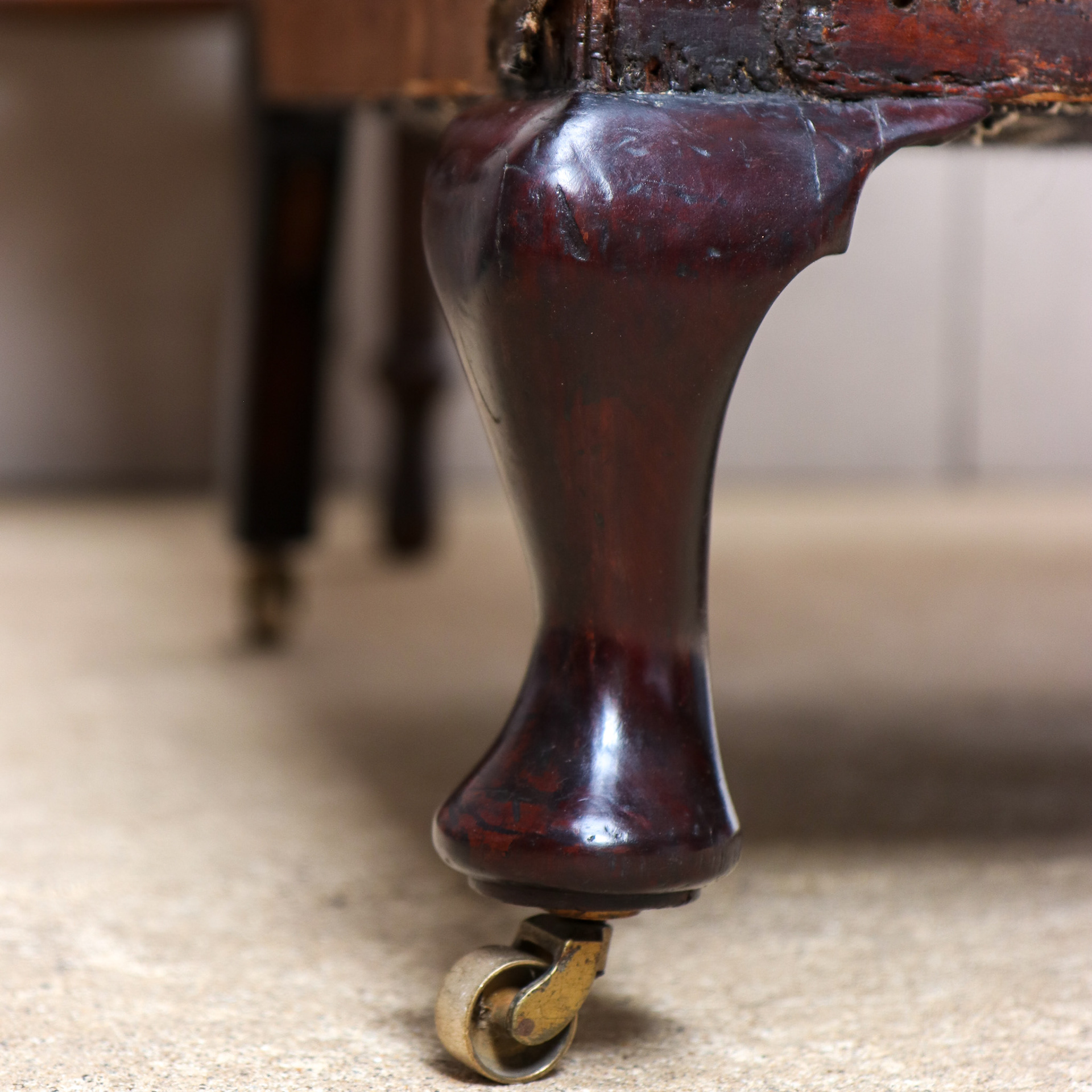 Wingback armchair by Robertson & Colman of Norwich on mahogany cabriole legs and brass castors. Early 20th century; circa 1920. Upholstered to scrim and ticking with hand-sprung horsehair seat topped with a feather and down cushion. Ready for covering in fabric or leather. Requires 6 meters of fabric.